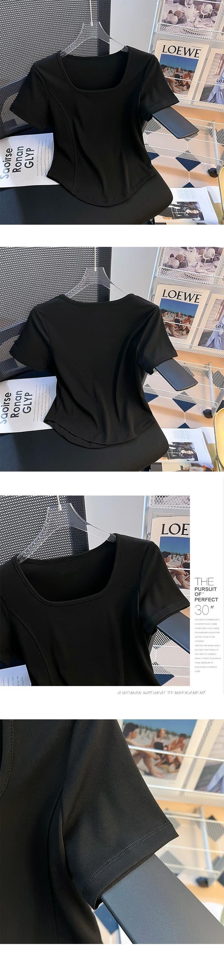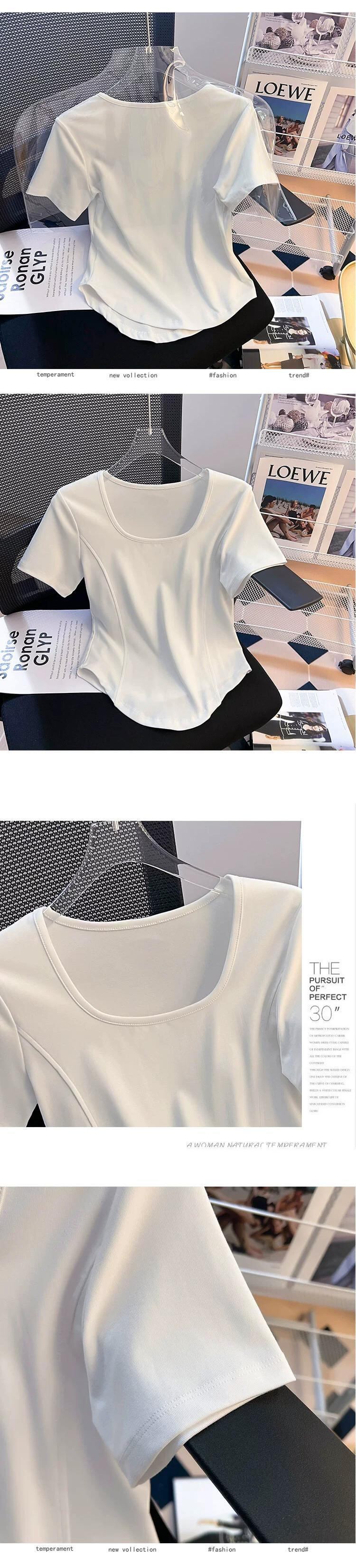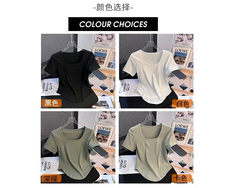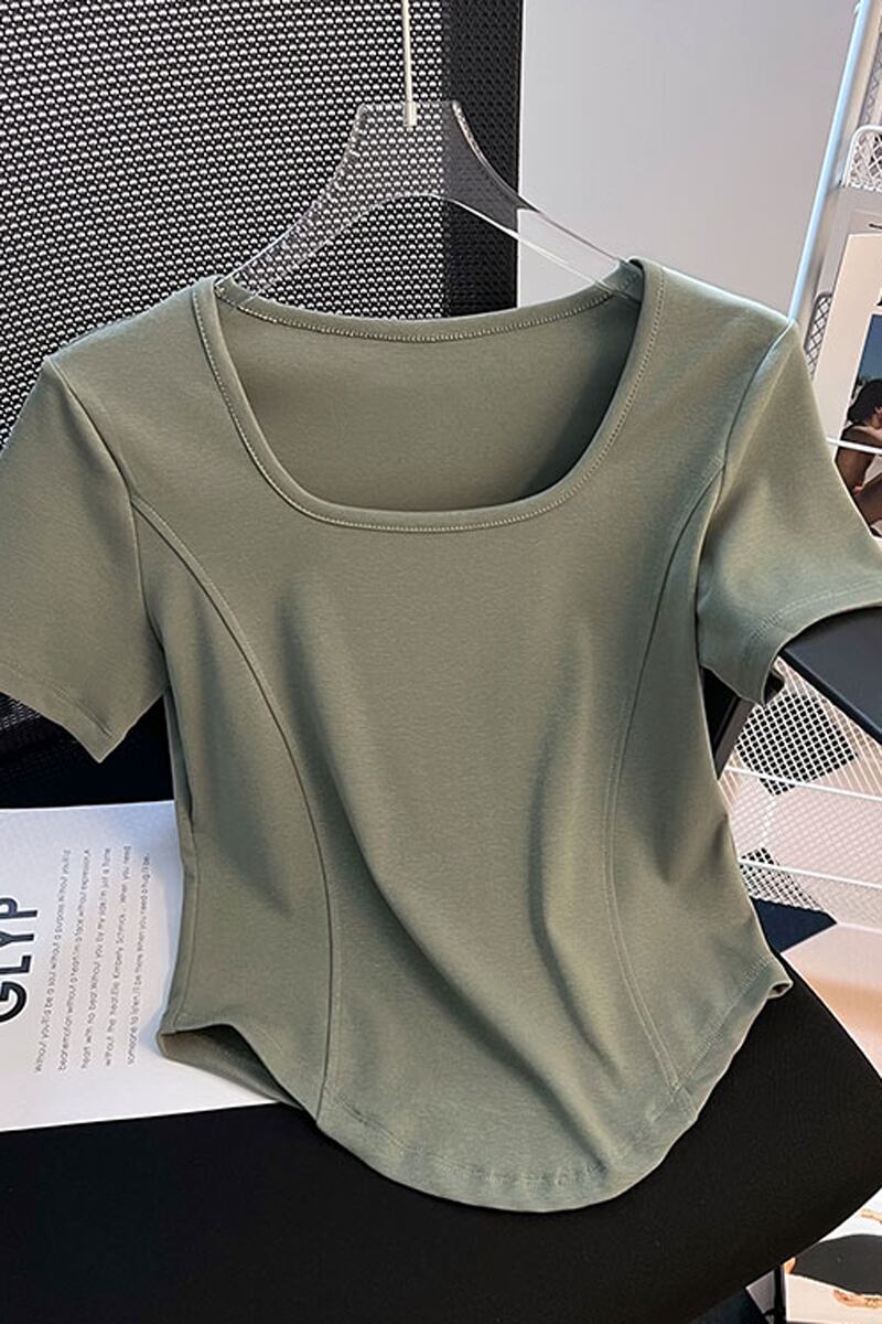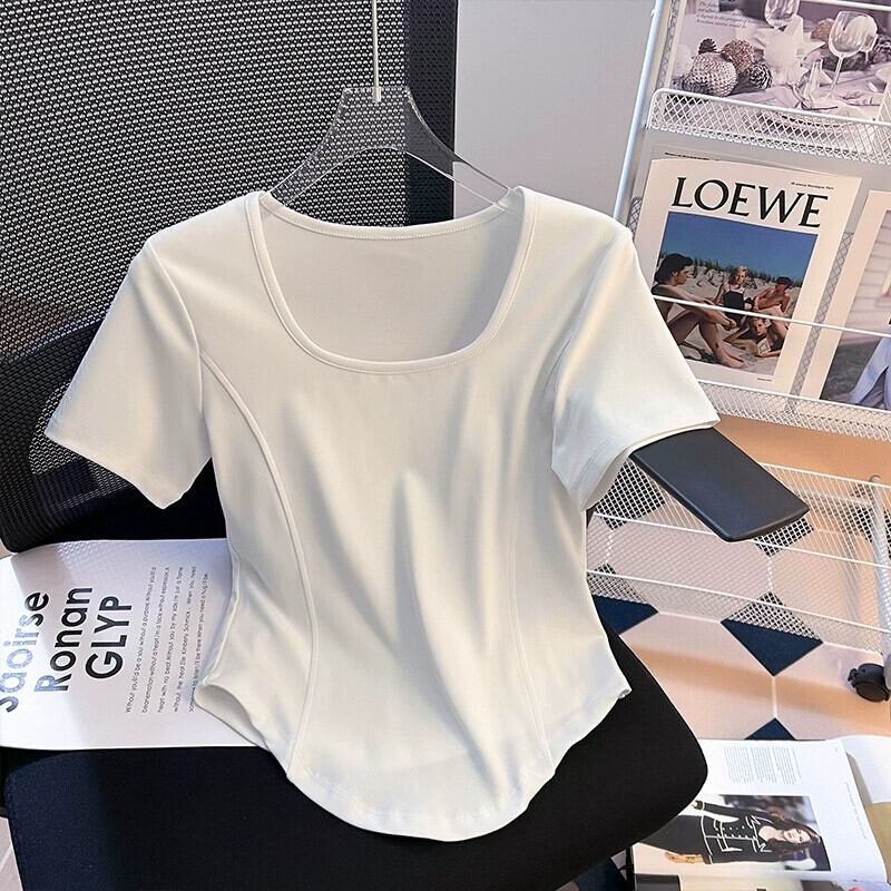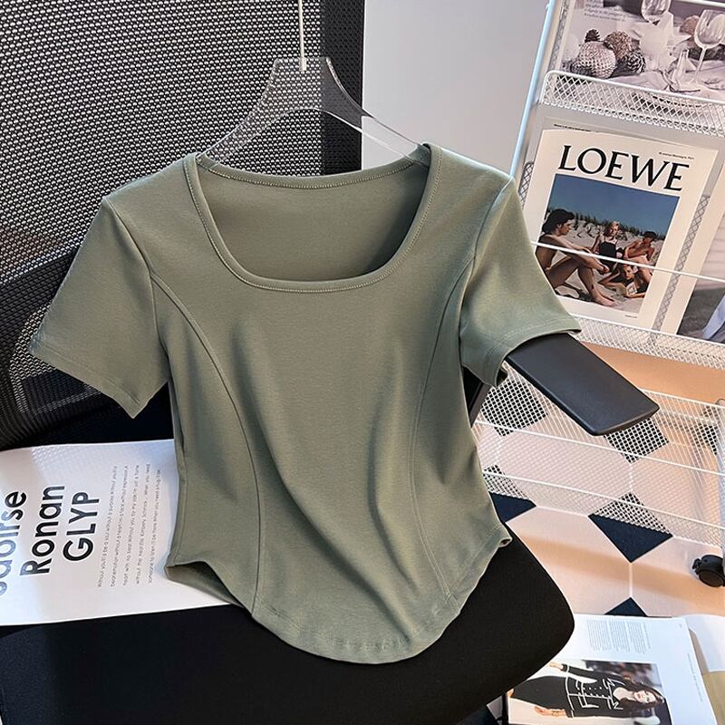 フロントショルダーピュアコットン半袖Tシャツレディース夏シックなデザインセンススリムフィットスリムスクエアカラーカーブヘムショートトップ サマー 夏物 スクウェア 7460011484855064 | framboise21