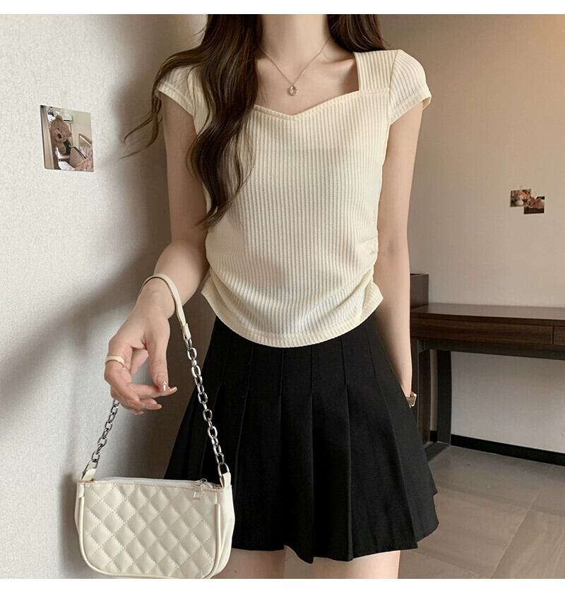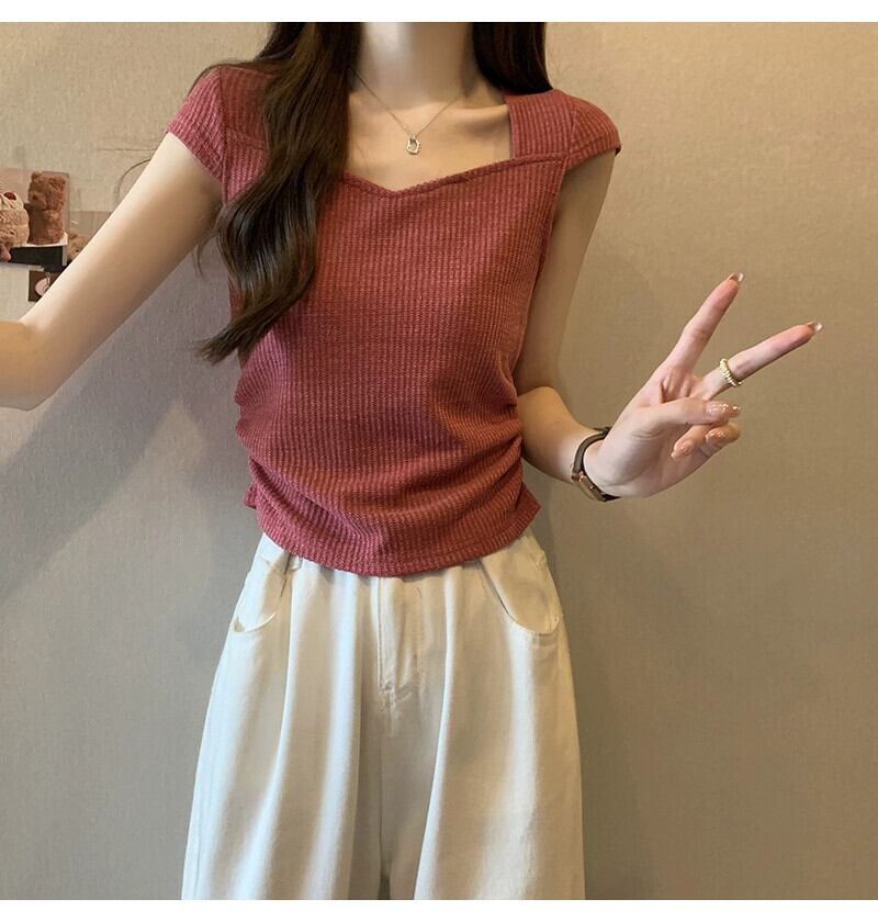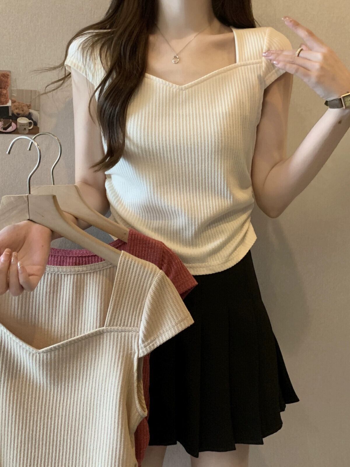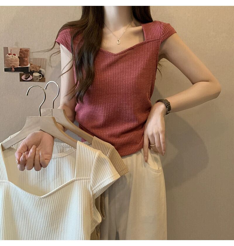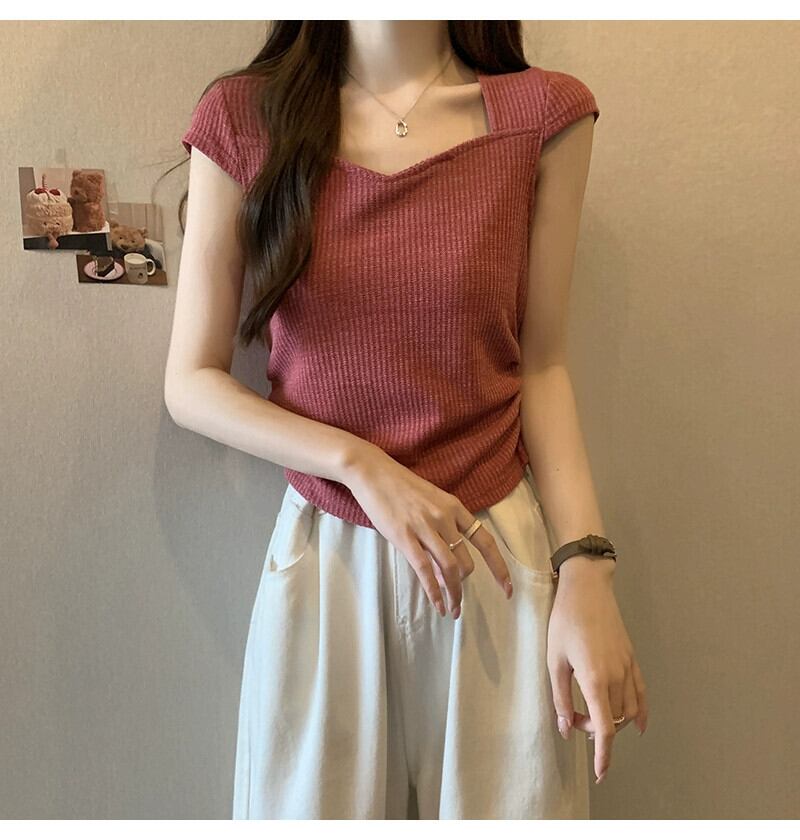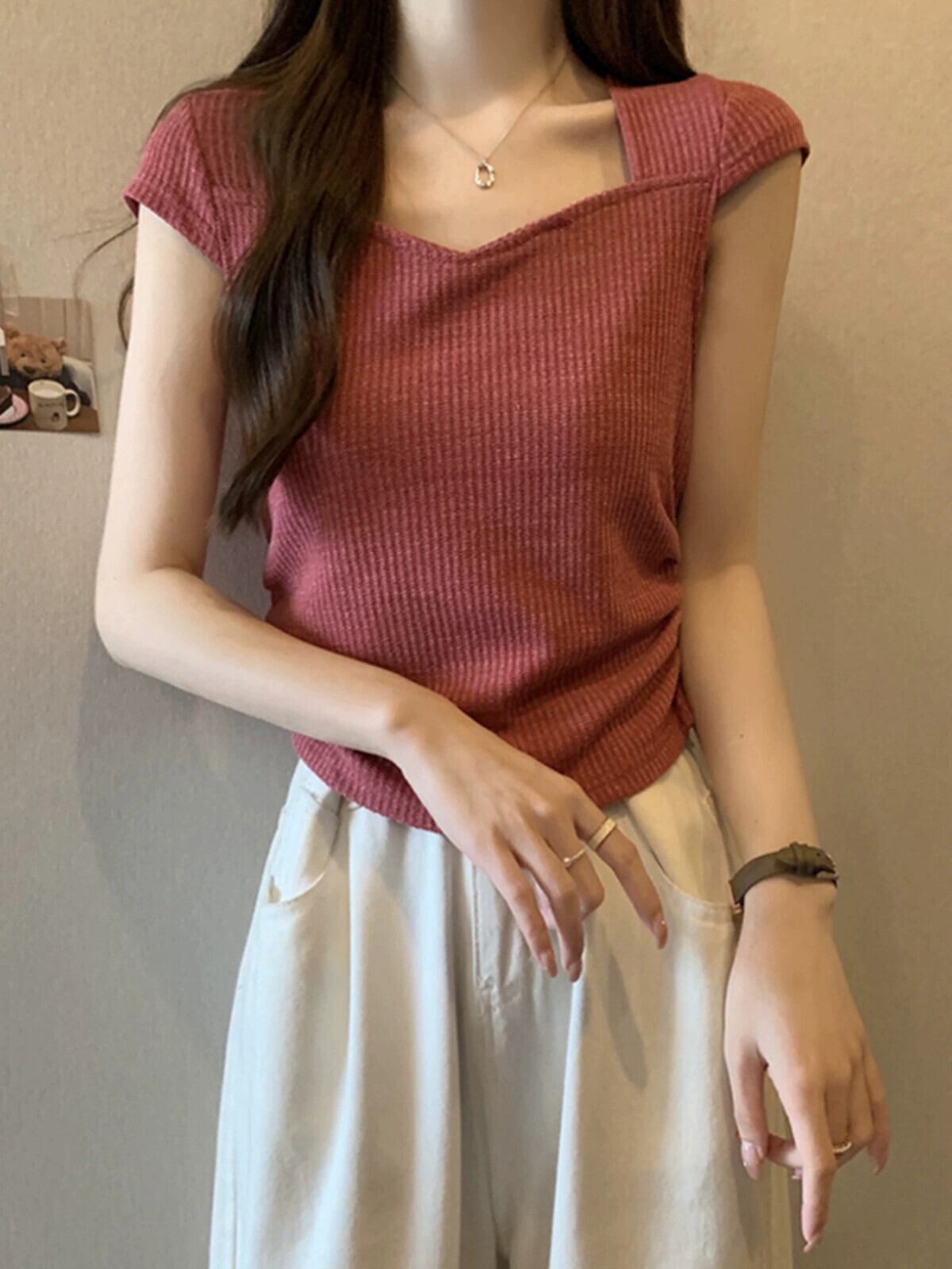 フロントショルダーアイスシルク半袖Tシャツレディース夏フレンチデザイン自己修養の感覚湾曲した短いセクション不規則なスクエアネックトップ薄い ショート サマー 夏物 スクウェア 7460023676390015 | framboise21