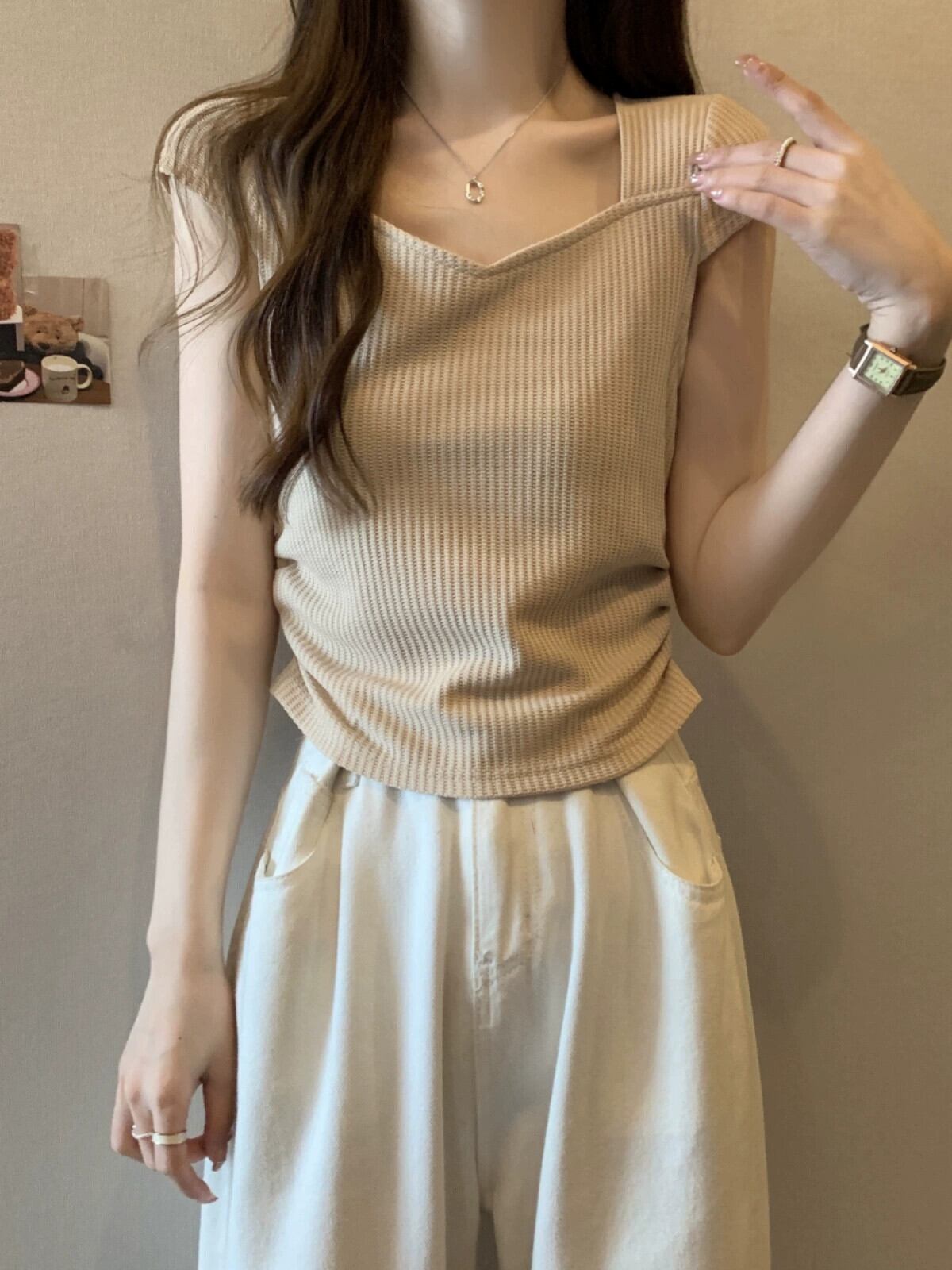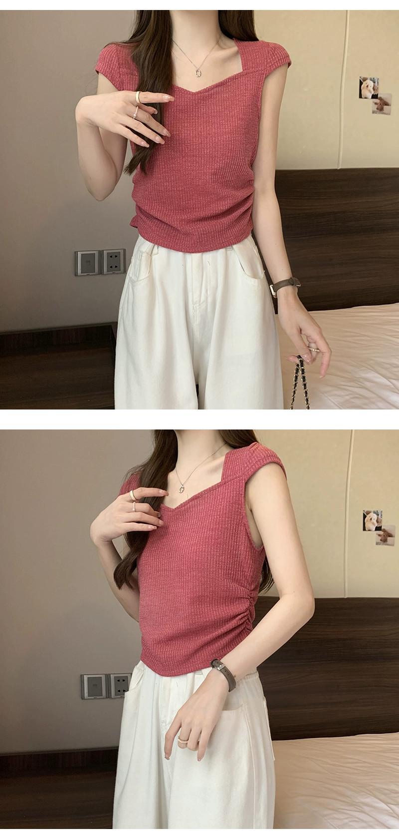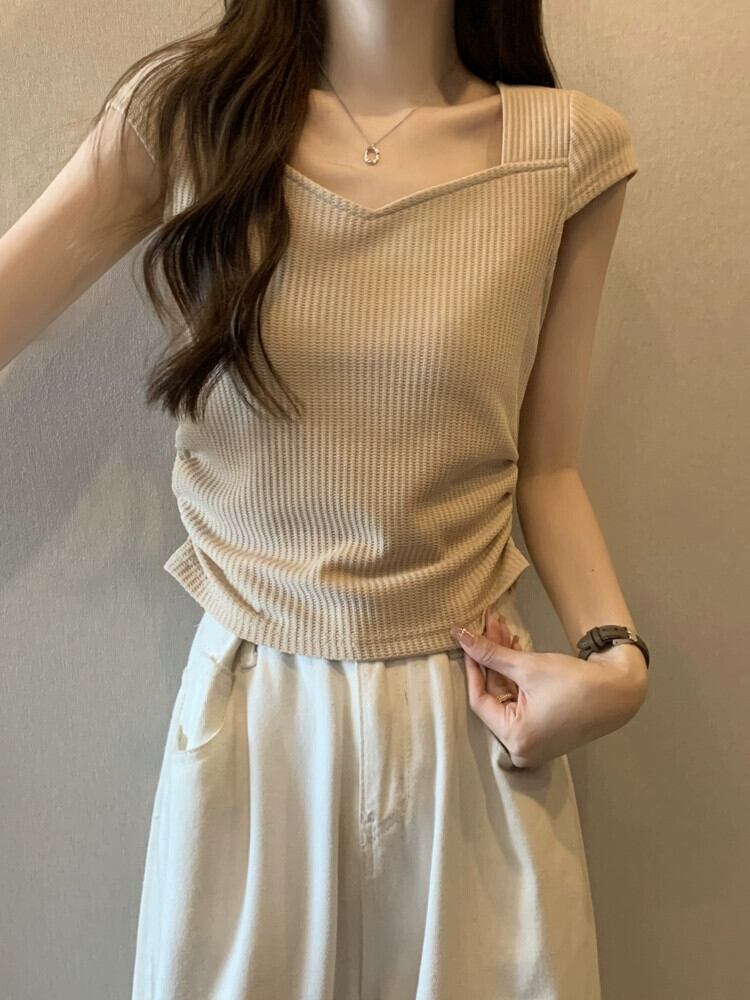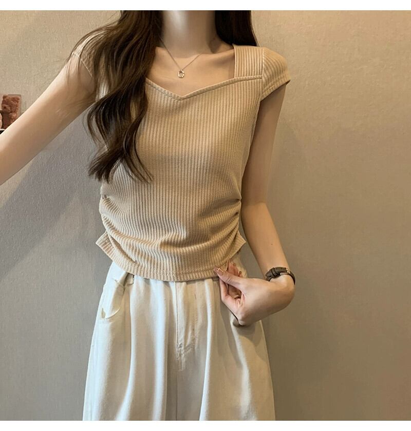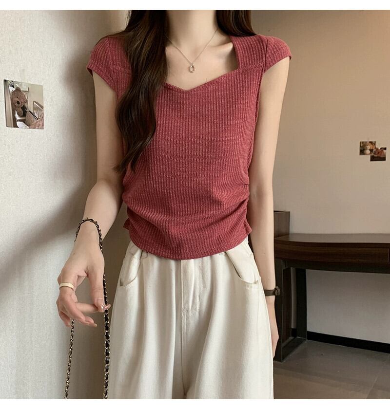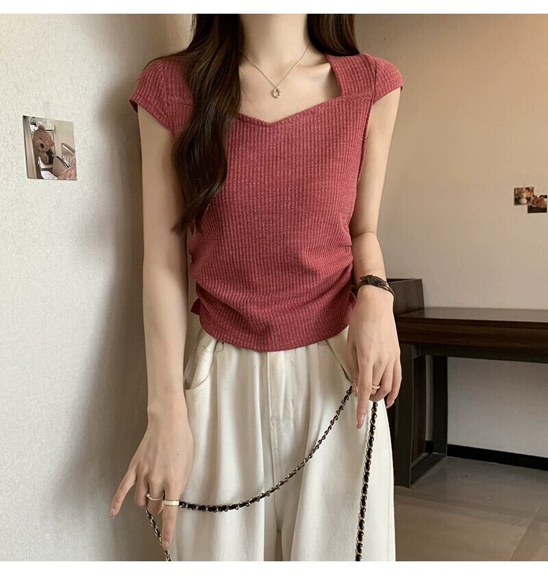 フロントショルダーアイスシルク半袖Tシャツレディース夏フレンチデザイン自己修養の感覚湾曲した短いセクション不規則なスクエアネックトップ薄い ショート サマー 夏物 スクウェア 7460023676390015 | framboise21
