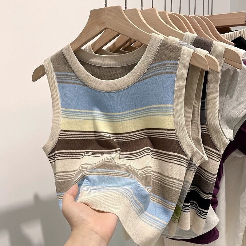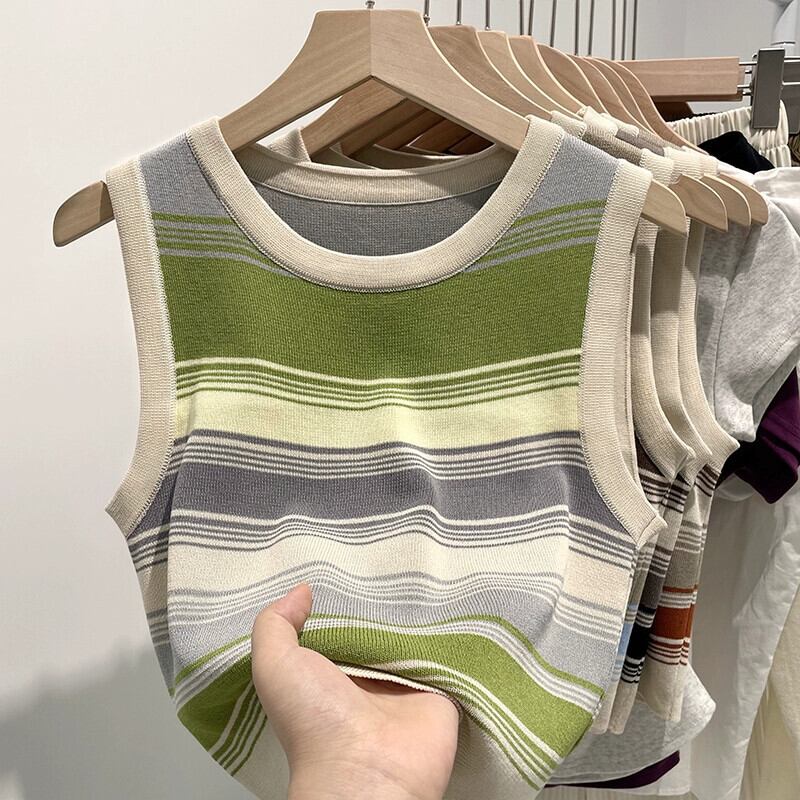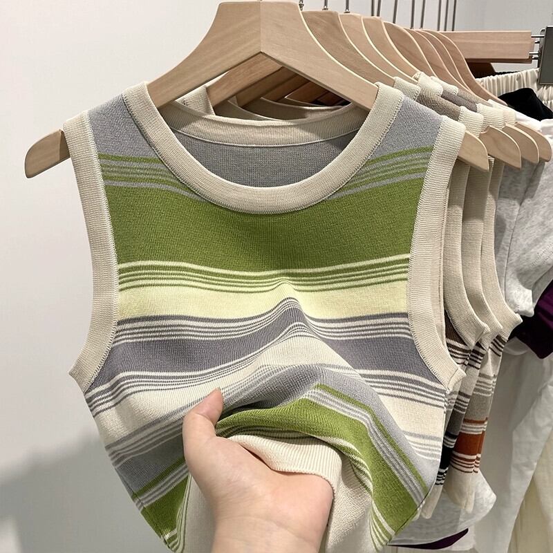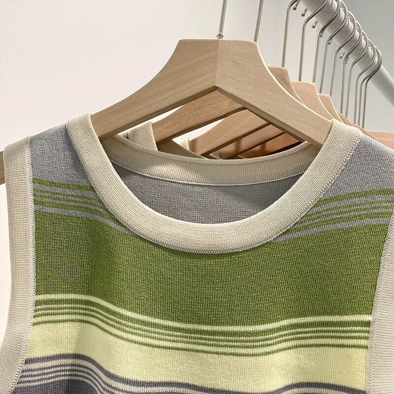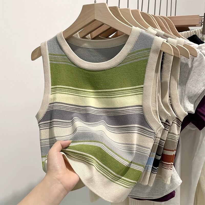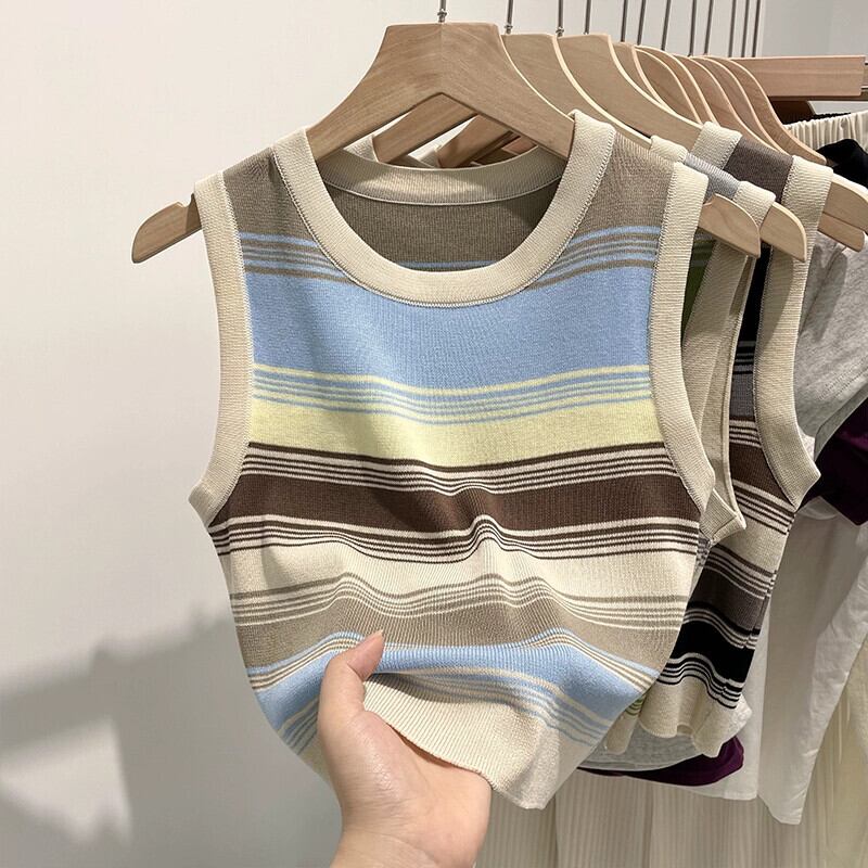 ルーズラウンドネックストライプベストスリング女性の夏フレンチインナーワイドショルダーストラップシックなアウターウェアニットノースリーブトップ サマー 夏物 Oネック 7460052325332509 | framboise21