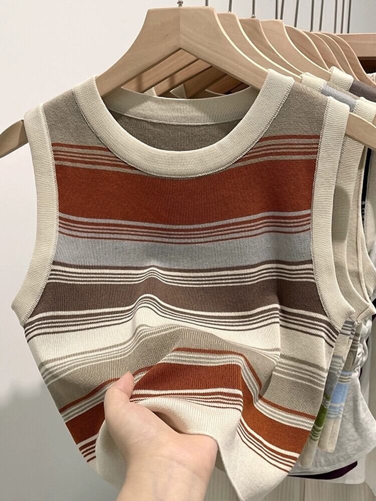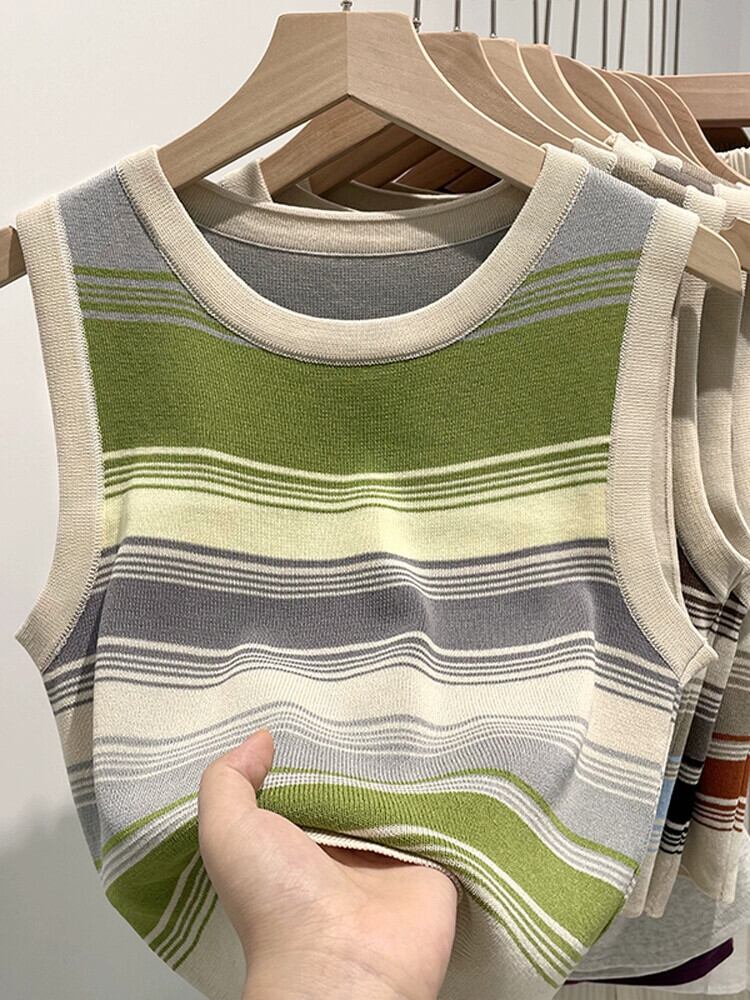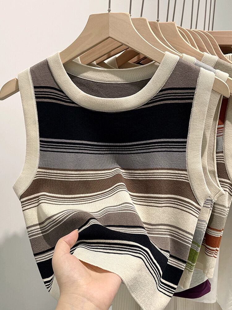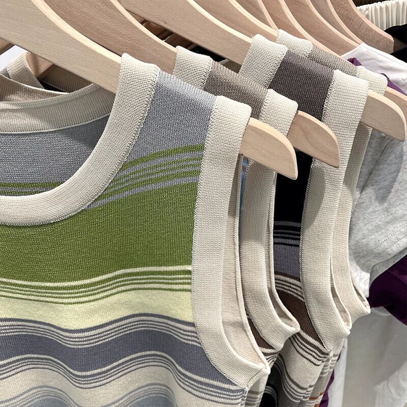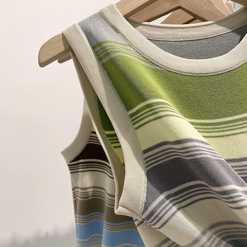 ルーズラウンドネックストライプベストスリング女性の夏フレンチインナーワイドショルダーストラップシックなアウターウェアニットノースリーブトップ サマー 夏物 Oネック 7460052325332509 | framboise21