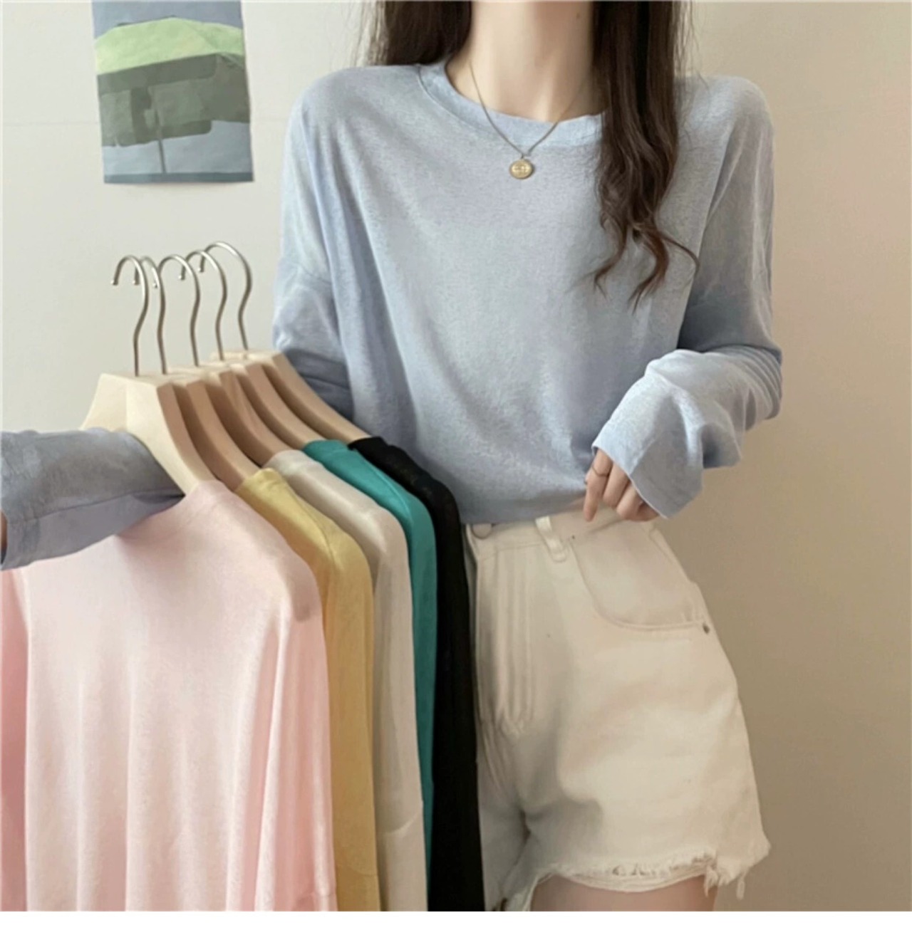白い長袖日焼け止め T シャツ女性の夏のアウター、サスペンダー付き、ルーズなハイウエスト ショート プルオーバー パーカー チュール トップ ロング ホワイト サマー 夏物 Tシャツ 7460035565347158