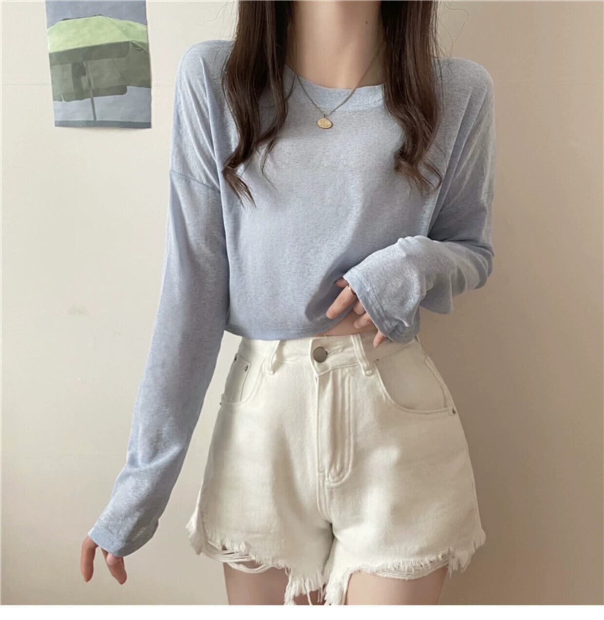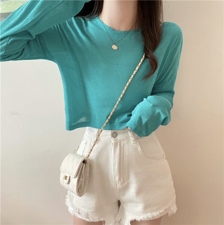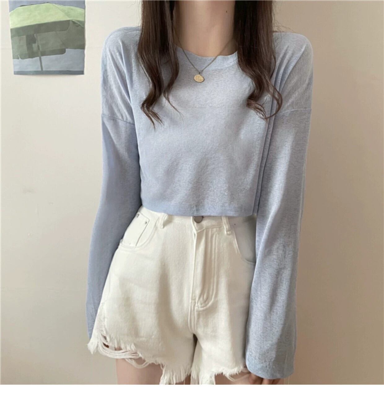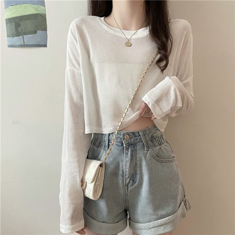 白い長袖日焼け止め T シャツ女性の夏のアウター、サスペンダー付き、ルーズなハイウエスト ショート プルオーバー パーカー チュール トップ ロング ホワイト サマー 夏物 Tシャツ 7460035565347158 | framboise21