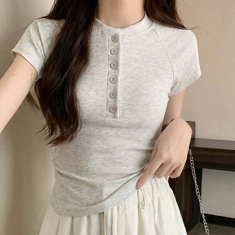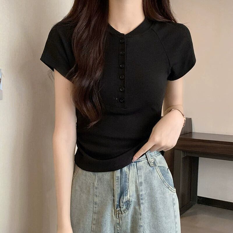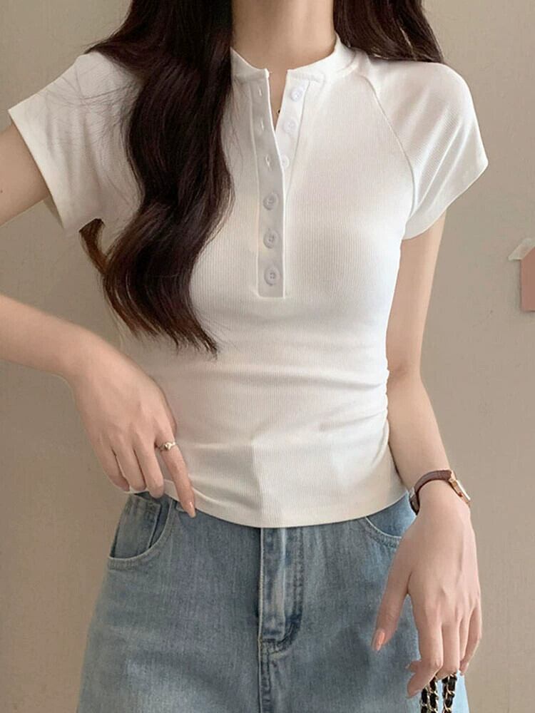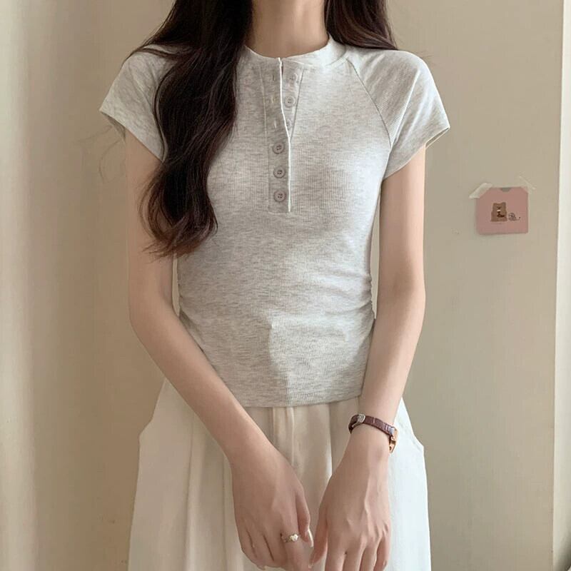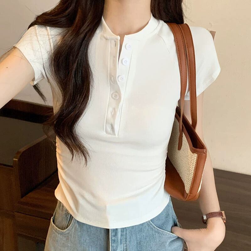 ハーフハイカラーラグランショルダー半袖 Tシャツレディース 2023 夏の新しいファッションフロントショルダースリムタイトショートトップ サマー 夏物 746005993624087 | framboise21