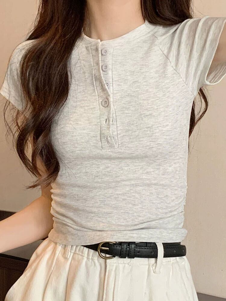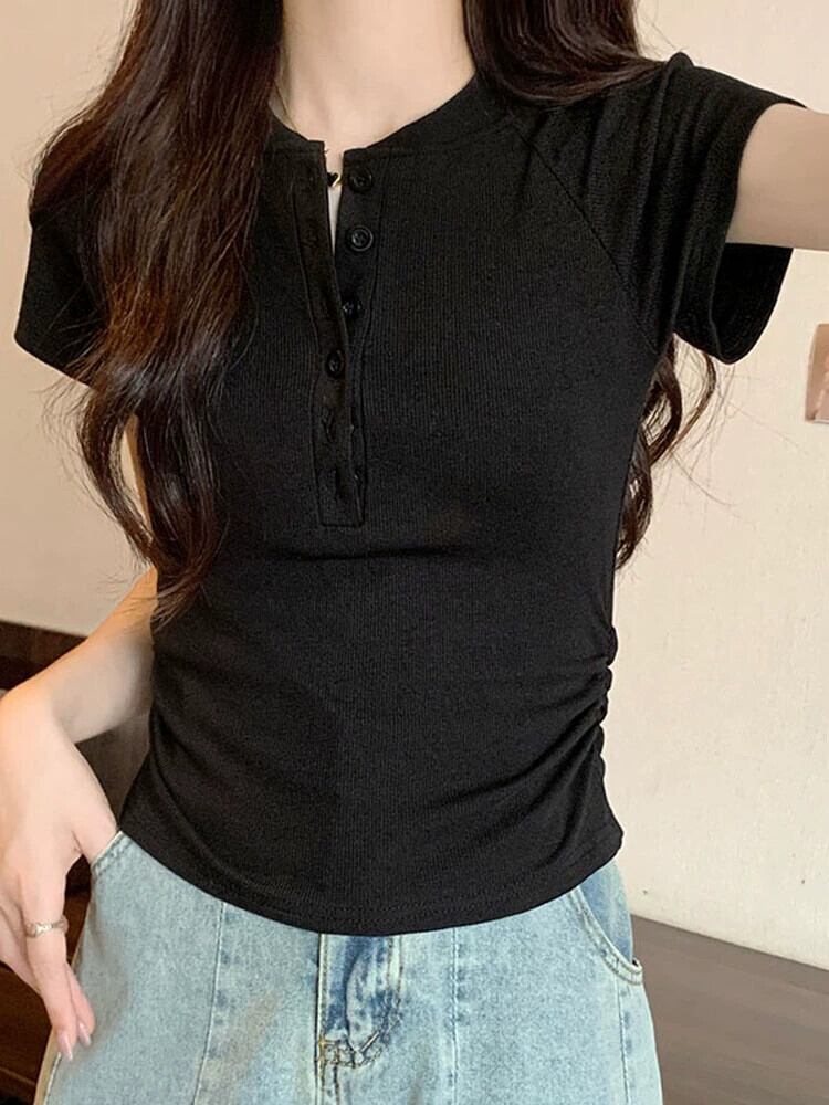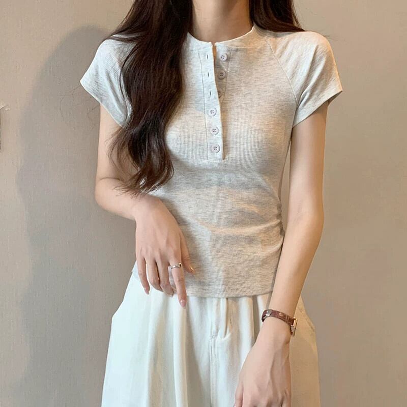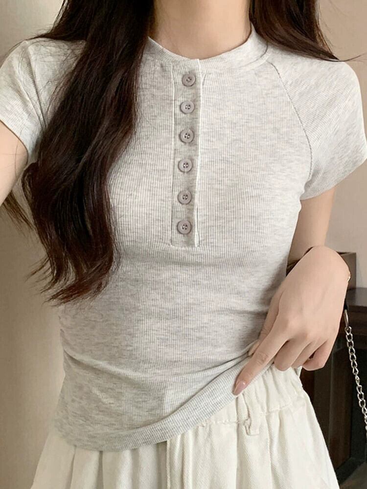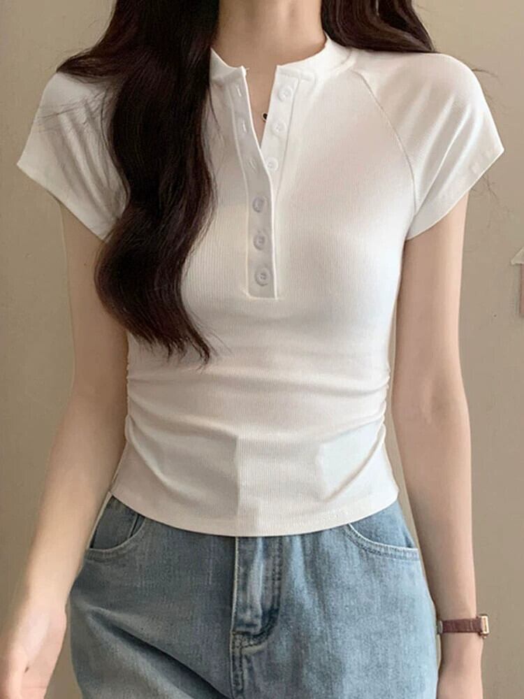 ハーフハイカラーラグランショルダー半袖 Tシャツレディース 2023 夏の新しいファッションフロントショルダースリムタイトショートトップ サマー 夏物 746005993624087 | framboise21