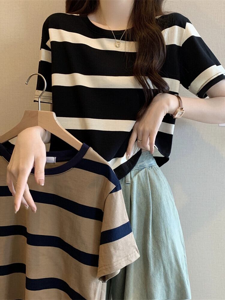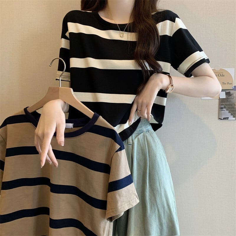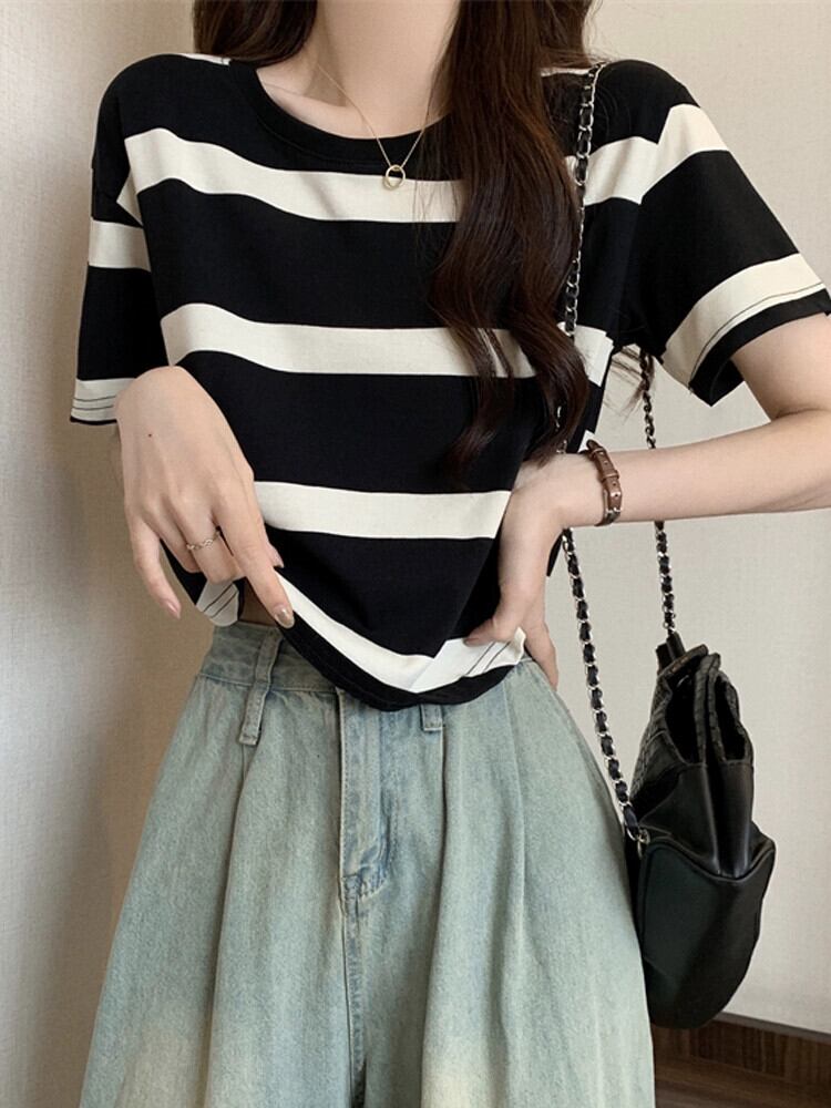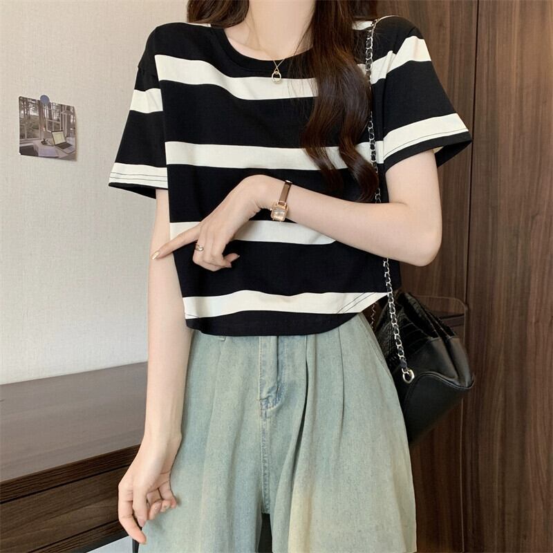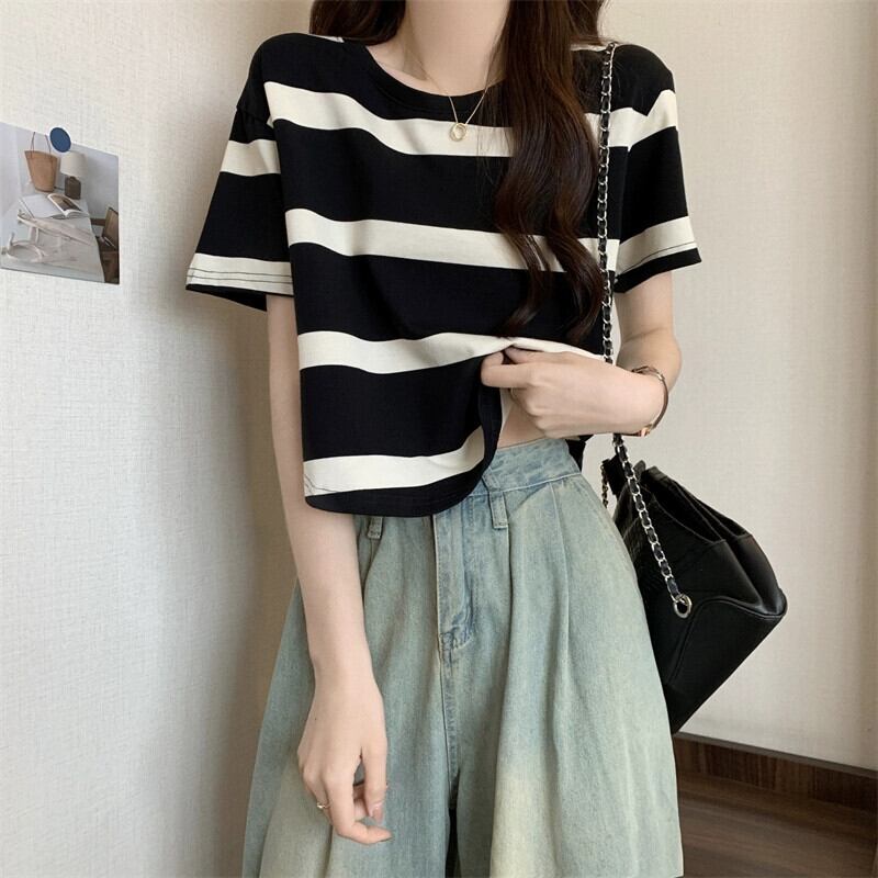 黒と白の縞模様の半袖Tシャツの女性の夏肩は細くて小さく見えますデザインセンスバージョンルーズショートトップトレンド ホワイト ブラック サマー 夏物 ストライプ 7460068845595447 | framboise21
