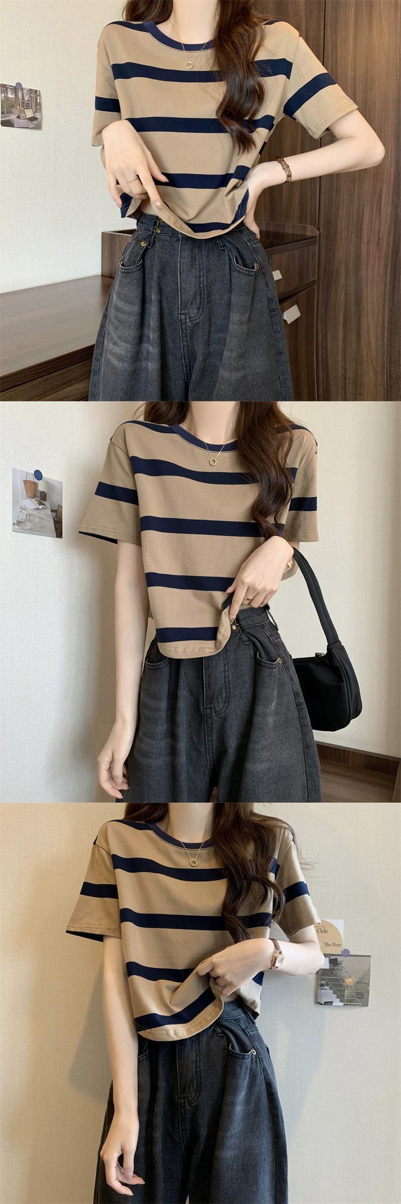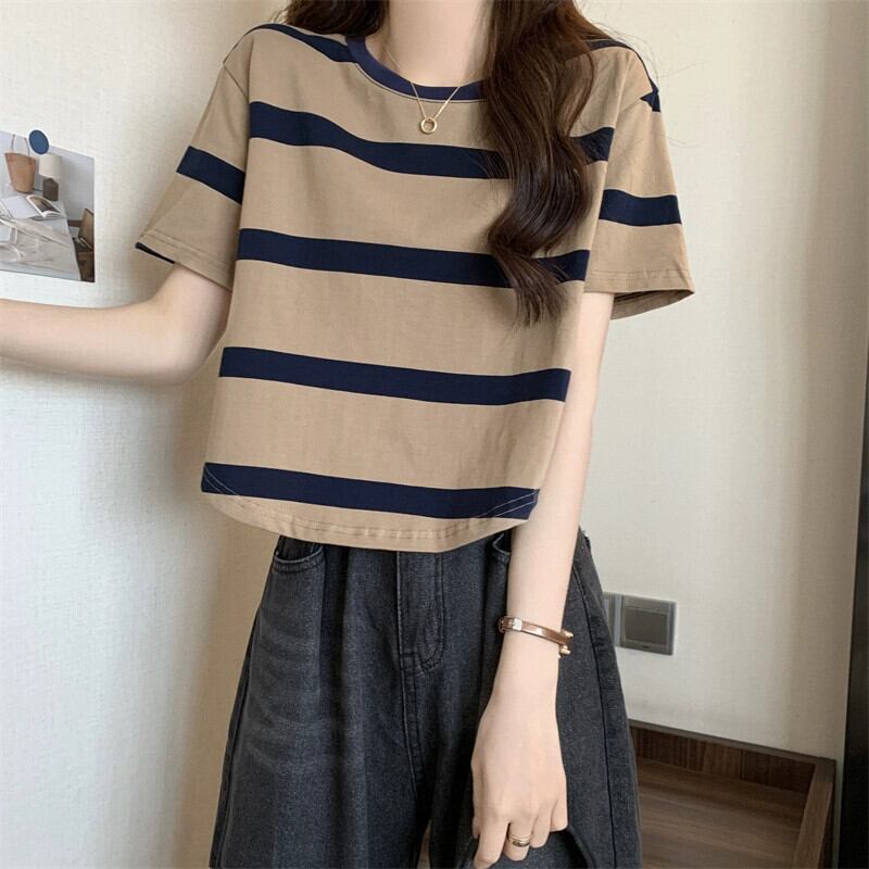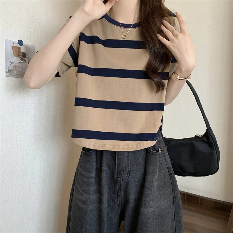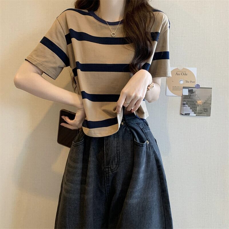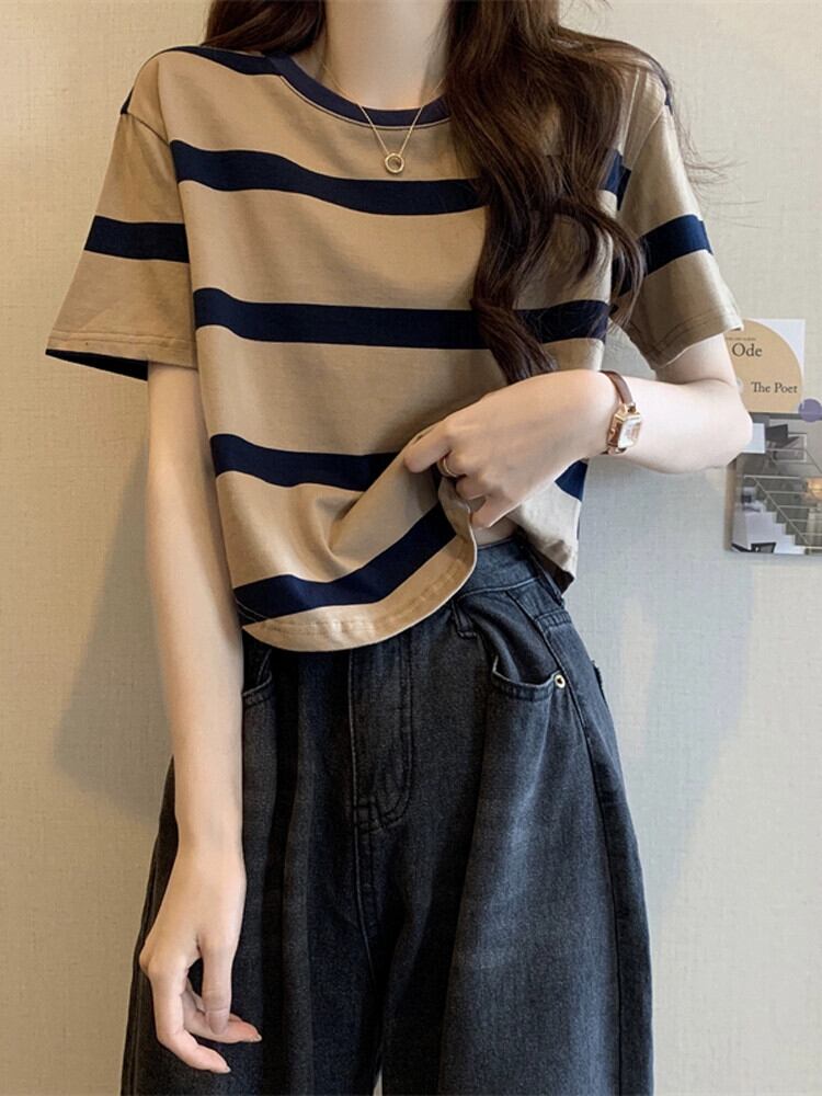 黒と白の縞模様の半袖Tシャツの女性の夏肩は細くて小さく見えますデザインセンスバージョンルーズショートトップトレンド ホワイト ブラック サマー 夏物 ストライプ 7460068845595447 | framboise21