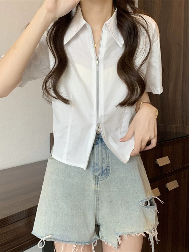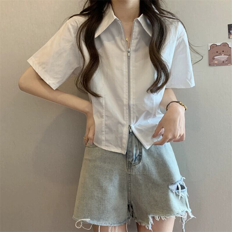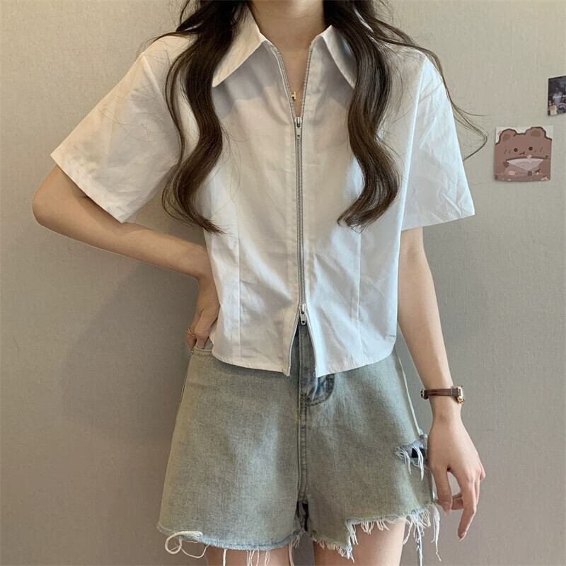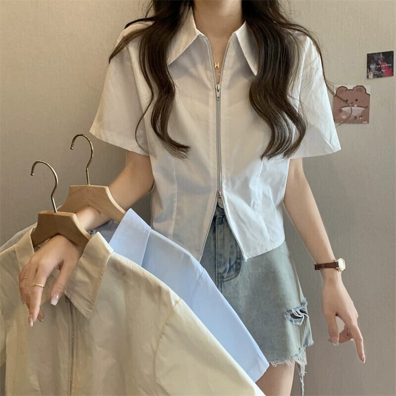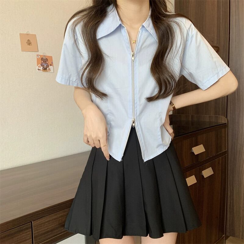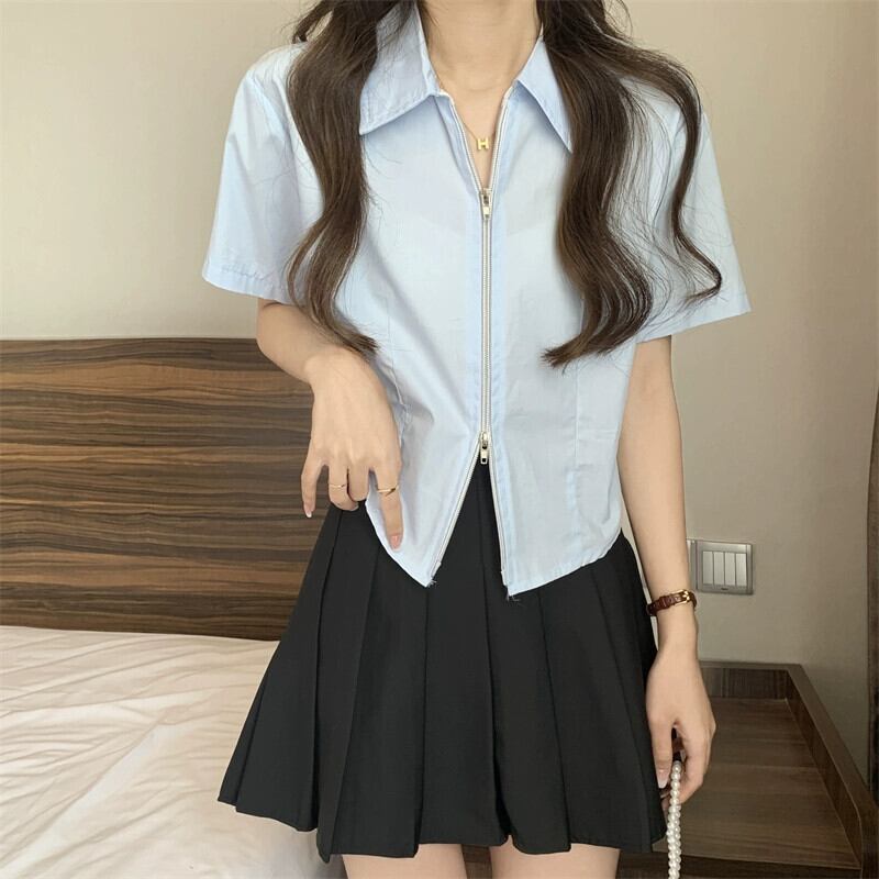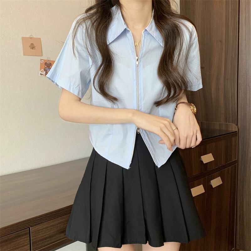 ブルーフロントショルダー半袖シャツ女性の夏のデザインセンスニッチショートシャツファッションルーズオールマッチダブルジッパートップ サマー 夏物 746003359176109 | framboise21