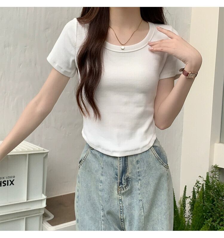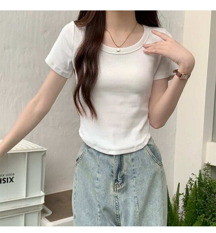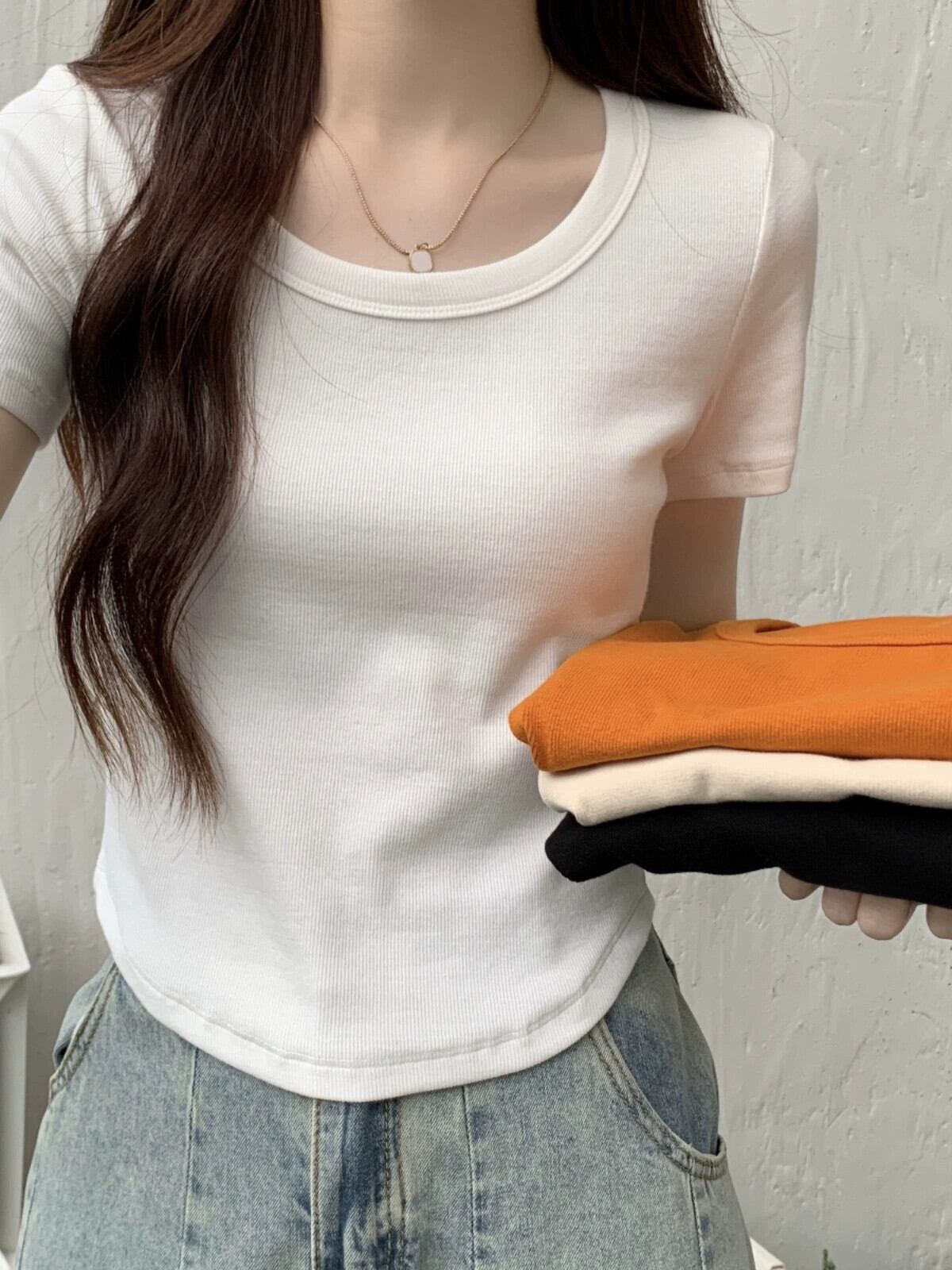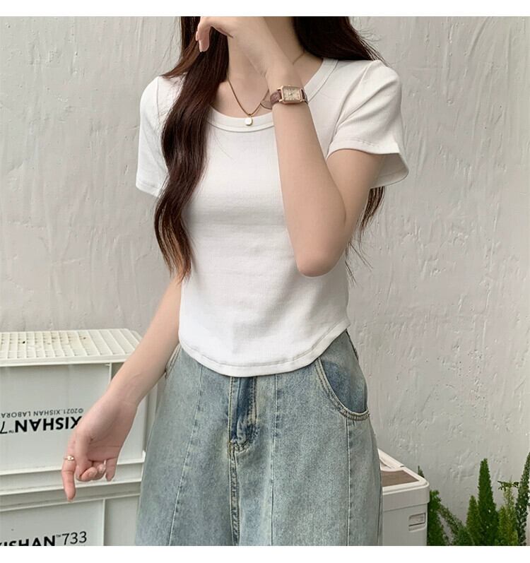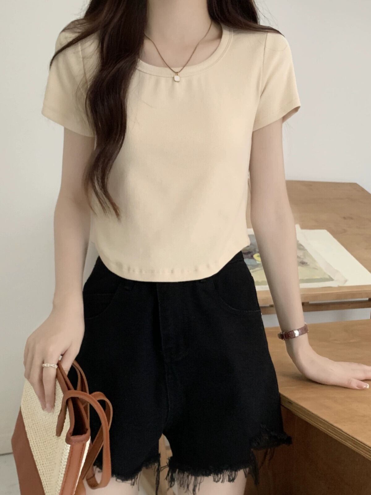 カーブした裾の純粋な綿のラウンドネック半袖 Tシャツの女性の夏のデザインファッション不規則なニッチスリムショートトップ コットン サマー 夏物 Oネック ピュア 7460062329739798 | framboise21