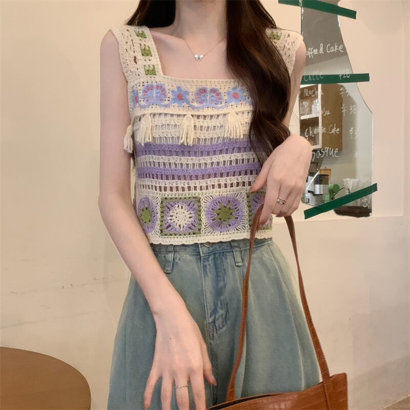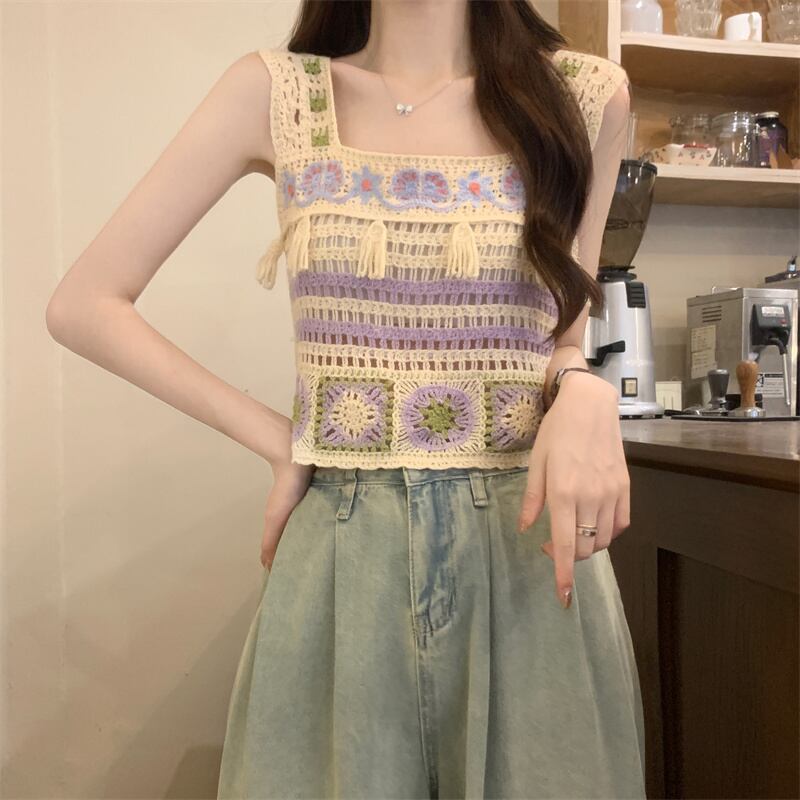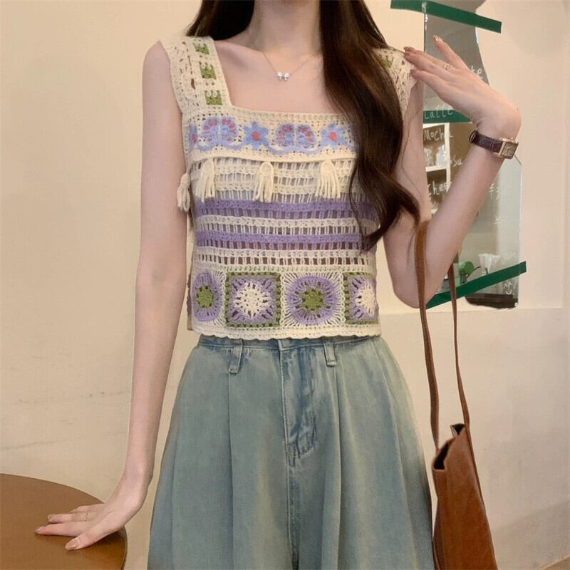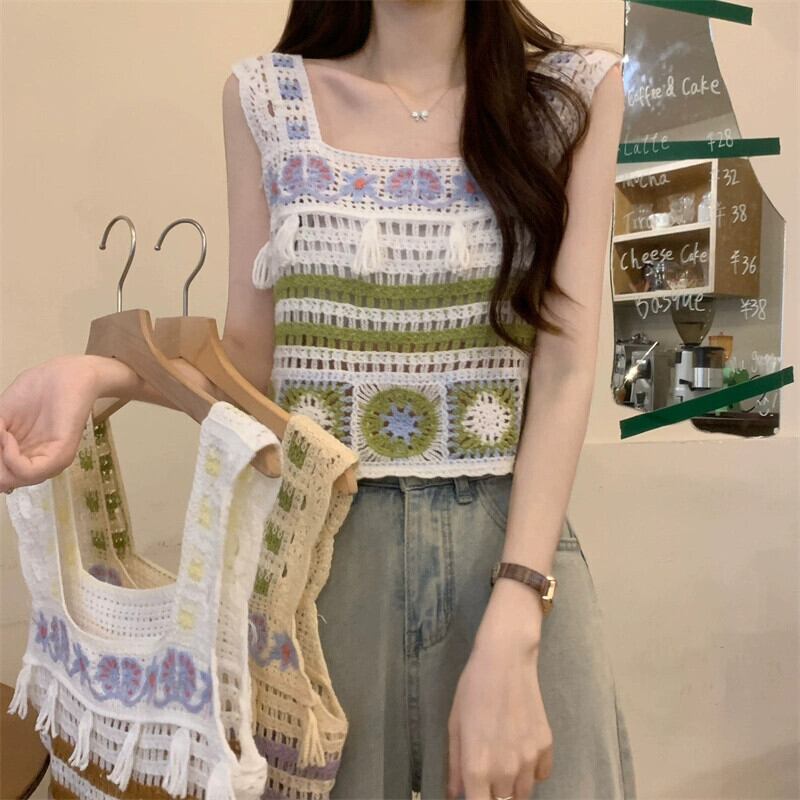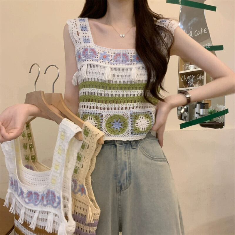 スクエアカラーニットキャミソールレディース夏アウター・インナーウェアスリムデザイン感覚薄肉中空フックフラワーアイスシルクトップ サマー 夏物 フラワーデザイン スクウェア 7460074379943422 | framboise21