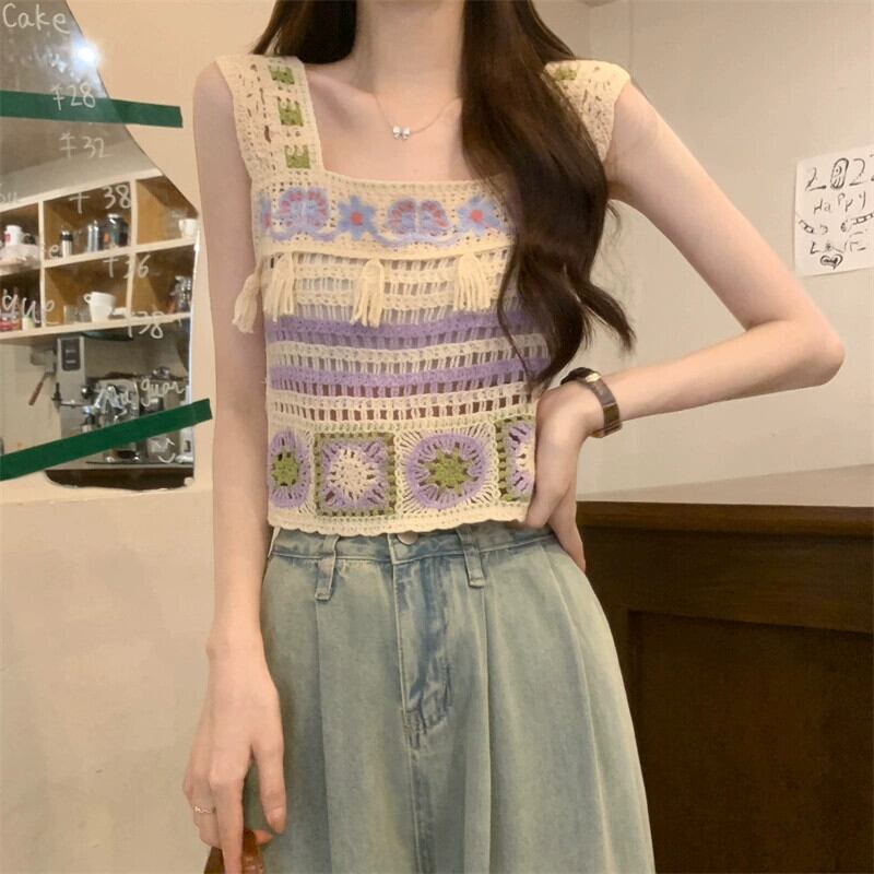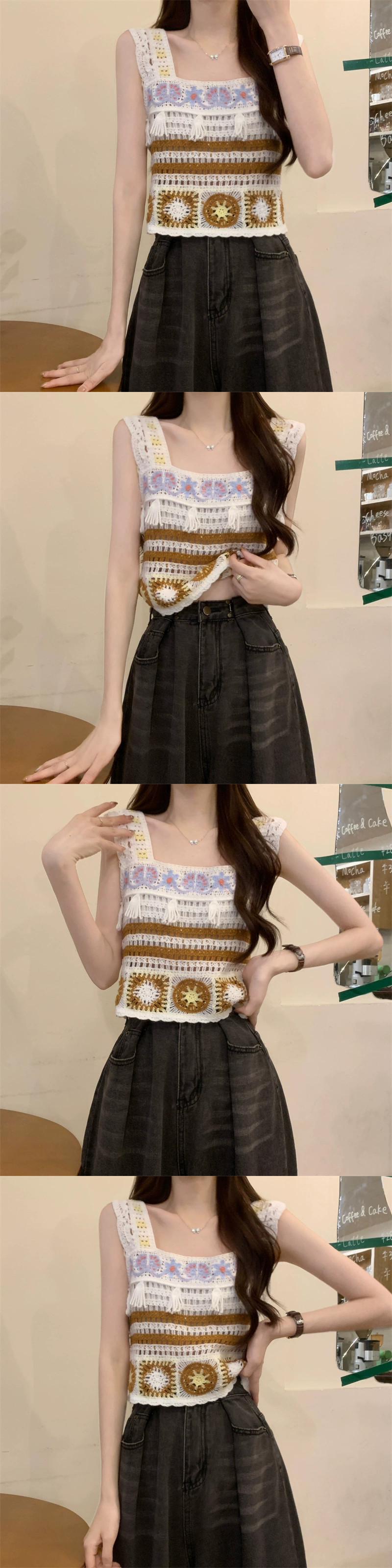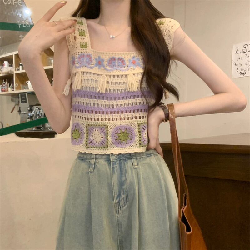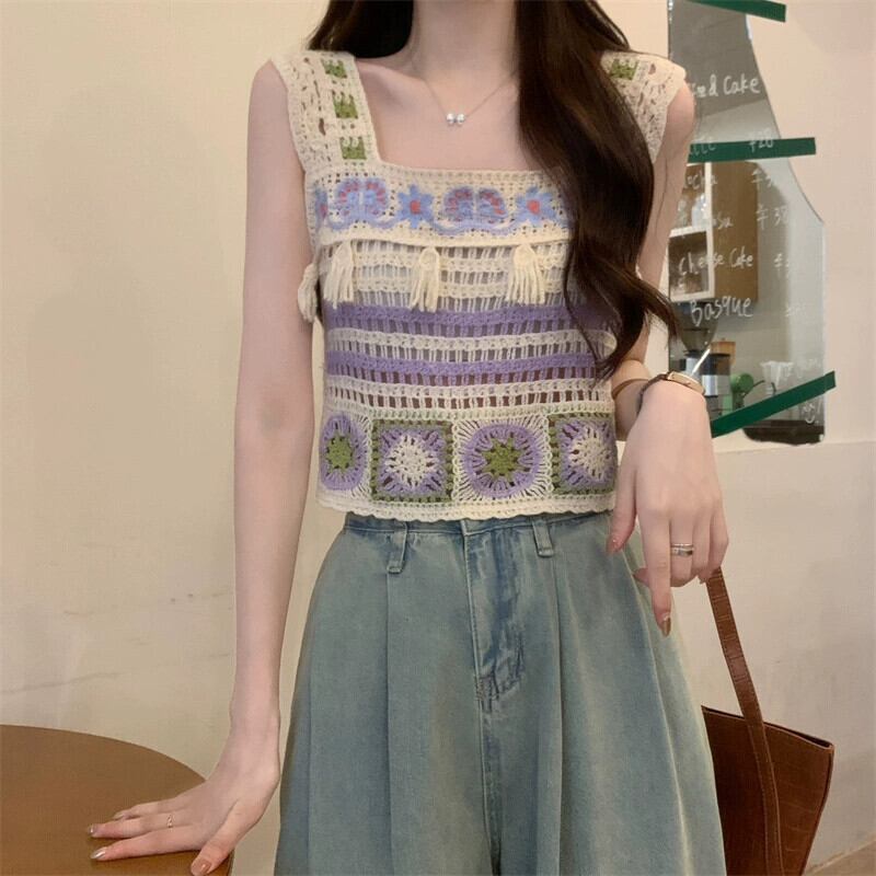 スクエアカラーニットキャミソールレディース夏アウター・インナーウェアスリムデザイン感覚薄肉中空フックフラワーアイスシルクトップ サマー 夏物 フラワーデザイン スクウェア 7460074379943422 | framboise21