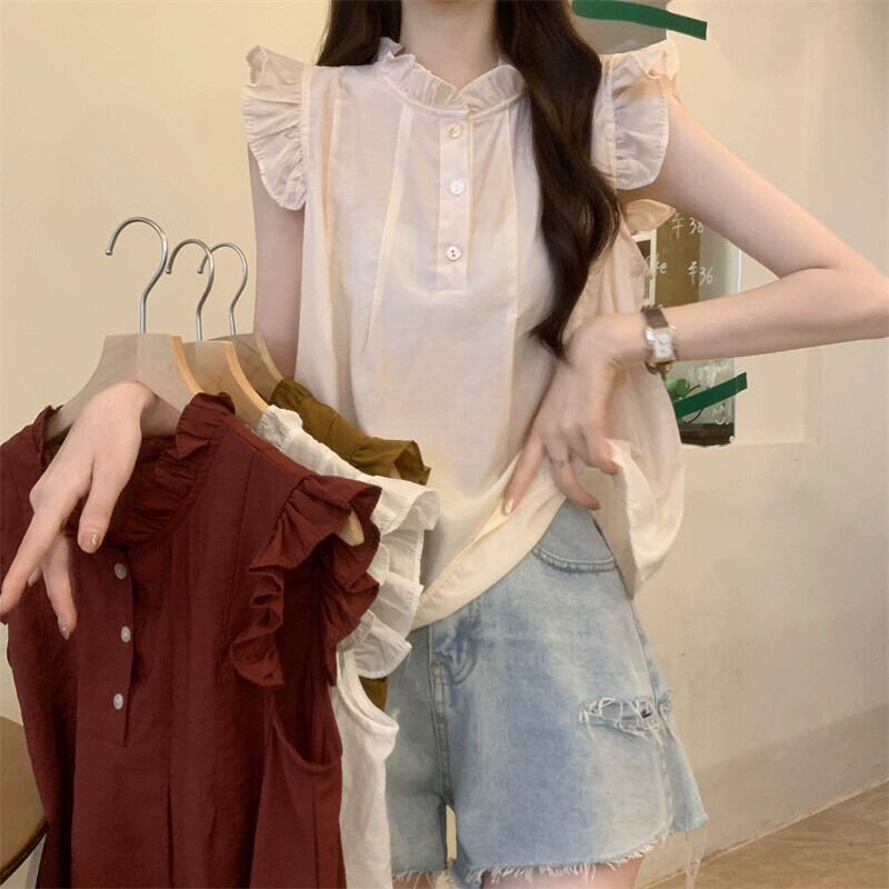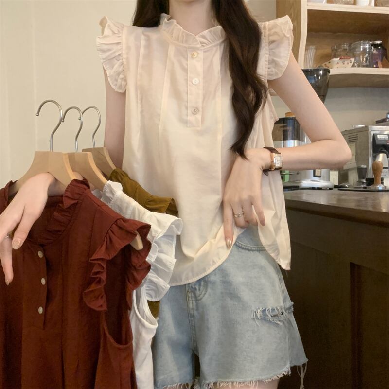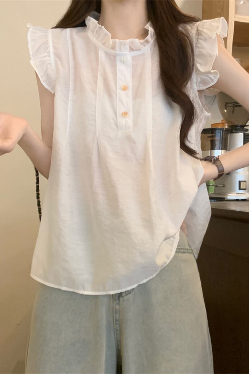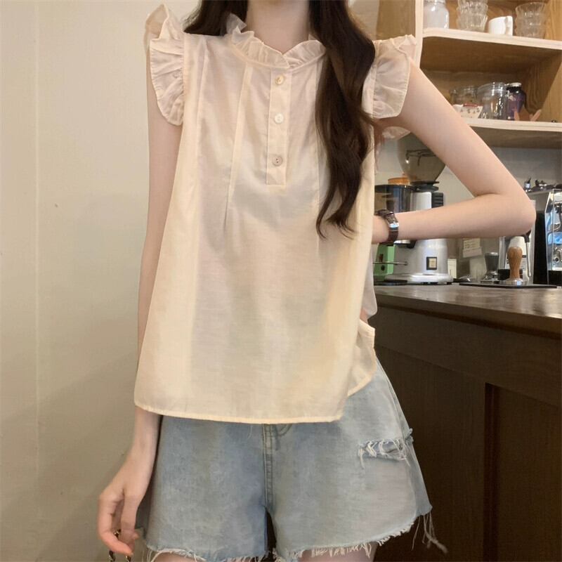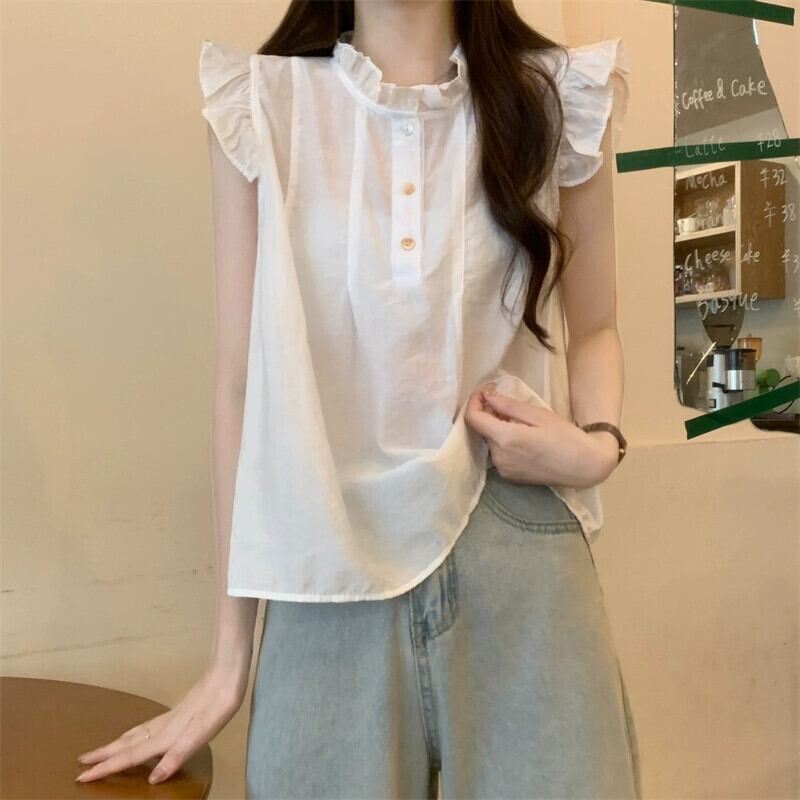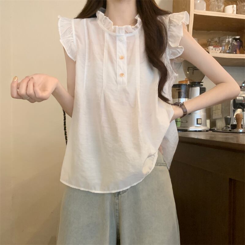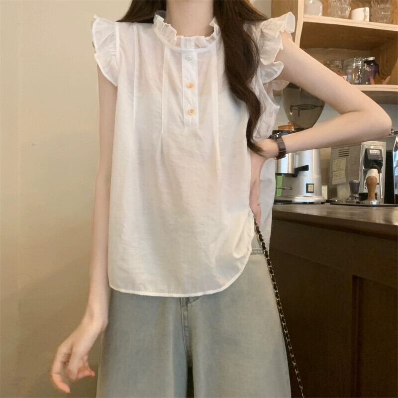 白いノースリーブシャツ女性の夏のファッションアインスタイルデザインセンスニッチルーズ薄いセクションフリル小さなフライングスリーブトップ ホワイト サマー 夏物 7460093627976624 | framboise21