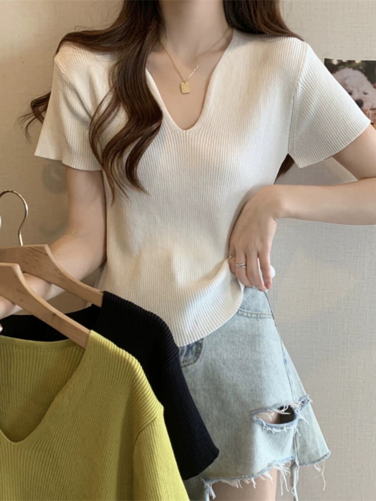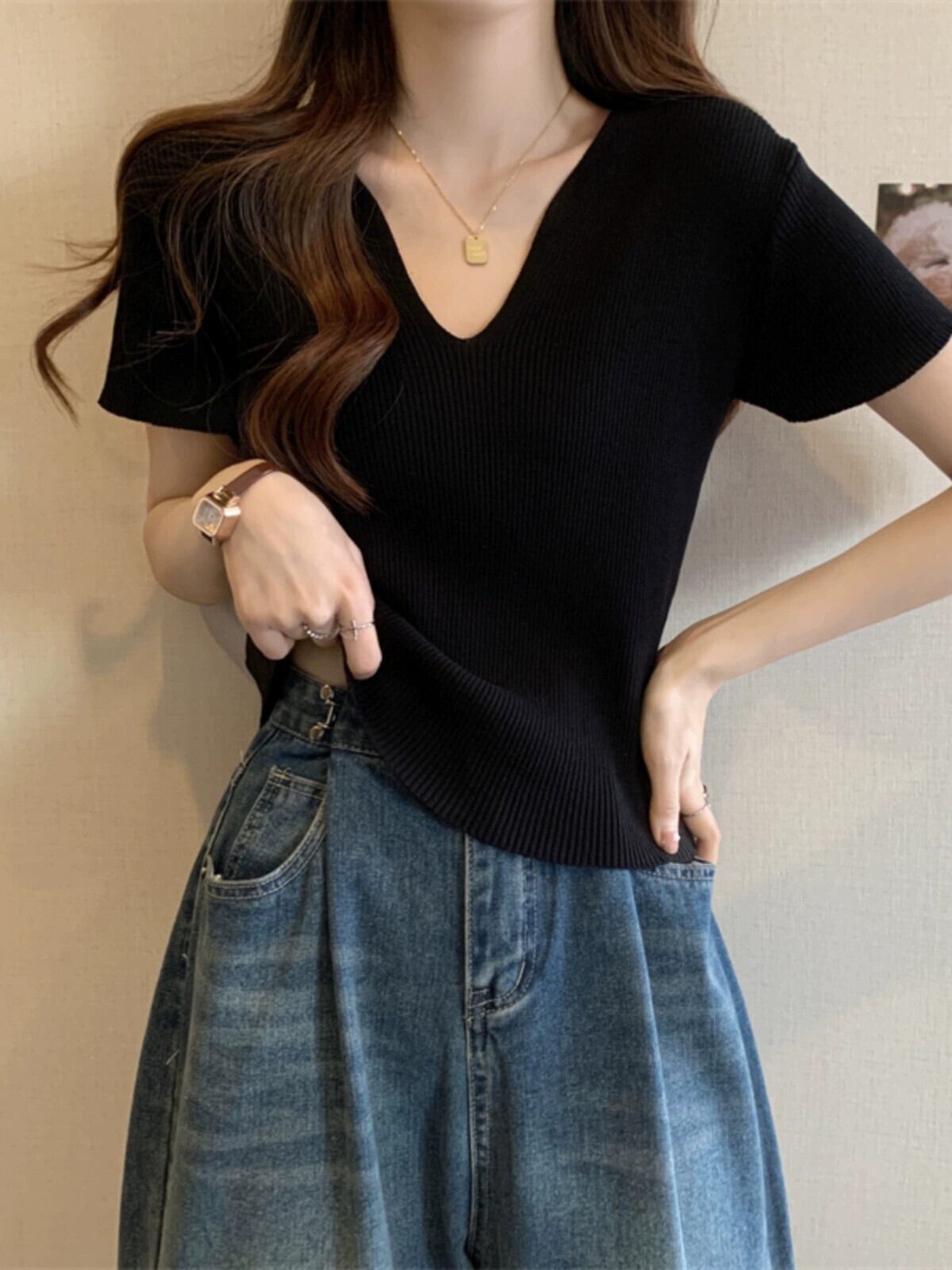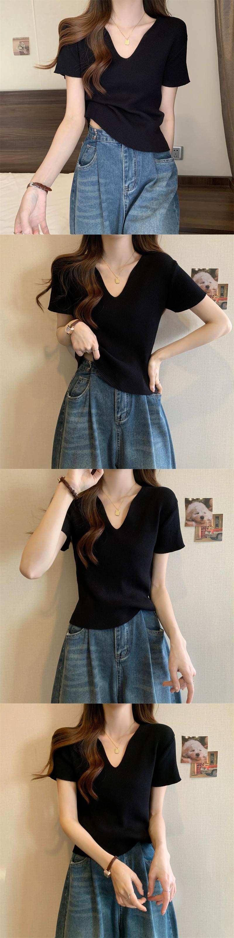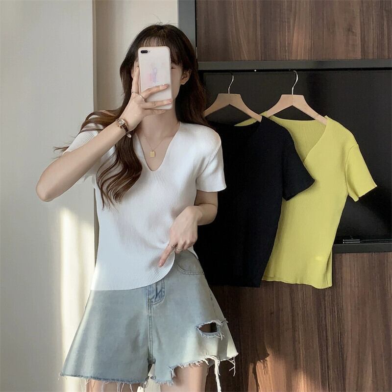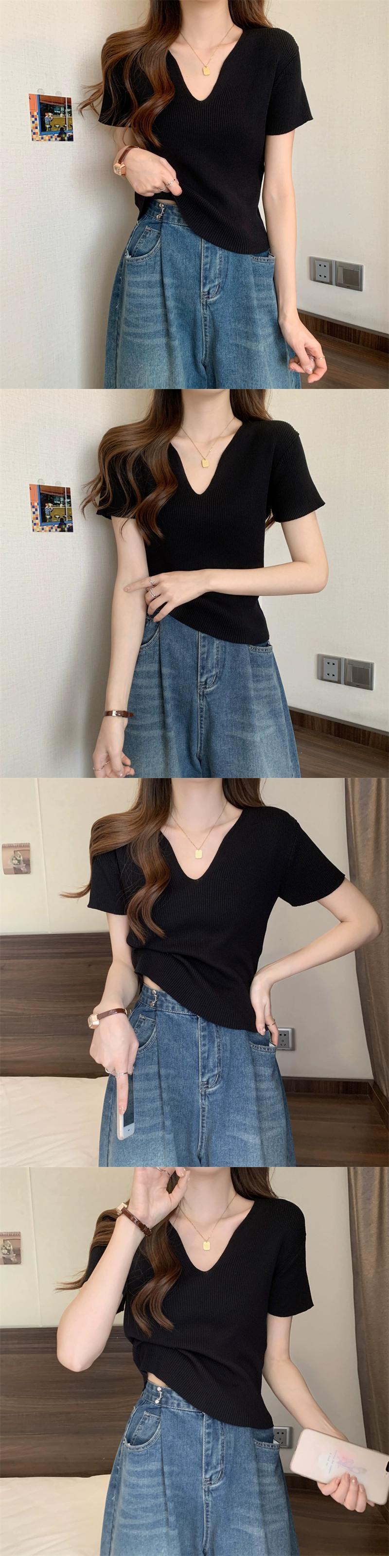 黒フロントショルダーニット t シャツの女性の半袖 2023 新しい夏のスリムフィットと薄い短い糸 v ネックアイスシルクトップ ショート ブラック サマー 夏物 Vネック Tシャツ 7460077278725523 | framboise21