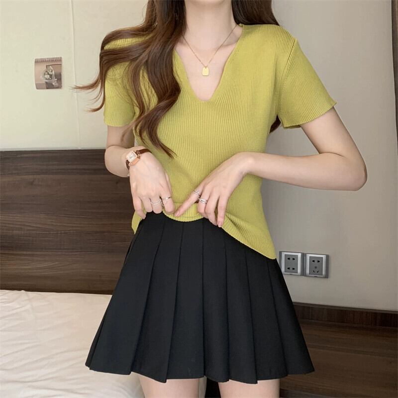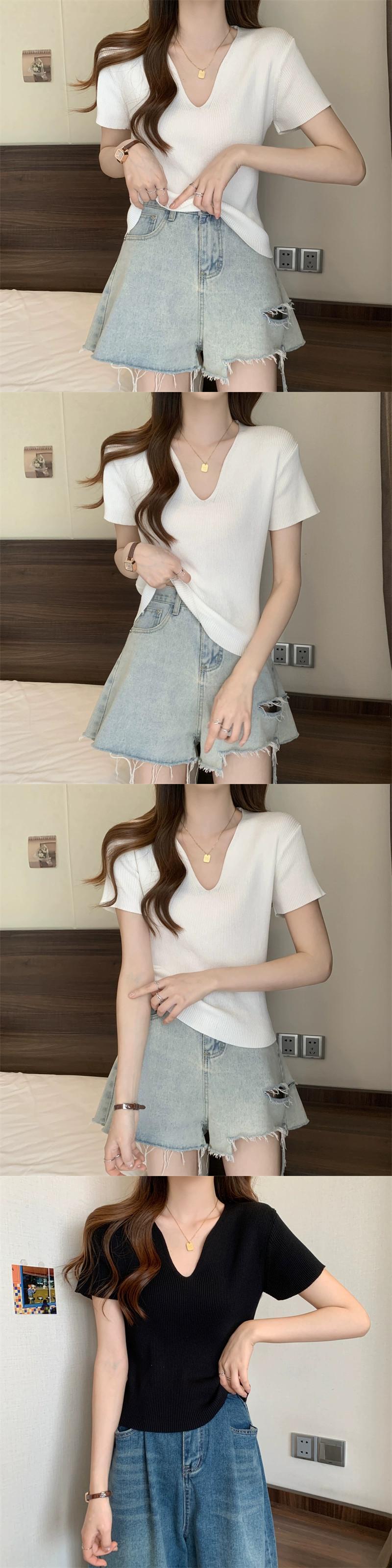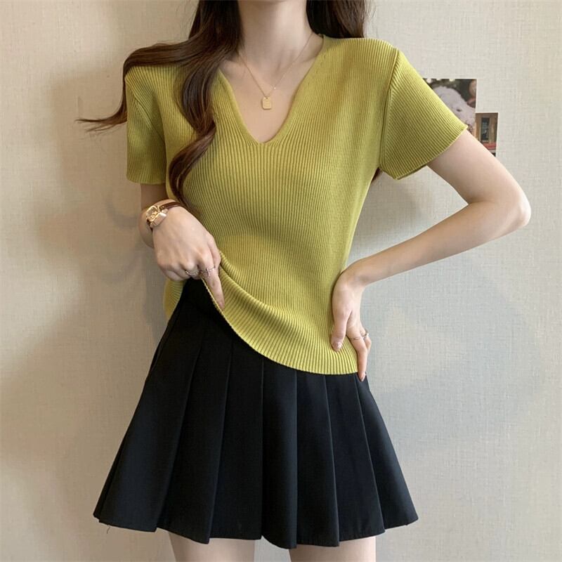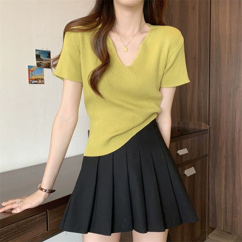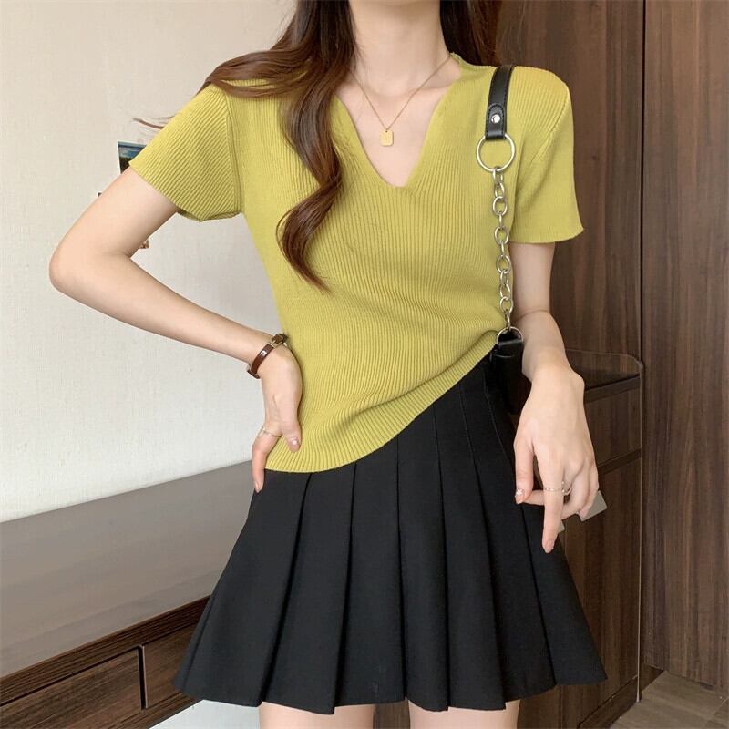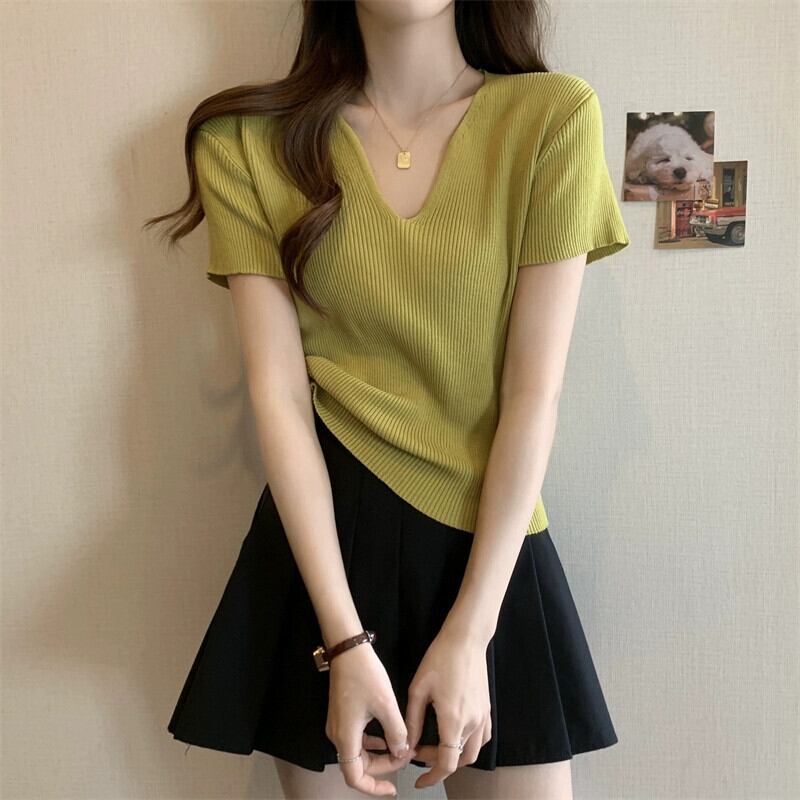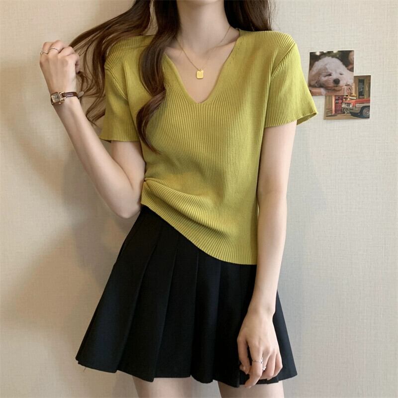 黒フロントショルダーニット t シャツの女性の半袖 2023 新しい夏のスリムフィットと薄い短い糸 v ネックアイスシルクトップ ショート ブラック サマー 夏物 Vネック Tシャツ 7460077278725523 | framboise21