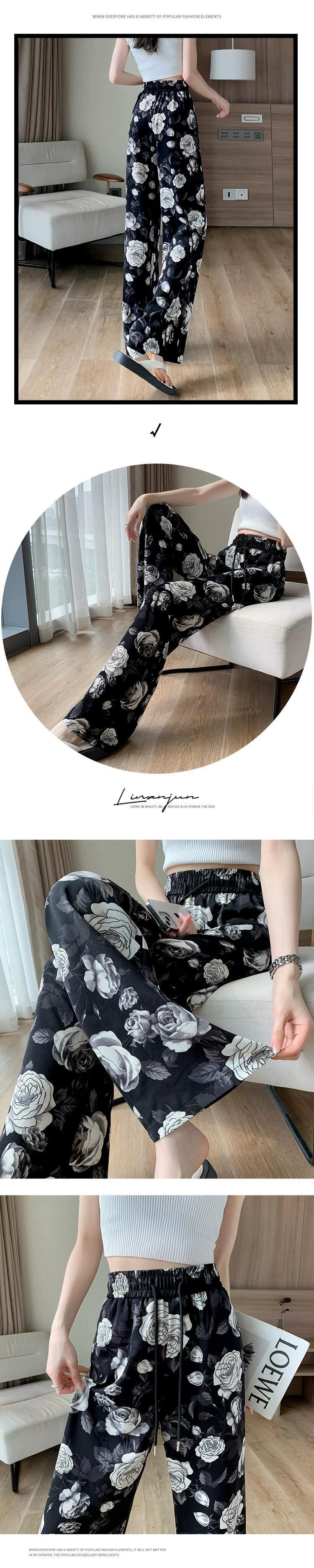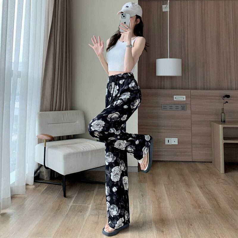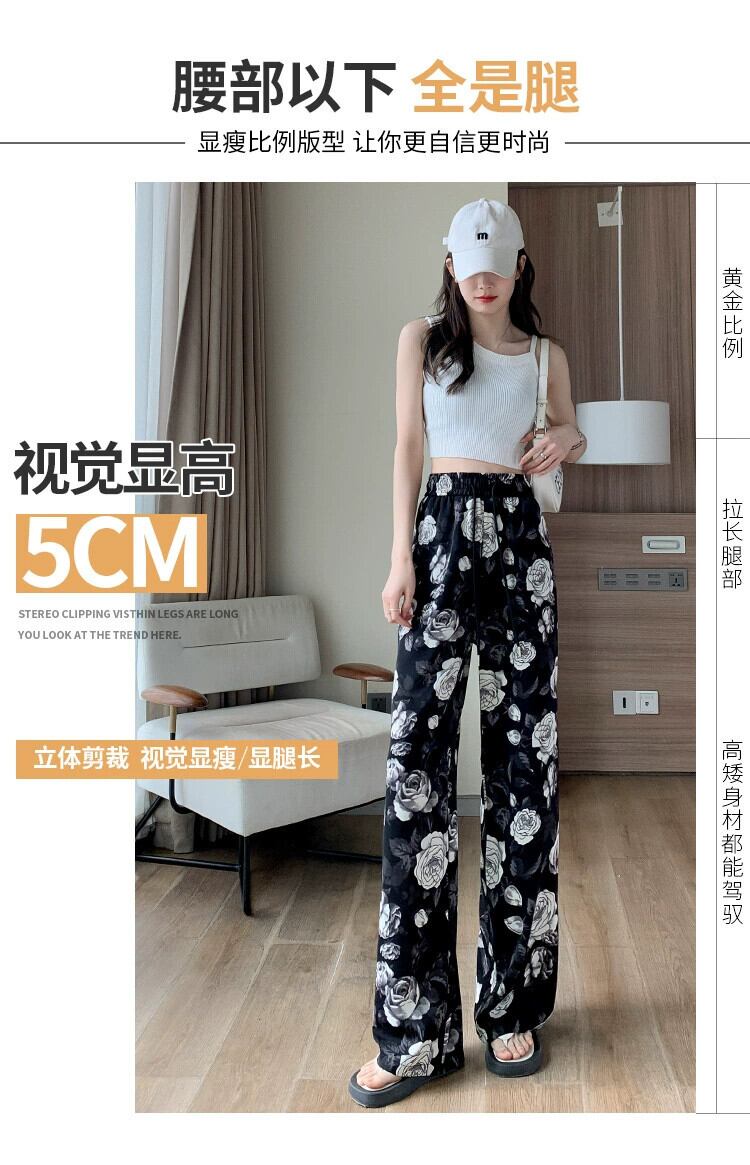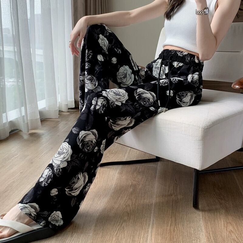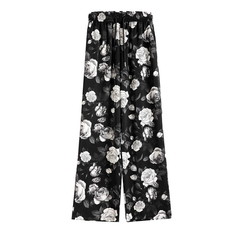 ローズプリントパンツレディース夏アイスシルクワイドレッグパンツカジュアルハイウエスト薄肉スリムストレートチューブクールパンツブラック ハイウェスト サマー 夏物 74600213161565 | framboise21