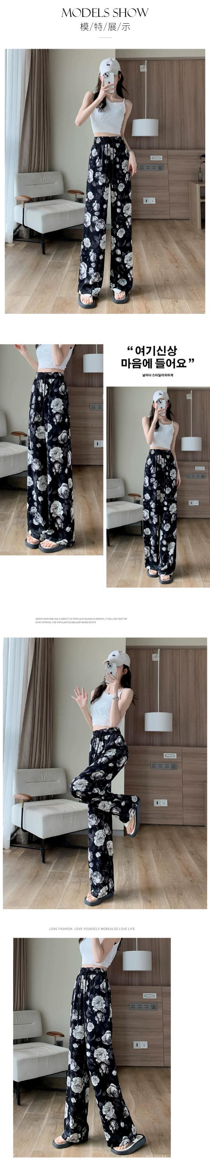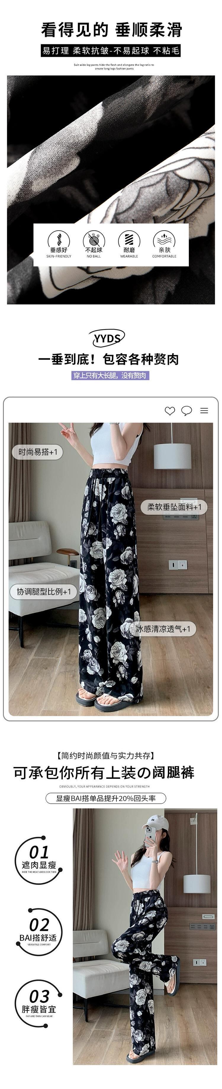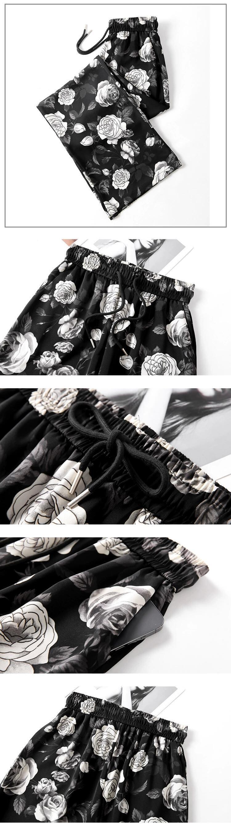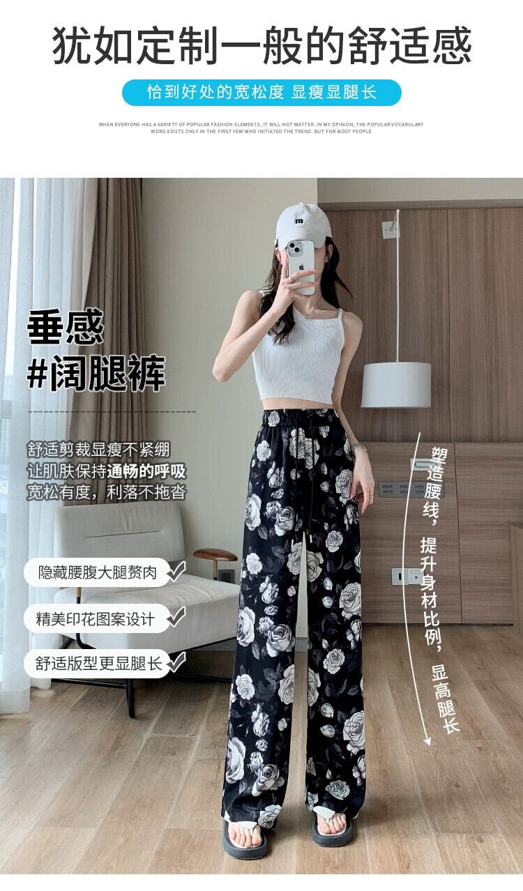 ローズプリントパンツレディース夏アイスシルクワイドレッグパンツカジュアルハイウエスト薄肉スリムストレートチューブクールパンツブラック ハイウェスト サマー 夏物 74600213161565 | framboise21
