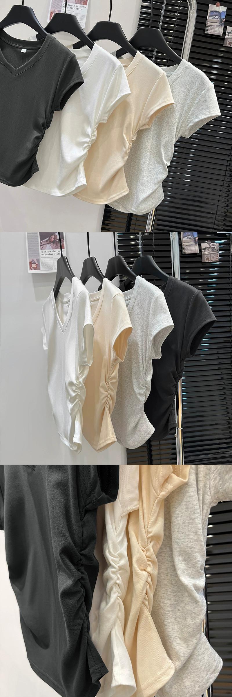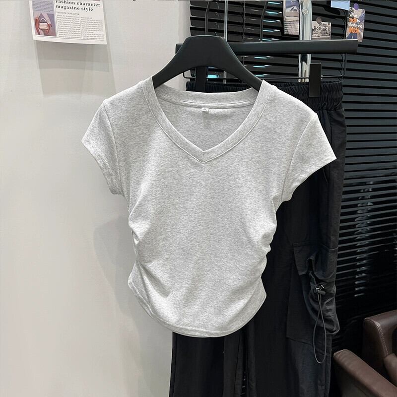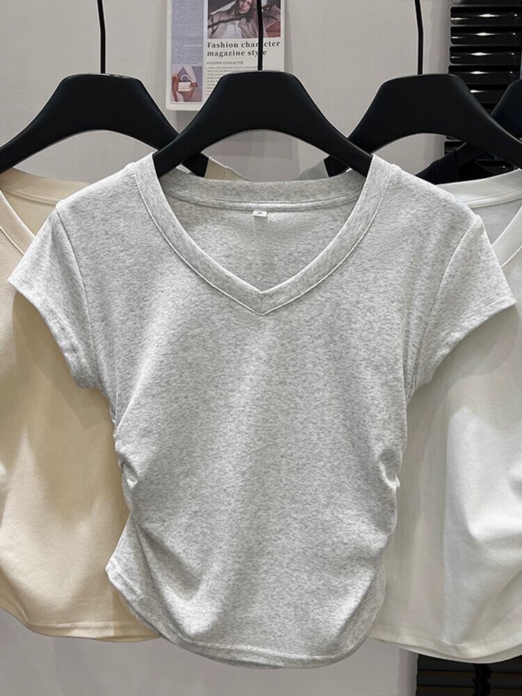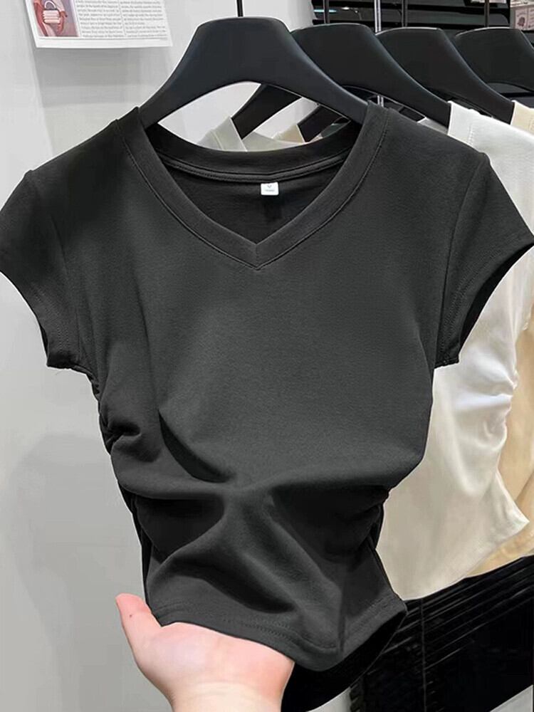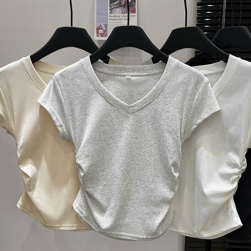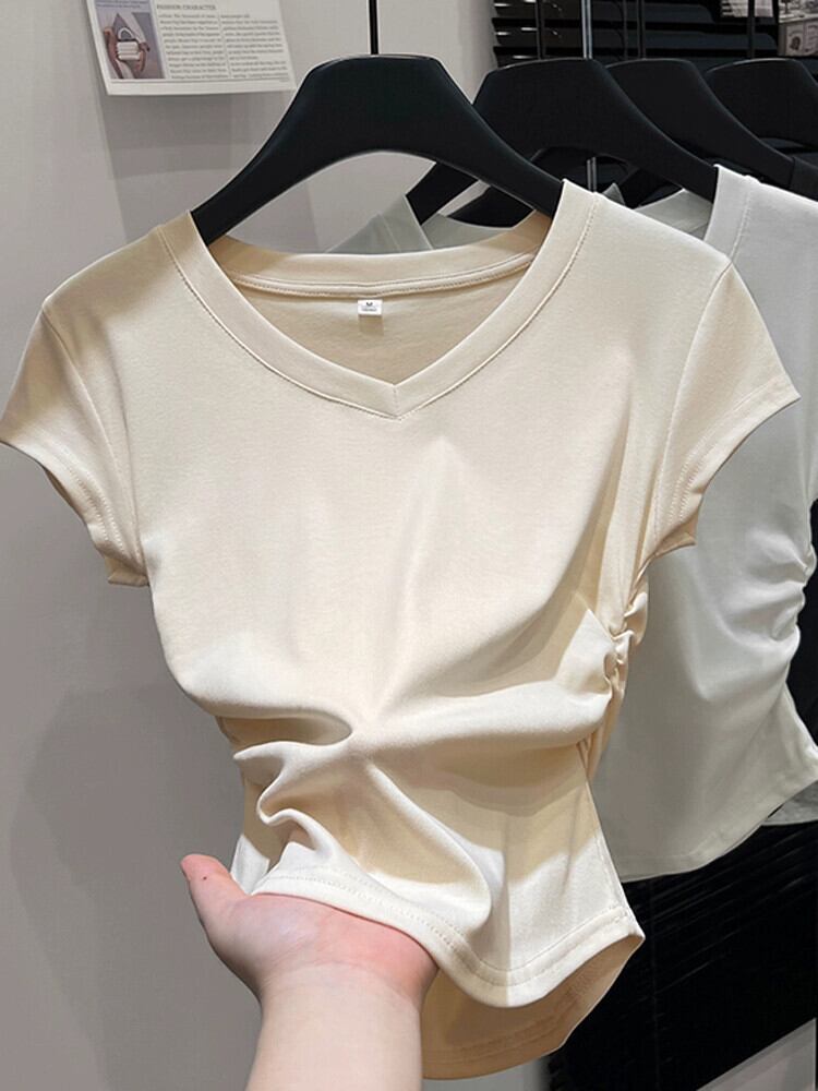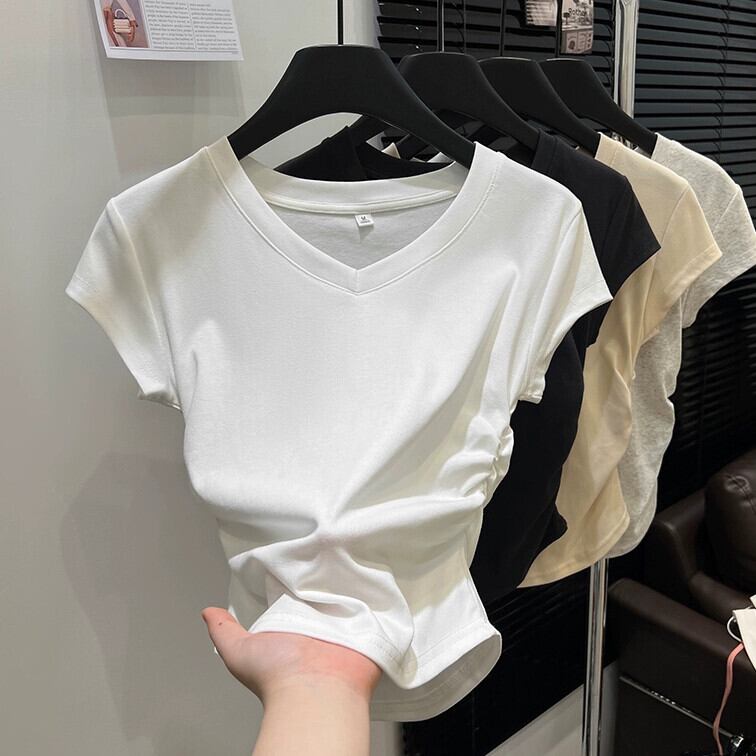 Vネック半袖Tシャツ レディース 夏デザイン ファッション 洋風 ウエストシャーリング スリムショルダー スリムショートトップス ホワイト サマー 夏物 7460047050890651 | framboise21