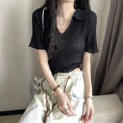 薄氷シルク ニット 半袖 Tシャツ レディース 夏 デザイン感 ニッチ スリム スリム ショート ポロカラー トップス グレー サマー 夏物 7460017982272128