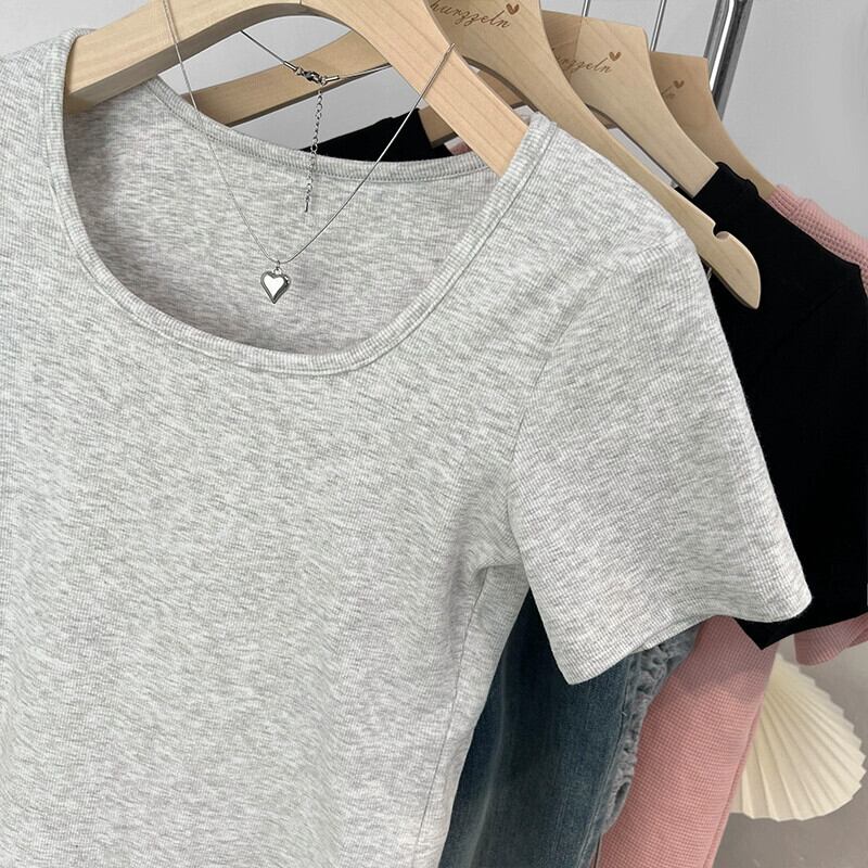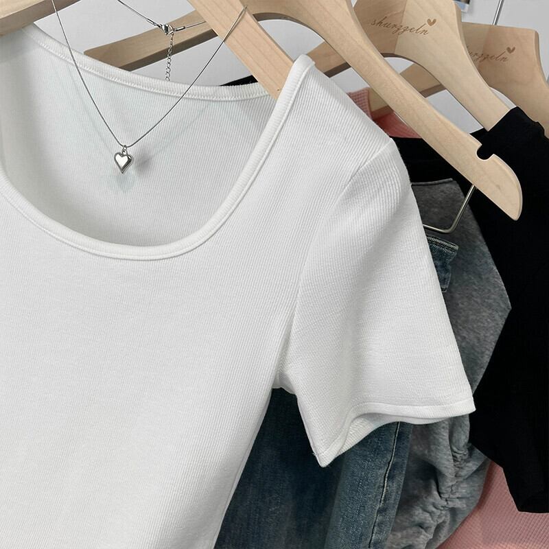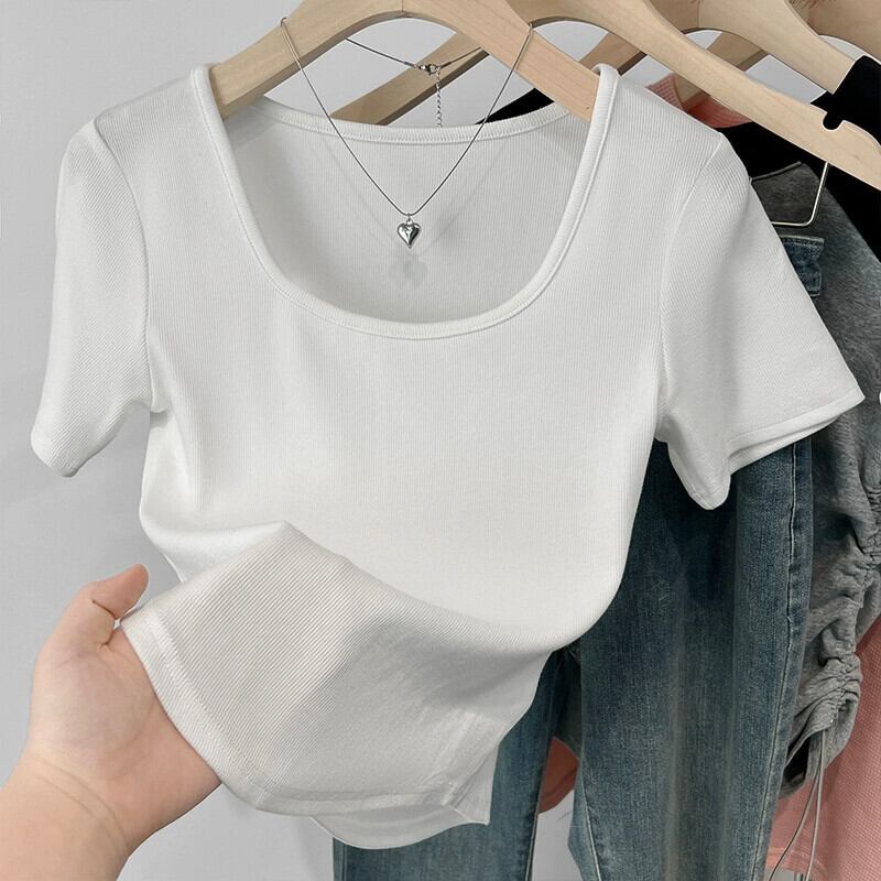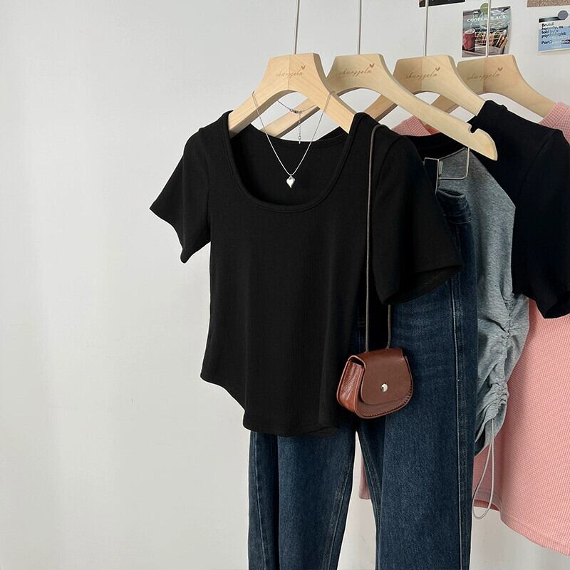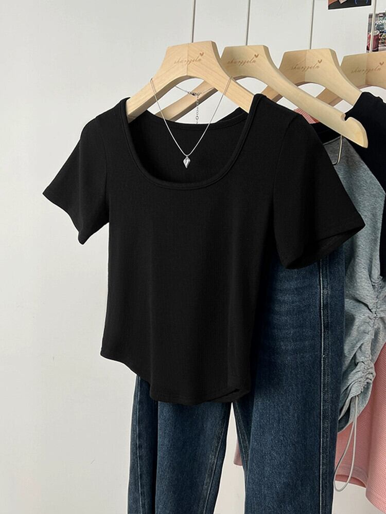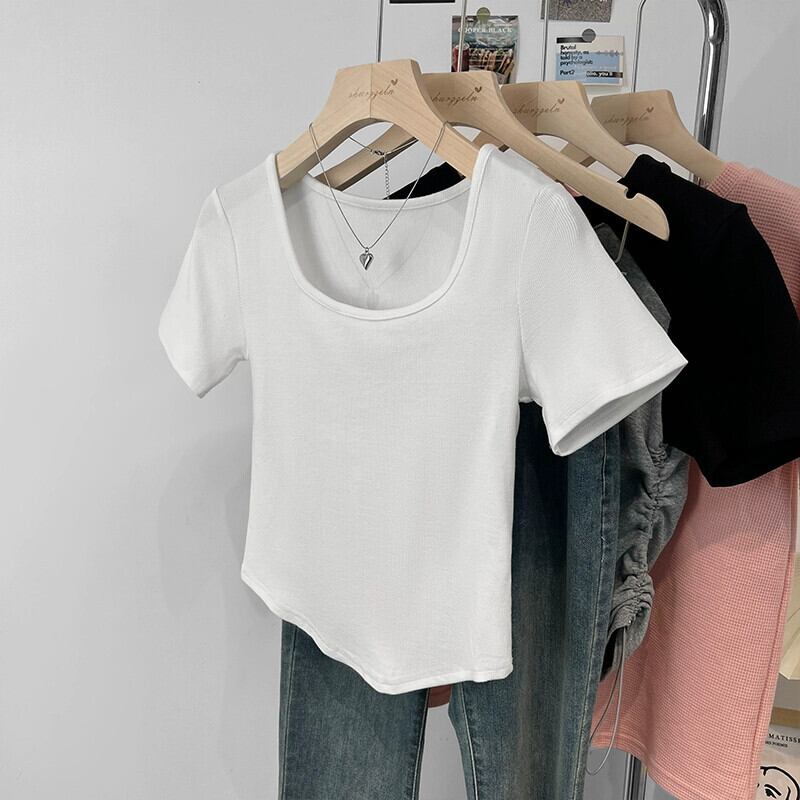 カーブヘムフロントショルダー半袖Tシャツレディース2023年夏新デザインセンススリムフィットと薄いショートスクエアカラートップ サマー 夏物 スクウェア 7460030664745524 | framboise21