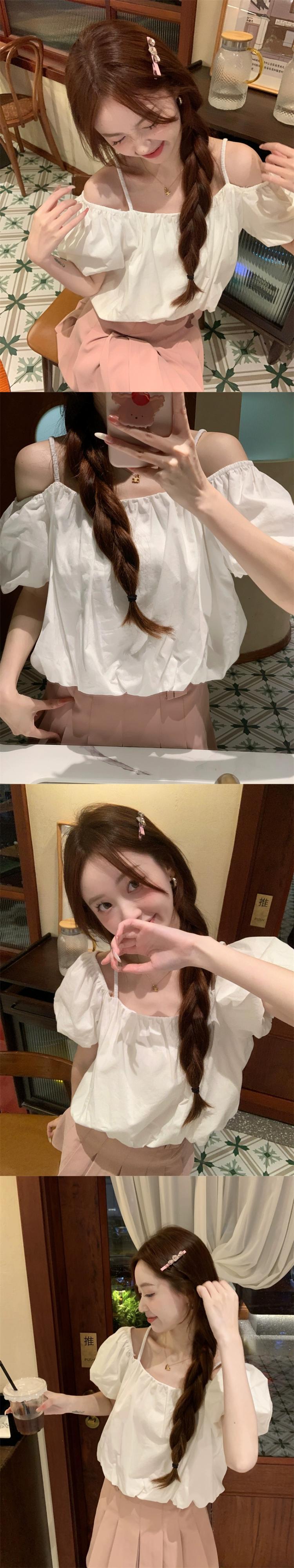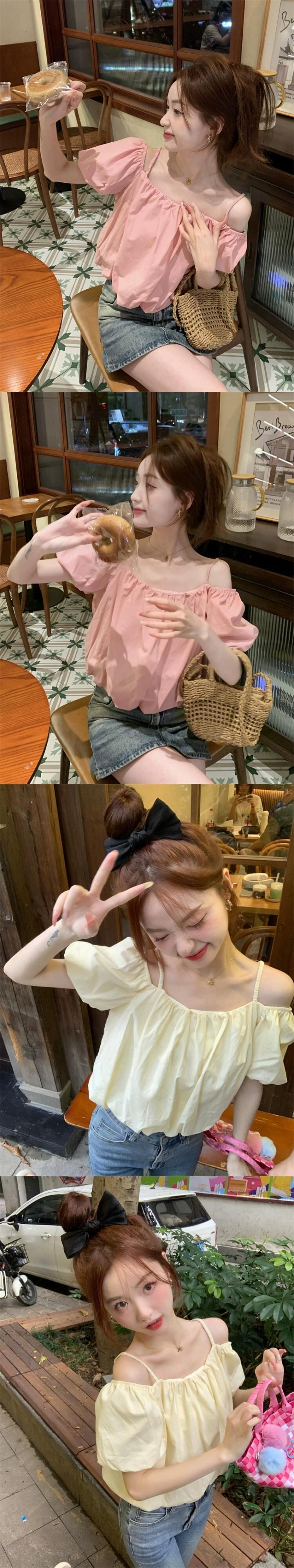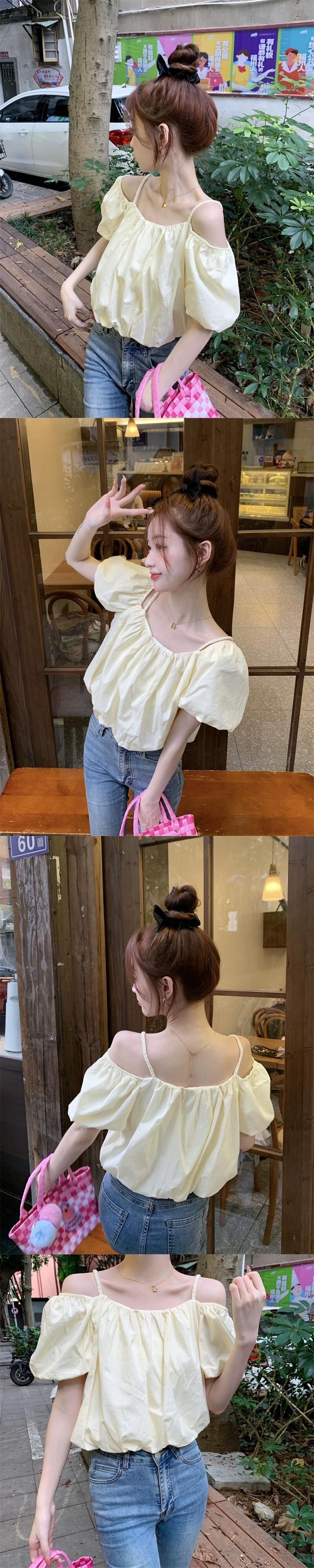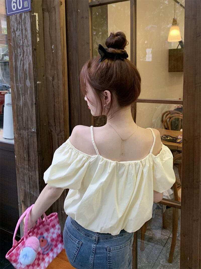 オフショルダーパフスリーブ半袖シャツレディース、夏のデザイン、ルーズでシックなシャツ、ショートサスペンダーワンショルダートップ サマー 夏物 7460017240306499 | framboise21