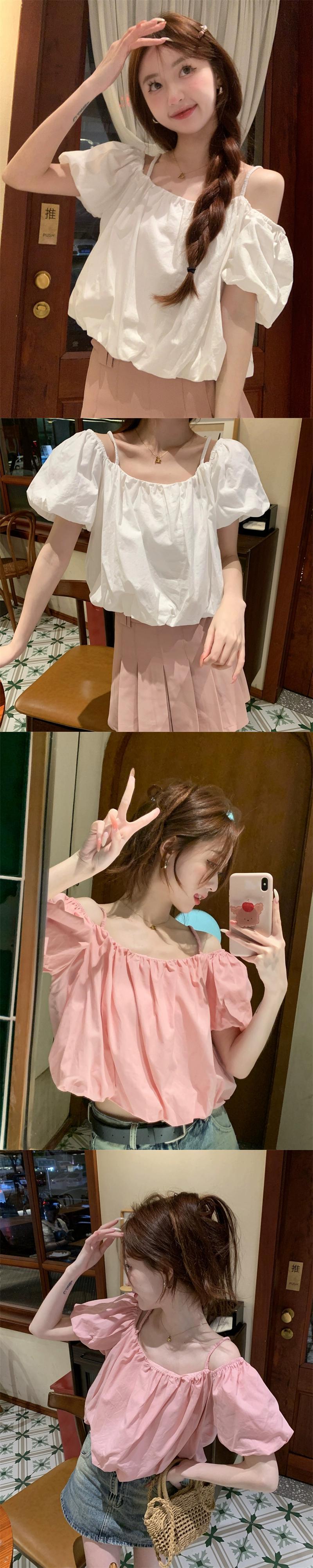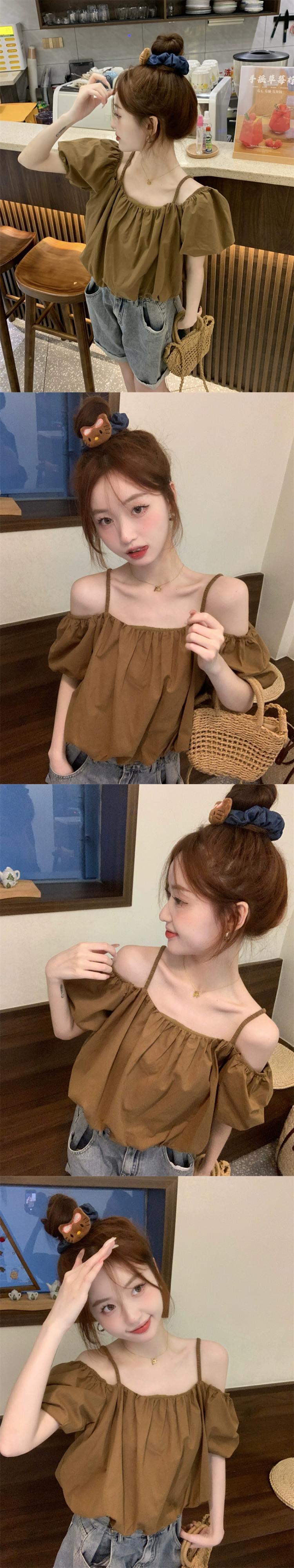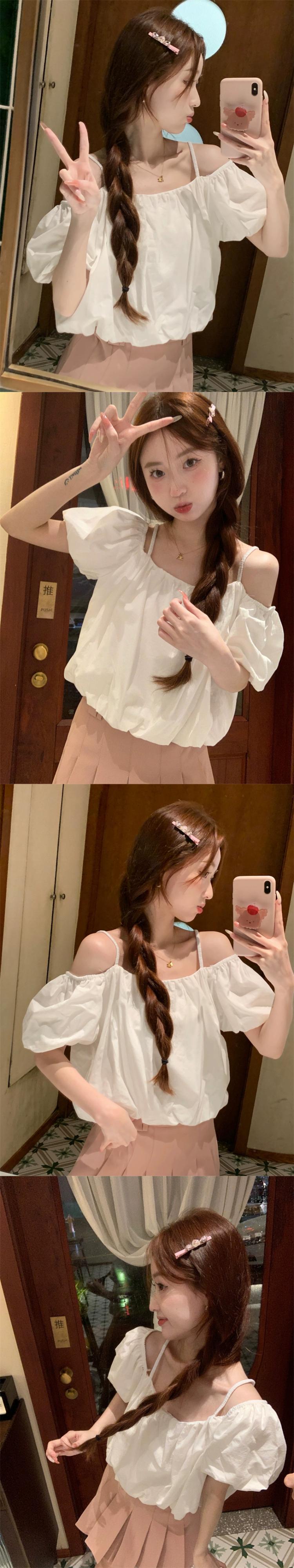 オフショルダーパフスリーブ半袖シャツレディース、夏のデザイン、ルーズでシックなシャツ、ショートサスペンダーワンショルダートップ サマー 夏物 7460017240306499 | framboise21