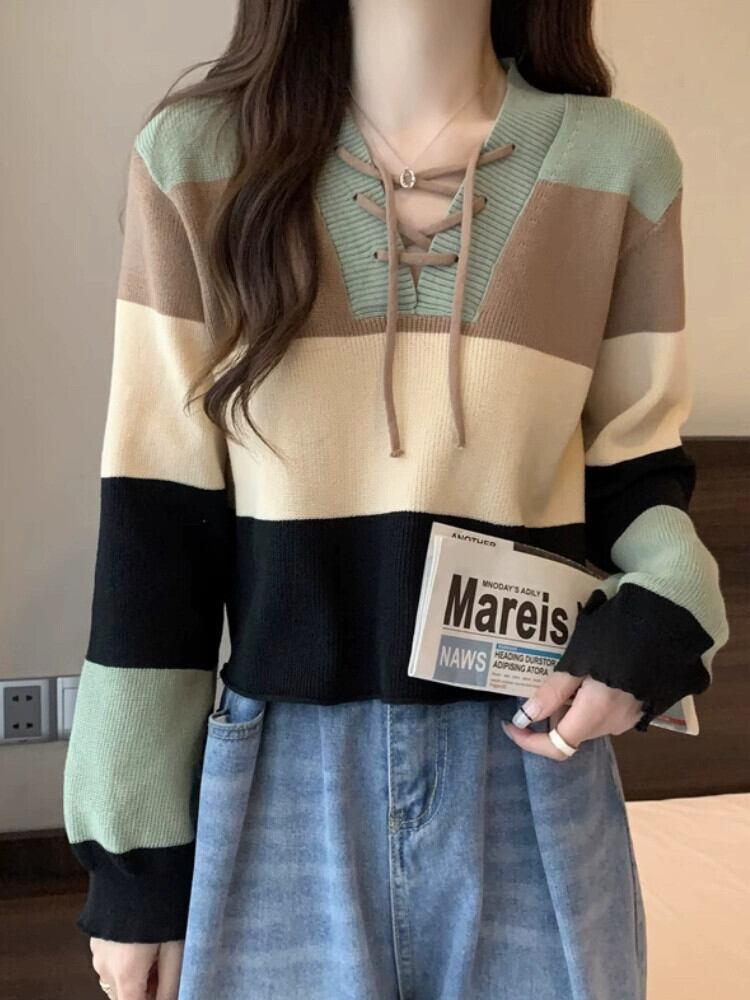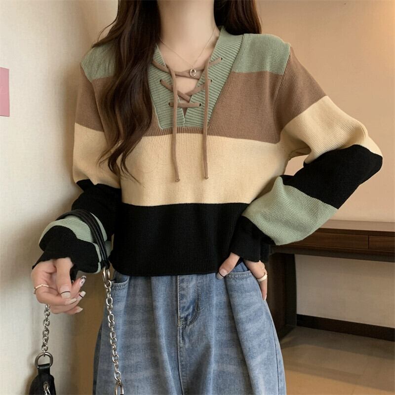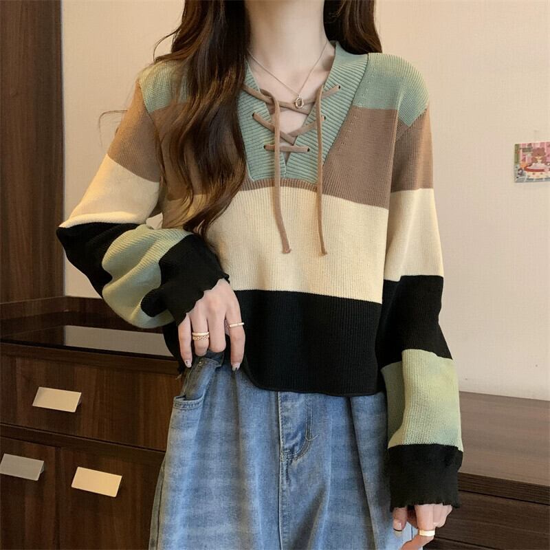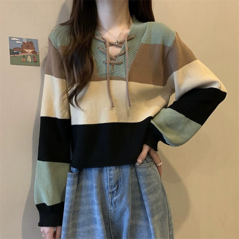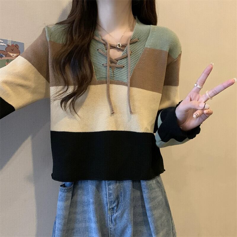 ストライプショートセーター女性の秋冬 2023 新デザインルーズアウターインナー V ネックボトミングセーター オータム 秋物 ウィンター 冬物 Vネック 7460073877546781 | framboise21