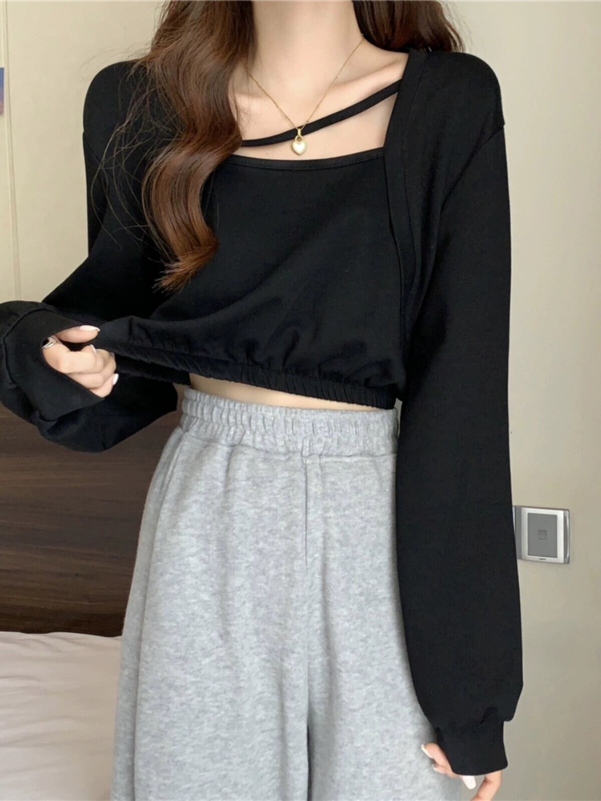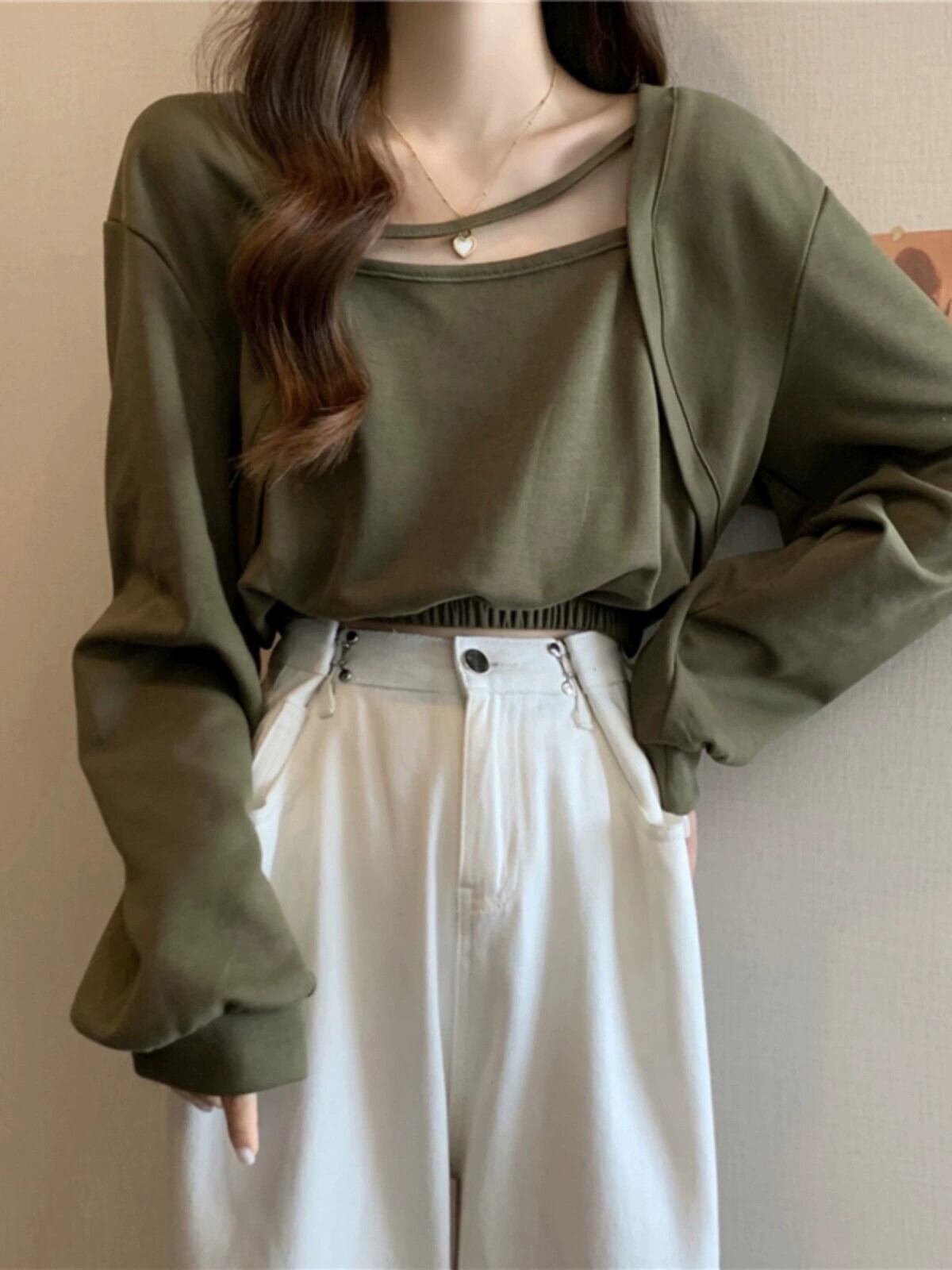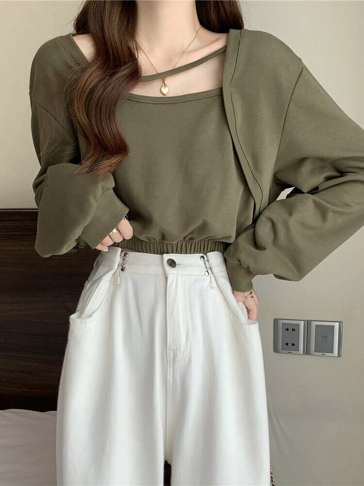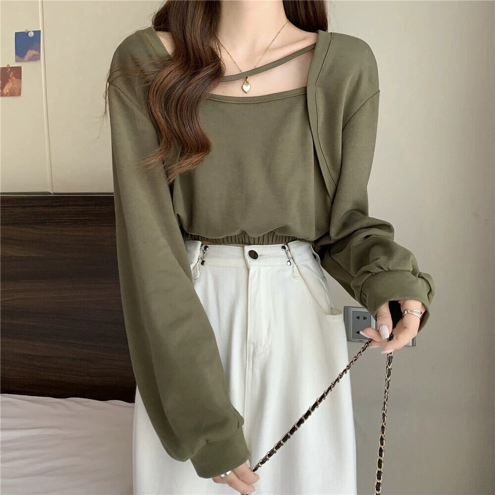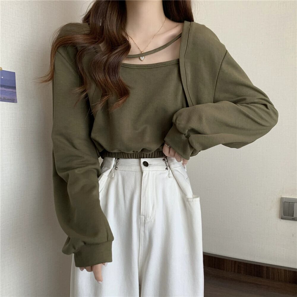 ショート偽ツーピースウエストトレーナー女性春と秋 2023 新しいスタイルの小さなデザインニッチ長袖トップ ロング スプリング 春物 オータム 秋物 7460094085731427 | framboise21