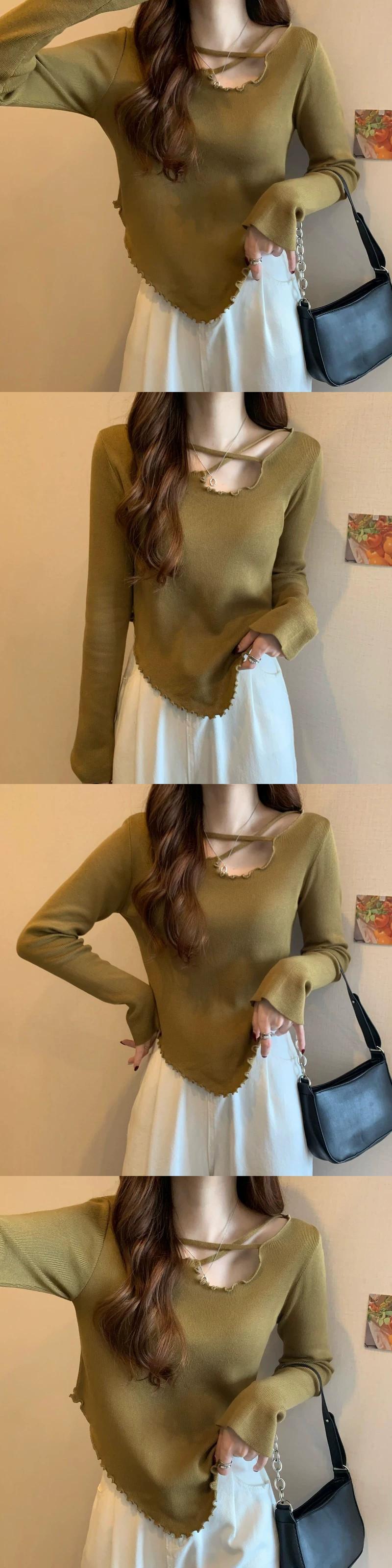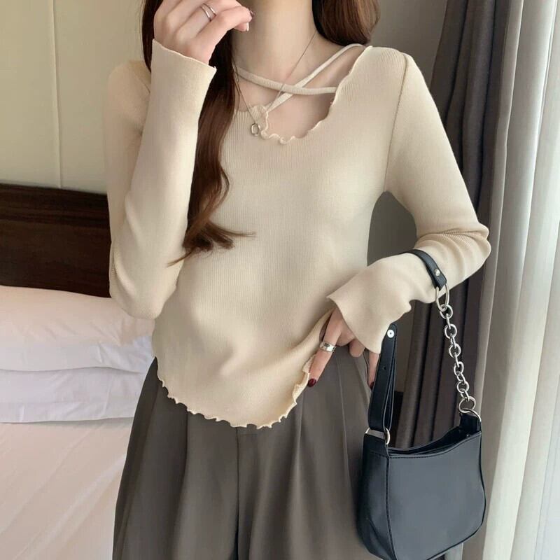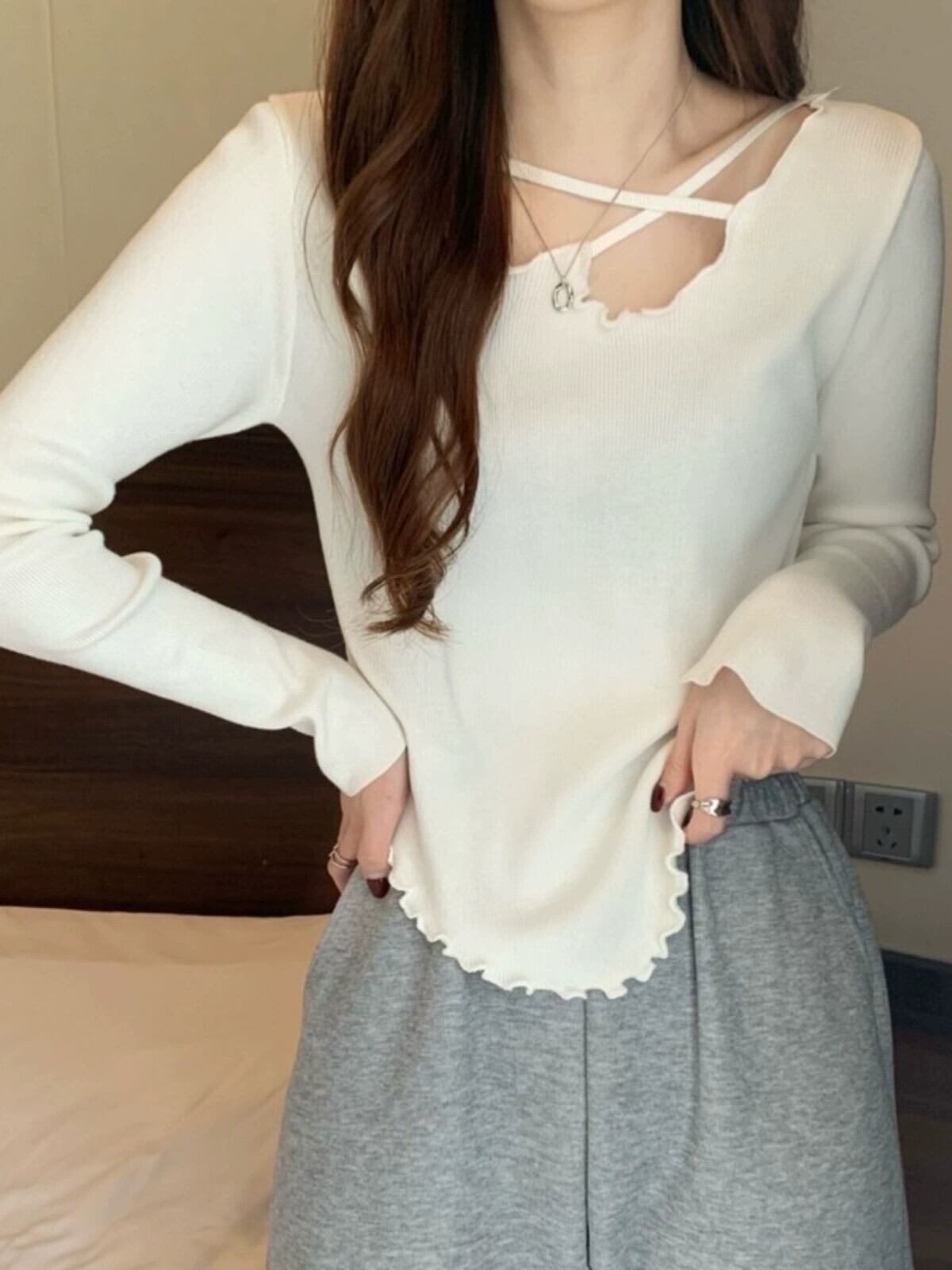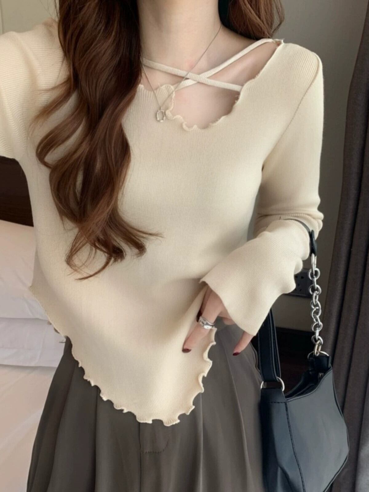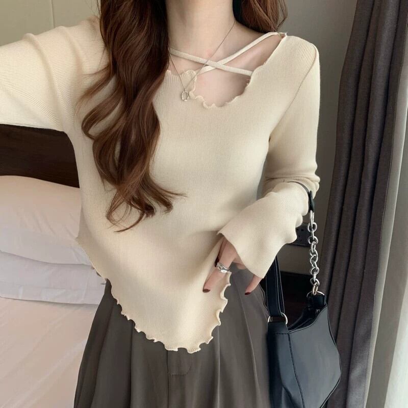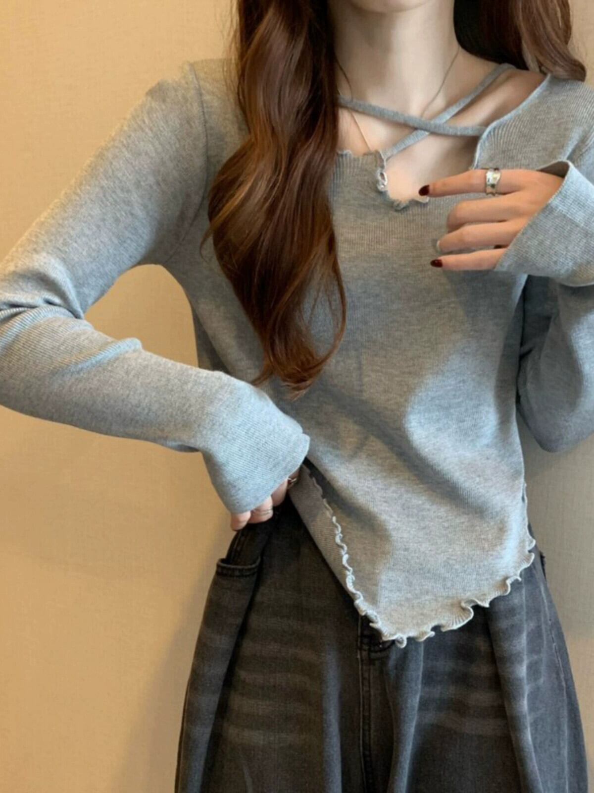 春と秋の長袖ショートトップ女性、ニットボトムシャツ、ファッショナブルなデザイン、不規則なVネックセーター ロング スプリング 春物 オータム 秋物 7460084696750146 | framboise21