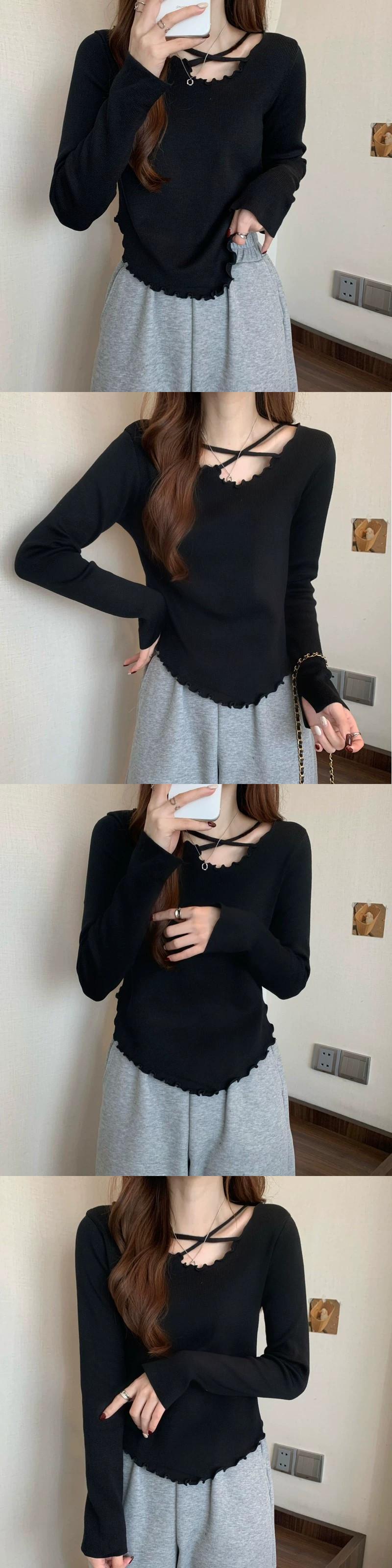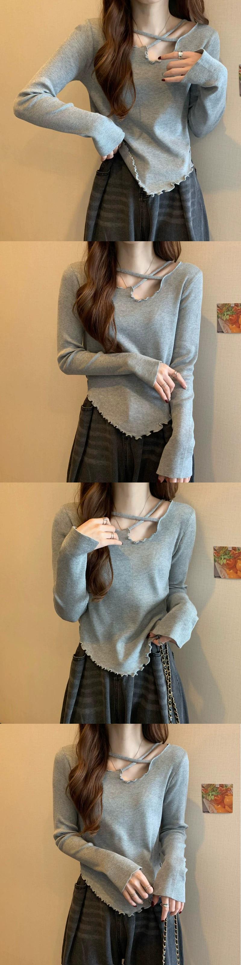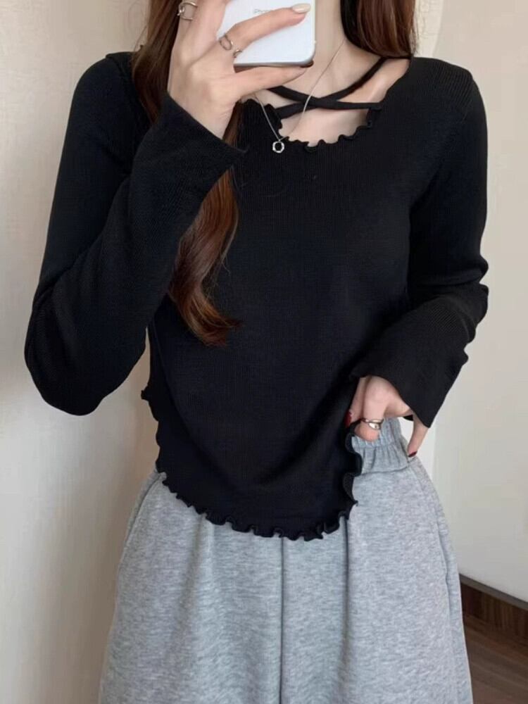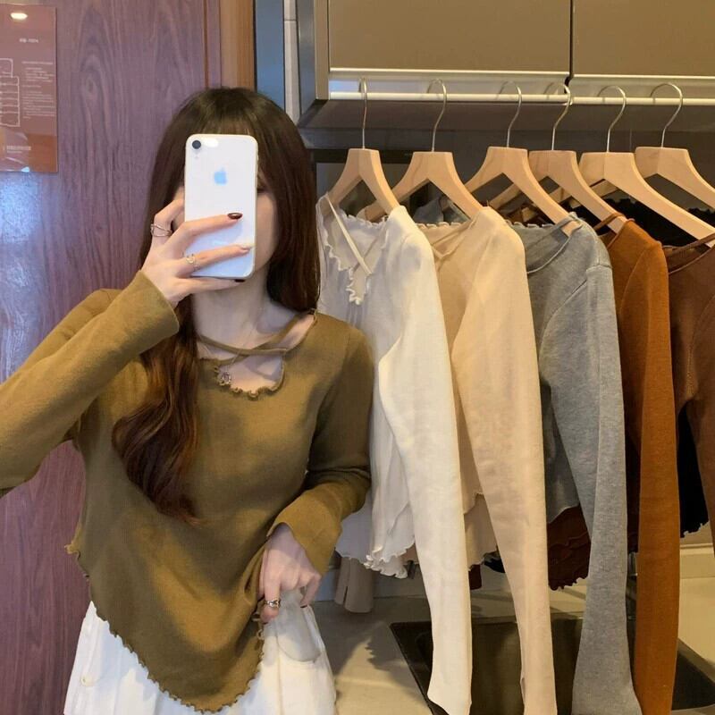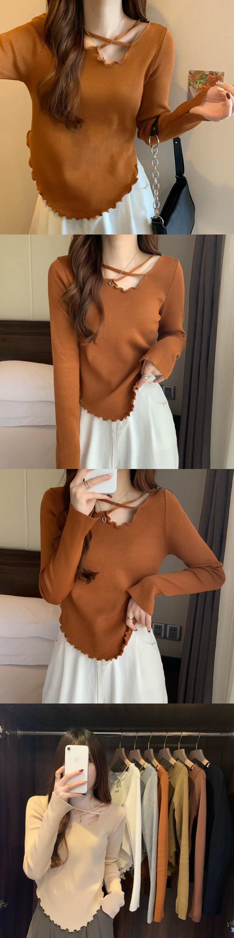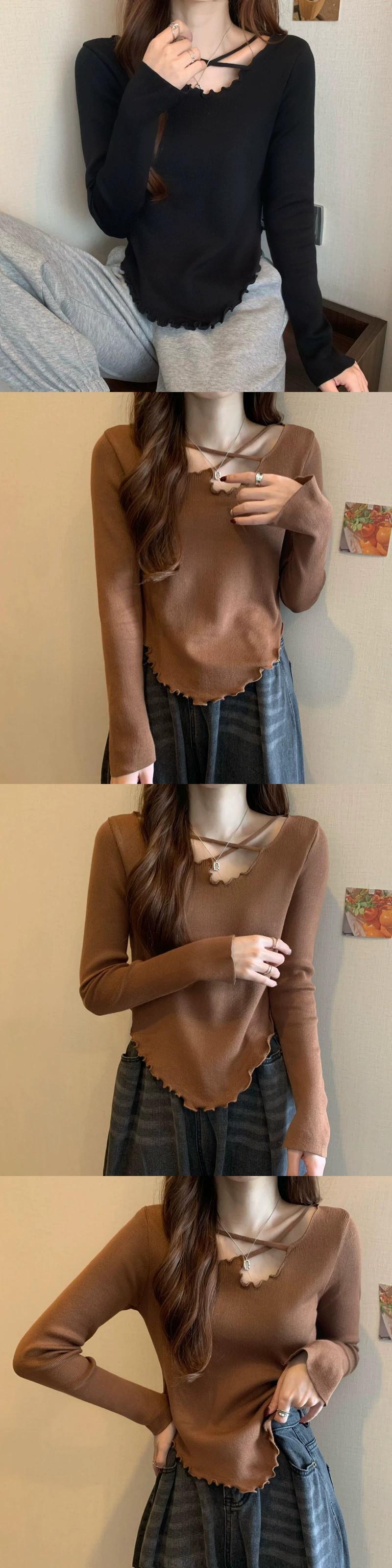 春と秋の長袖ショートトップ女性、ニットボトムシャツ、ファッショナブルなデザイン、不規則なVネックセーター ロング スプリング 春物 オータム 秋物 7460084696750146 | framboise21