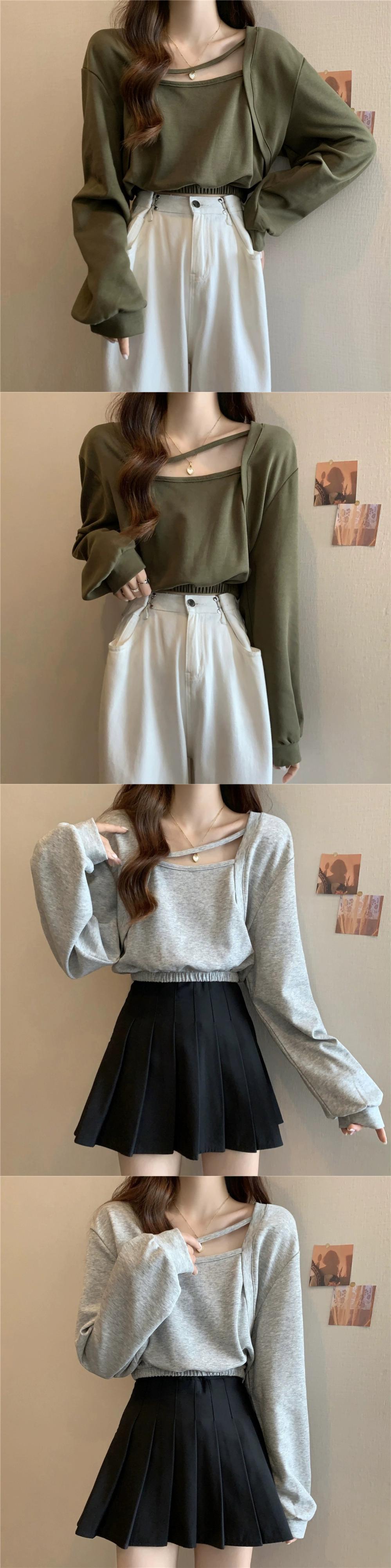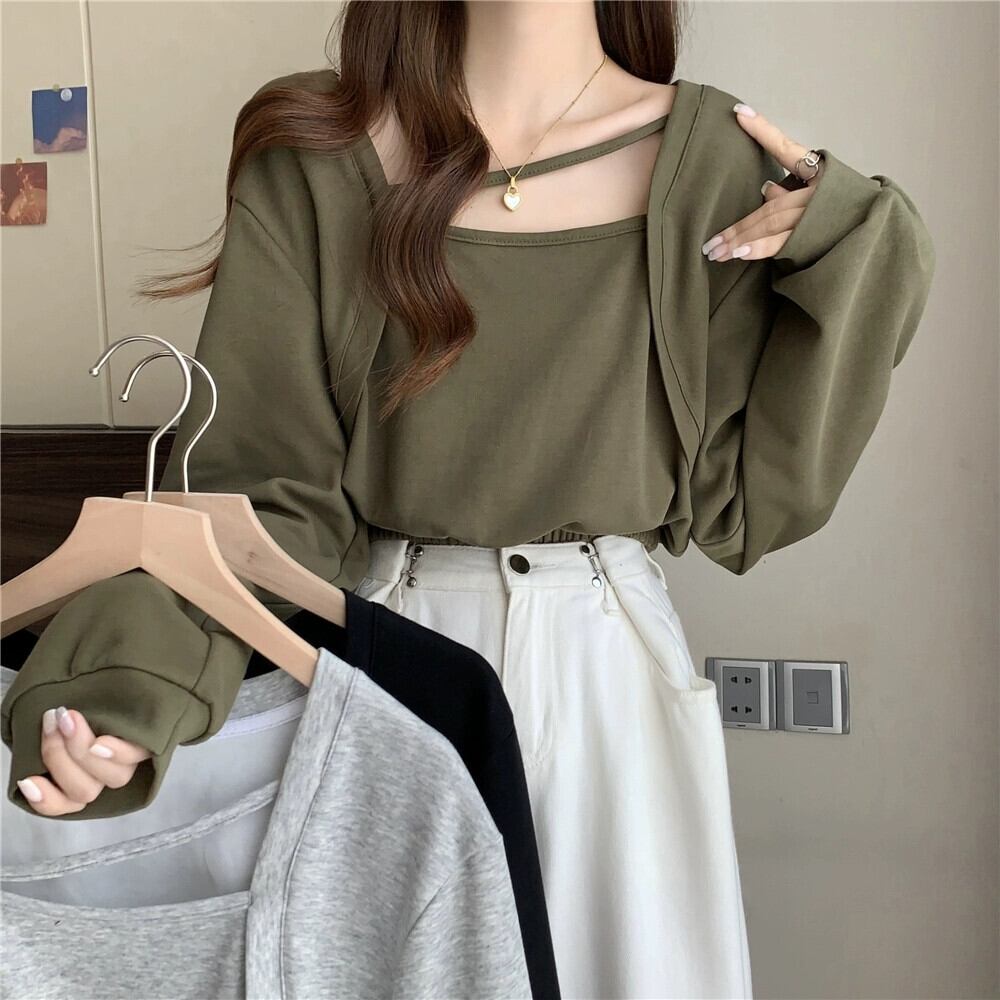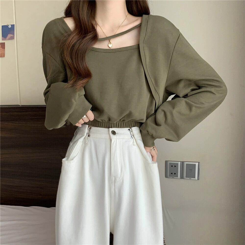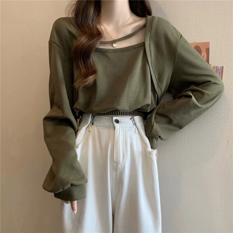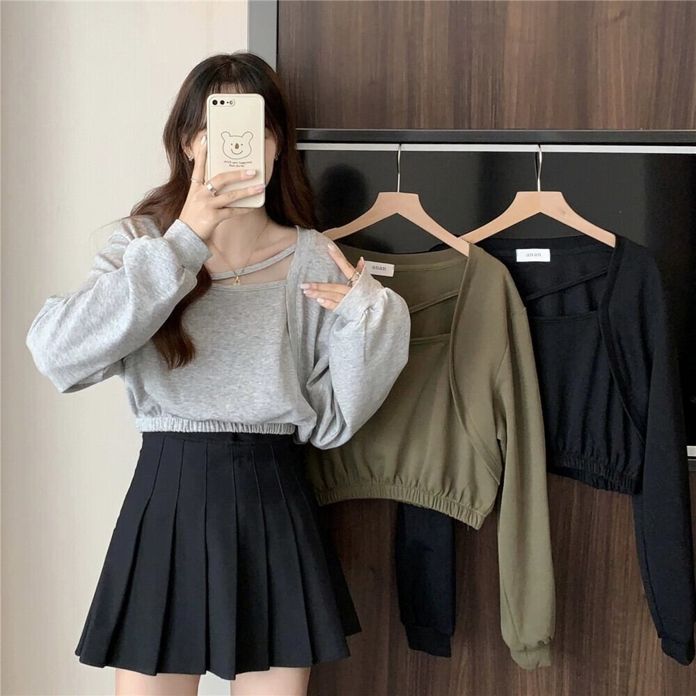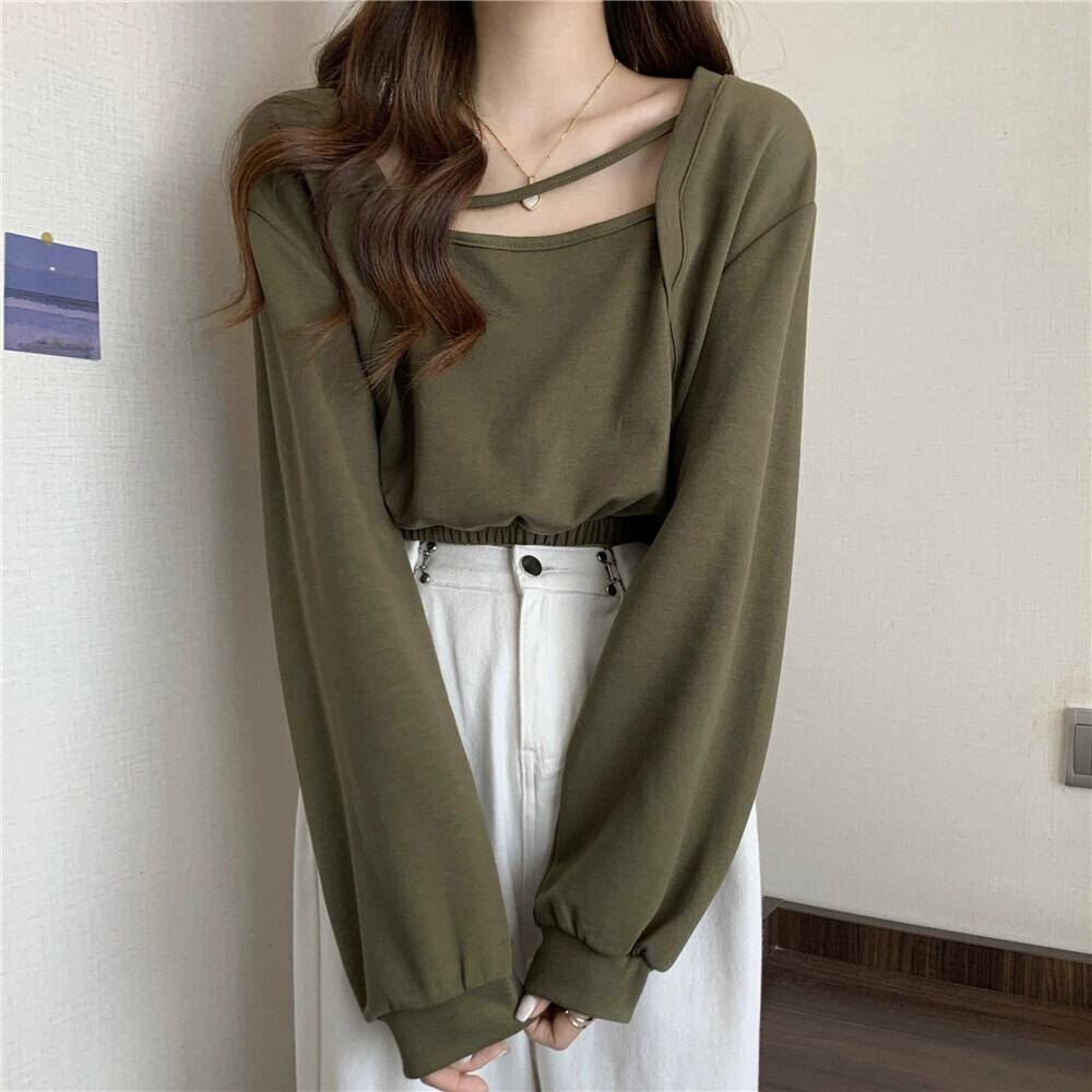 フレンチ鎖骨スクエアカラースウェットシャツ女性春と秋ニッチユニークなデザインシックなルーズショートフェイクツーピース長袖トップ ロング スプリング 春物 オータム 秋物 スクウェア 7460024229529883 | framboise21