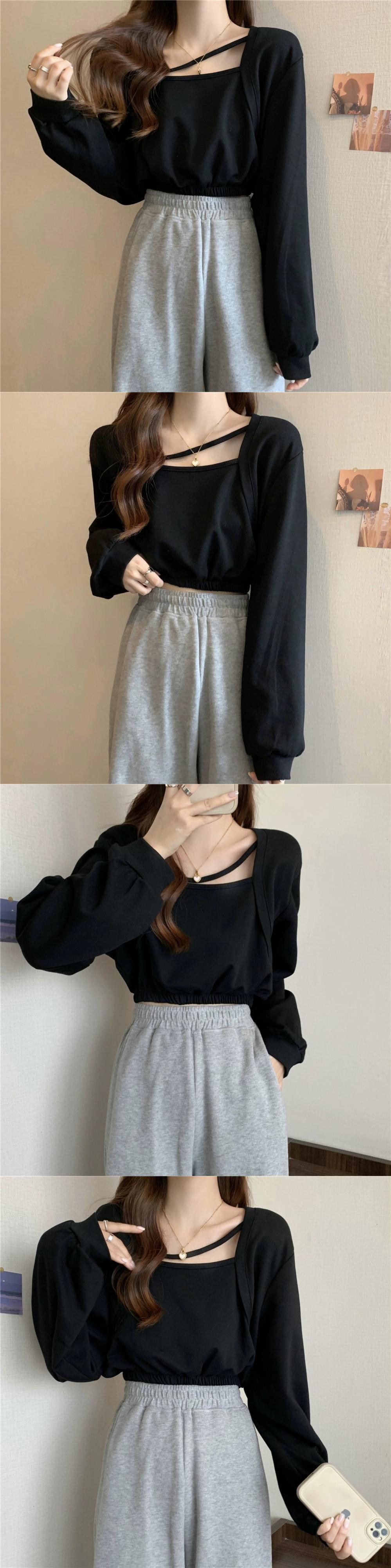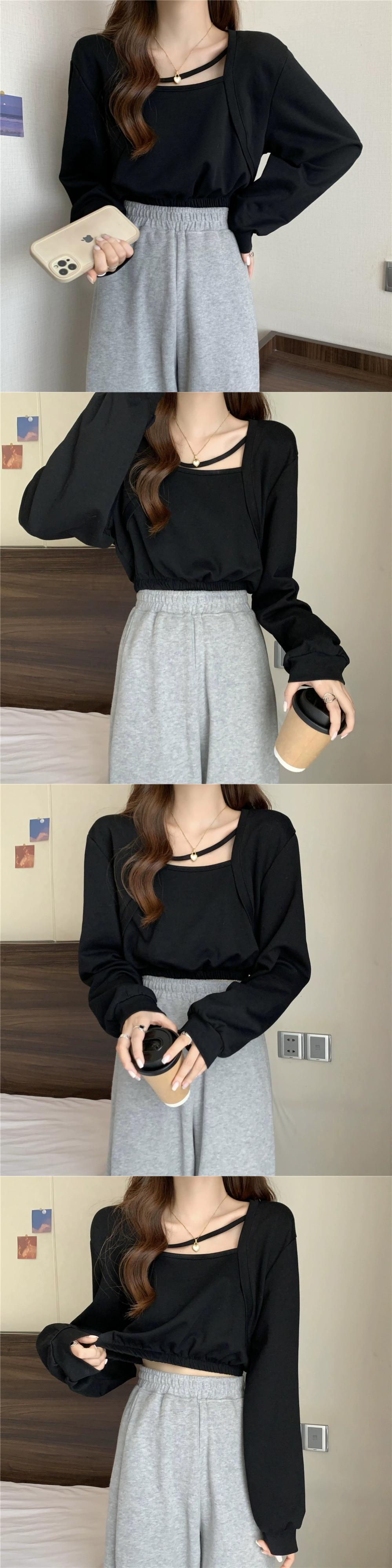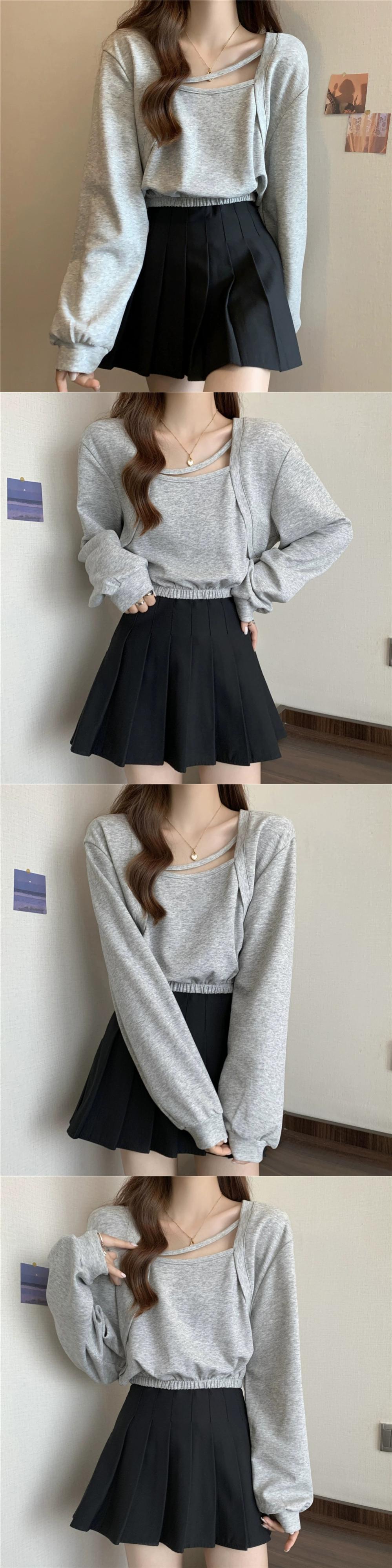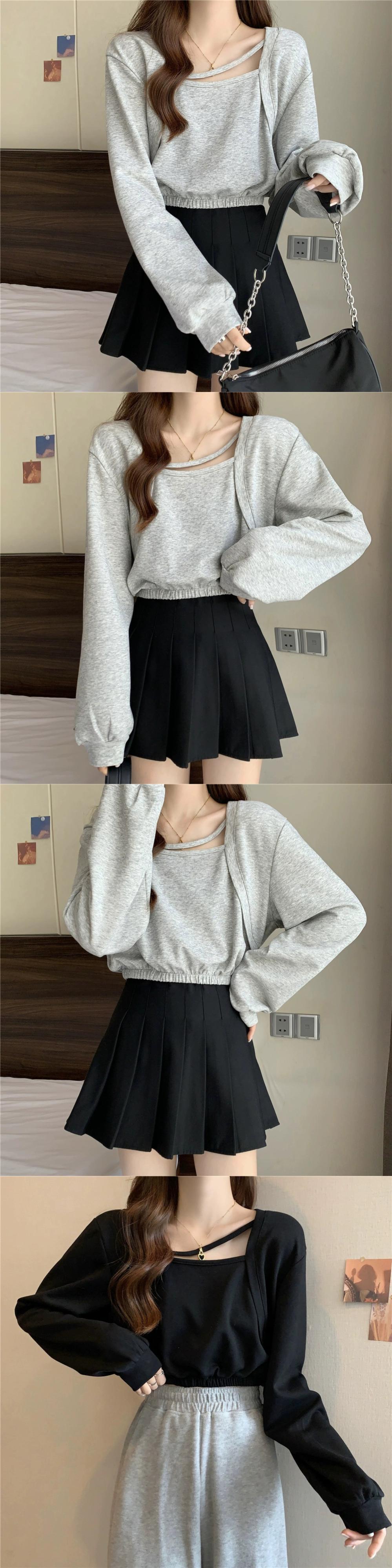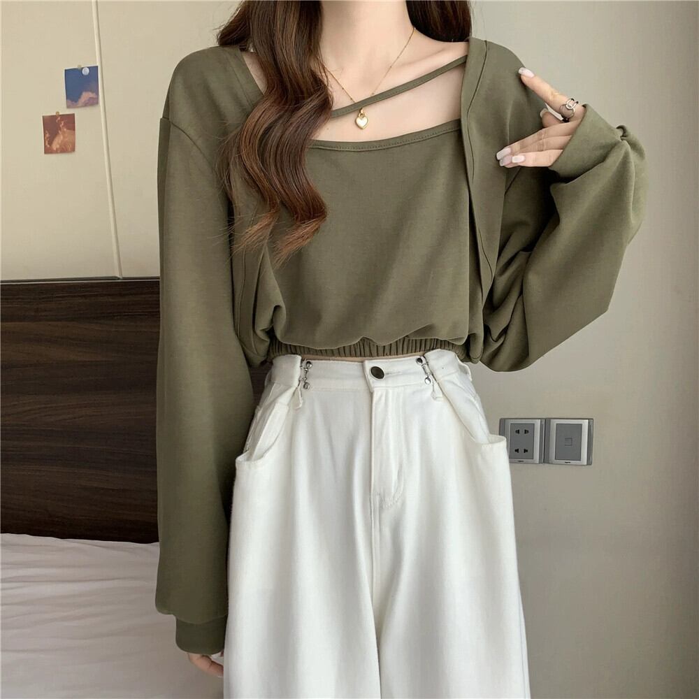 フレンチ鎖骨スクエアカラースウェットシャツ女性春と秋ニッチユニークなデザインシックなルーズショートフェイクツーピース長袖トップ ロング スプリング 春物 オータム 秋物 スクウェア 7460024229529883 | framboise21