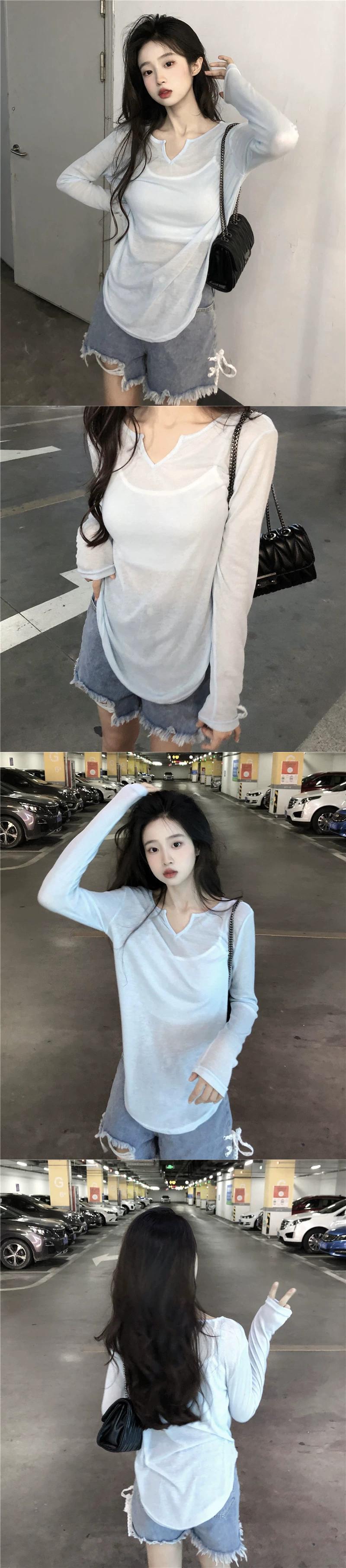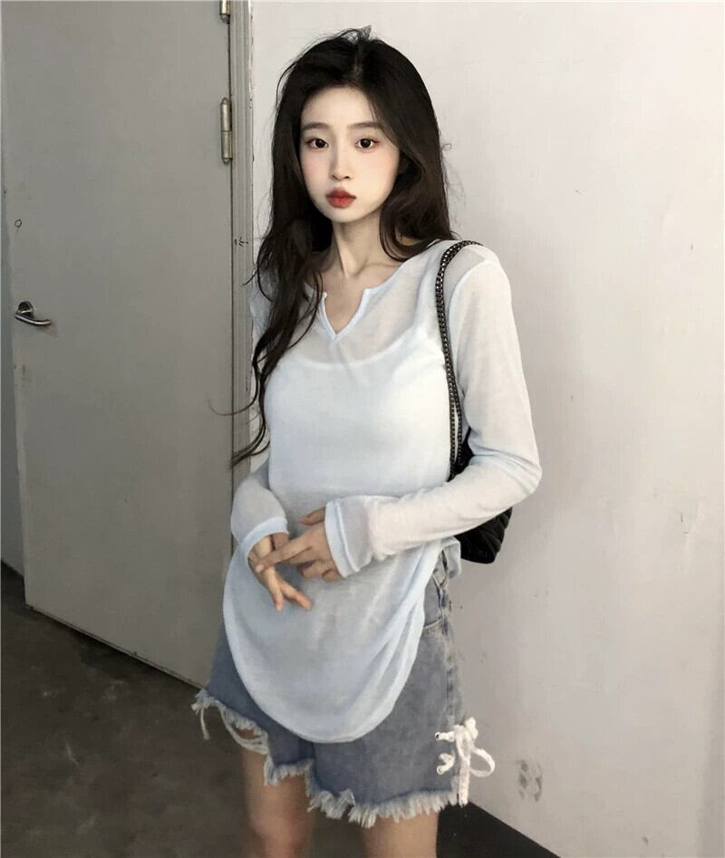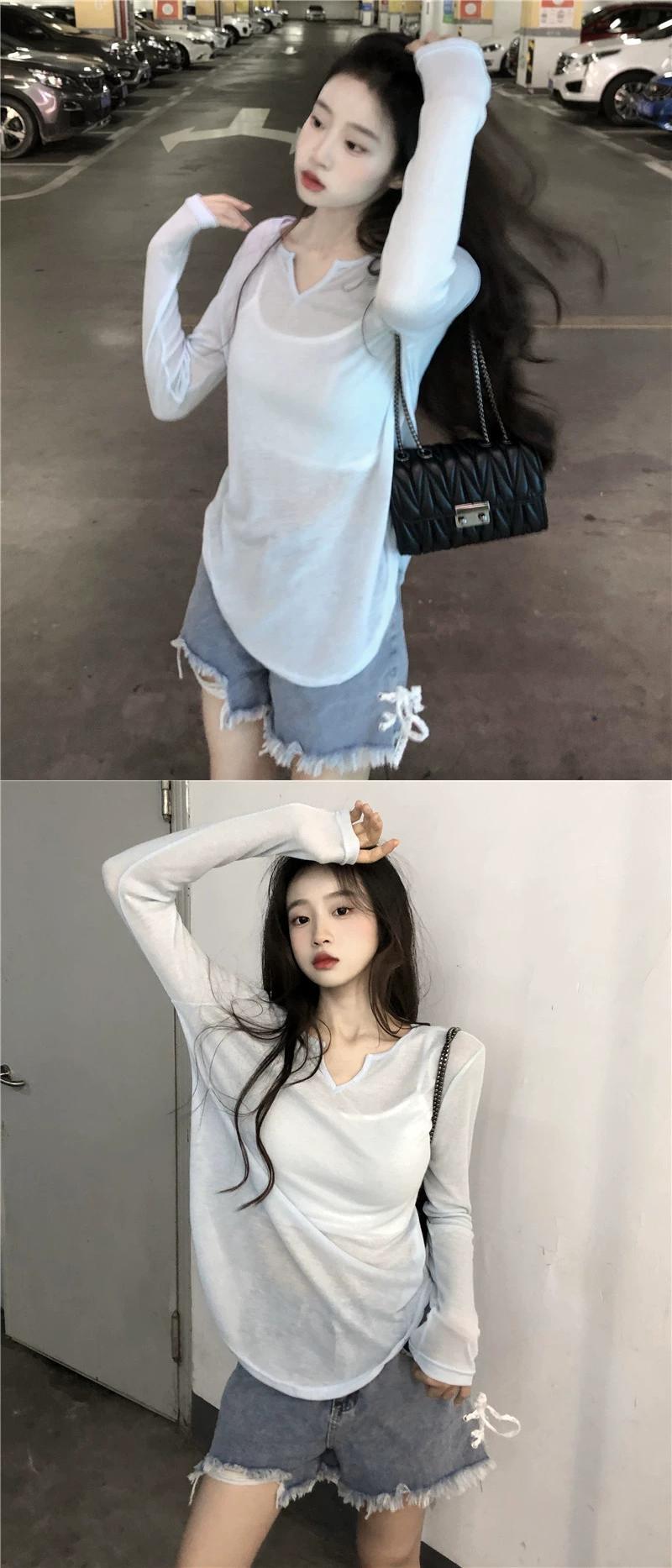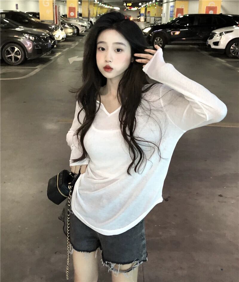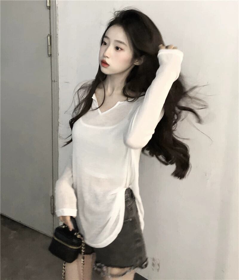 ゆるくてセクシーなデザインの夏の不規則な V ネック T シャツの女性、薄い日焼け止めシャツ、カバーアップ、シースルーの長袖トップ、トレンディな ロング サマー 夏物 Vネック Tシャツ 7460030916109861 | framboise21