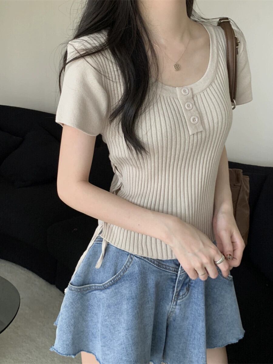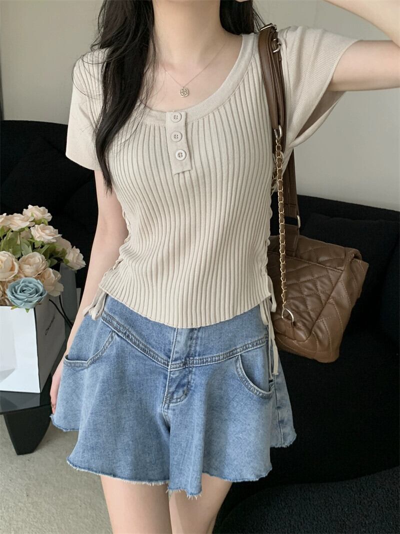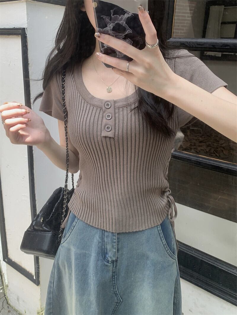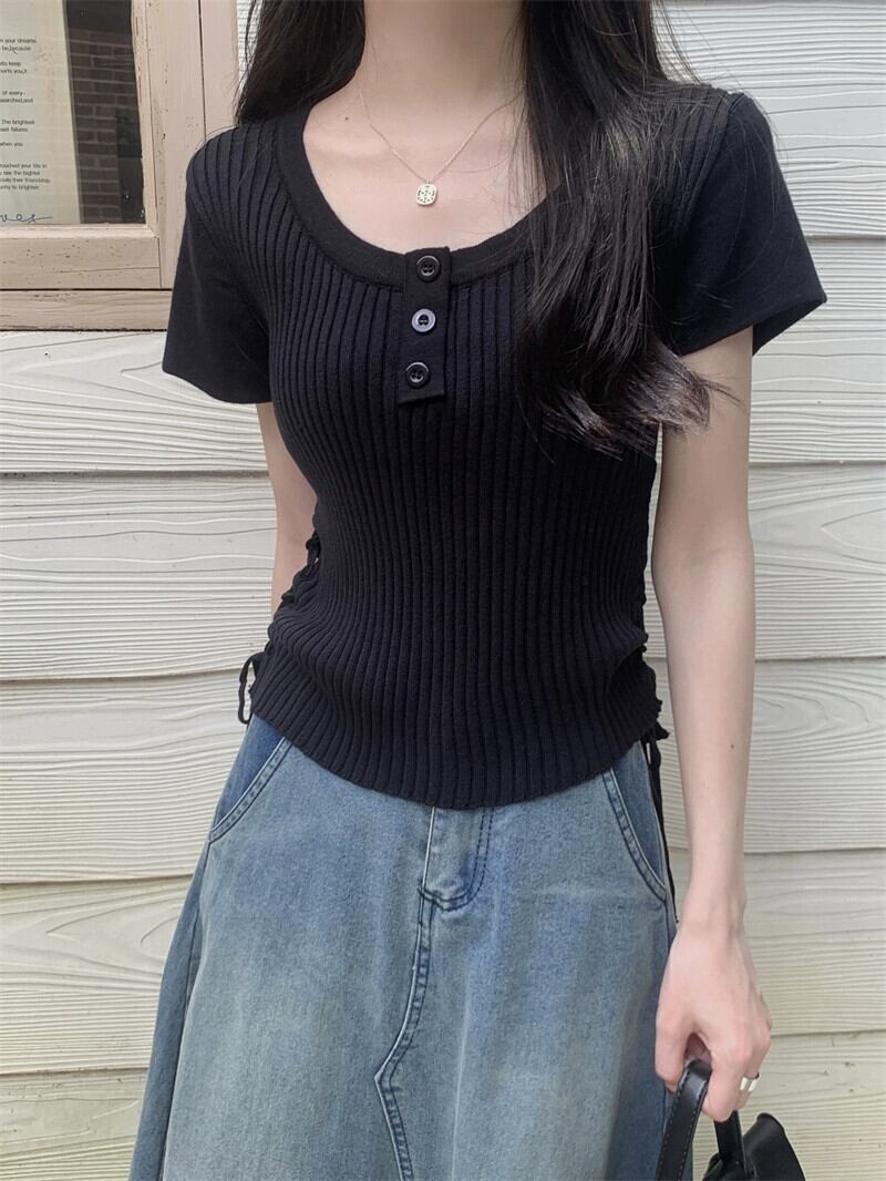 黒のニット半袖 T シャツの女性、夏のシックなデザイン、痩身、不規則、ショート、右肩ドローストリング トップ ブラック サマー 夏物 Tシャツ 7460079415976759 | framboise21