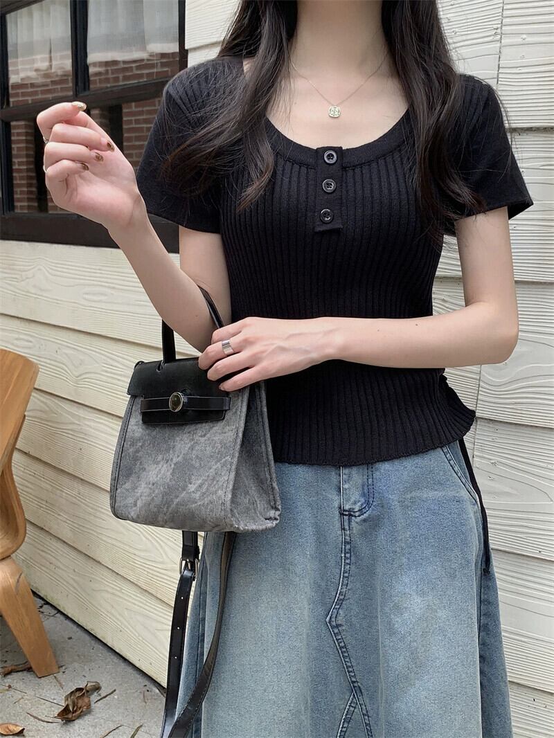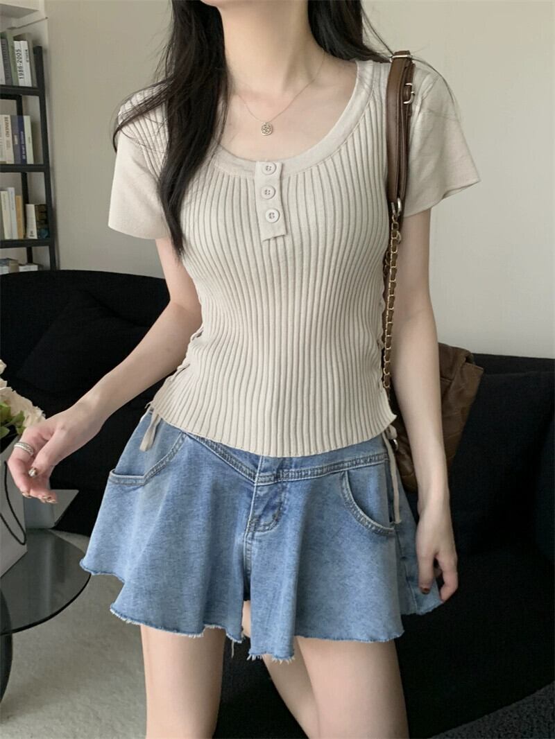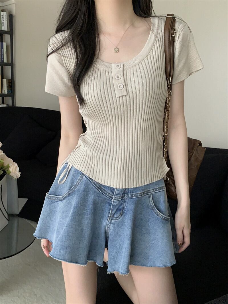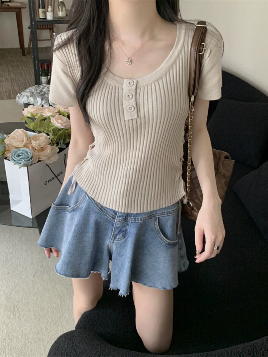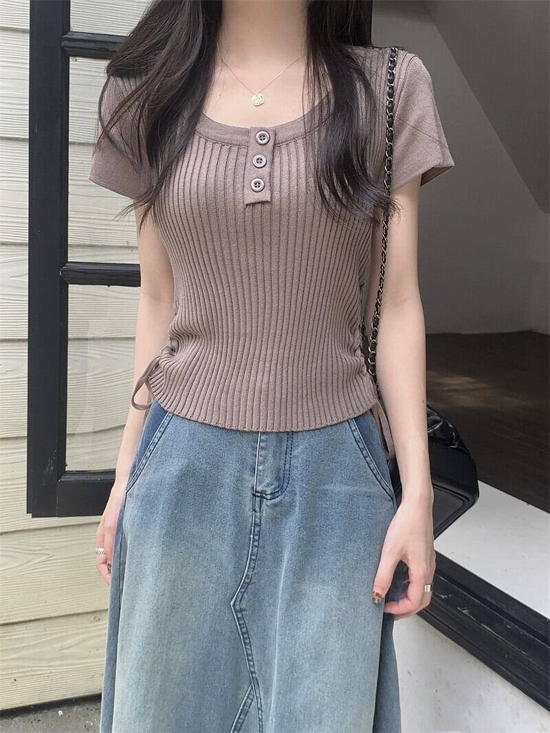 黒のニット半袖 T シャツの女性、夏のシックなデザイン、痩身、不規則、ショート、右肩ドローストリング トップ ブラック サマー 夏物 Tシャツ 7460079415976759 | framboise21