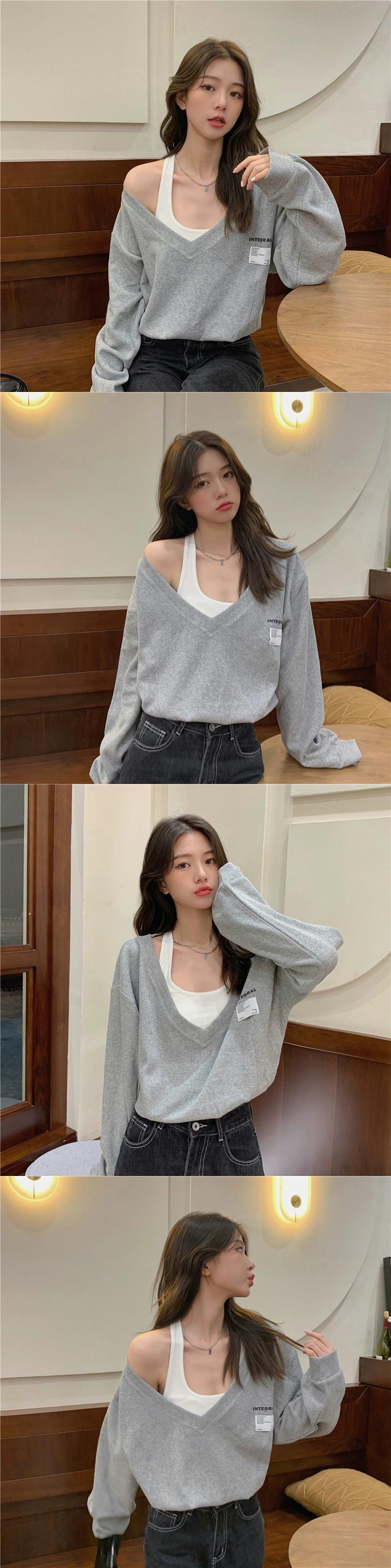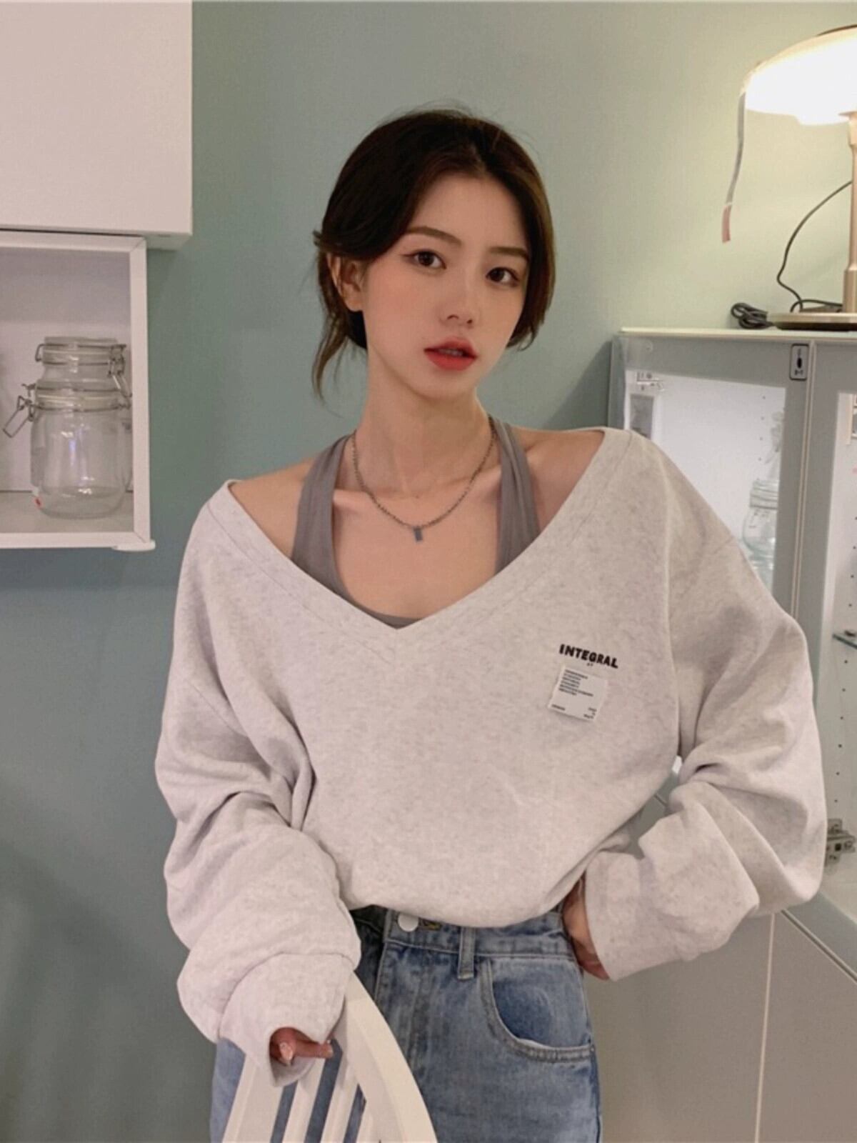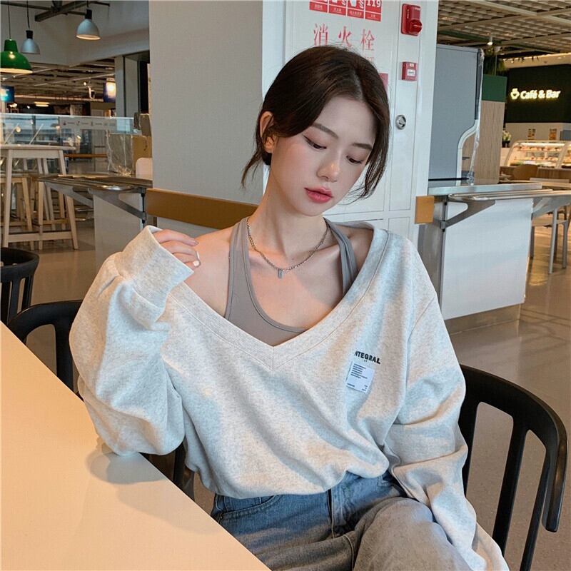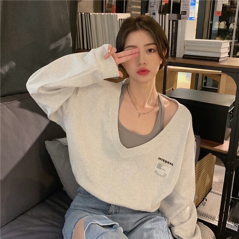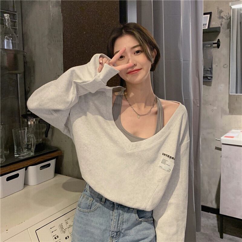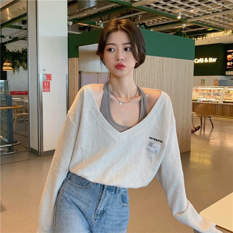 ホルターネックフェイクツーピースショートスウェットシャツ女性の春と秋のデザインニッチルーズ多用途プルオーバー長袖トップトレンディなイン ロング スプリング 春物 オータム 秋物 7460033198513748 | framboise21
