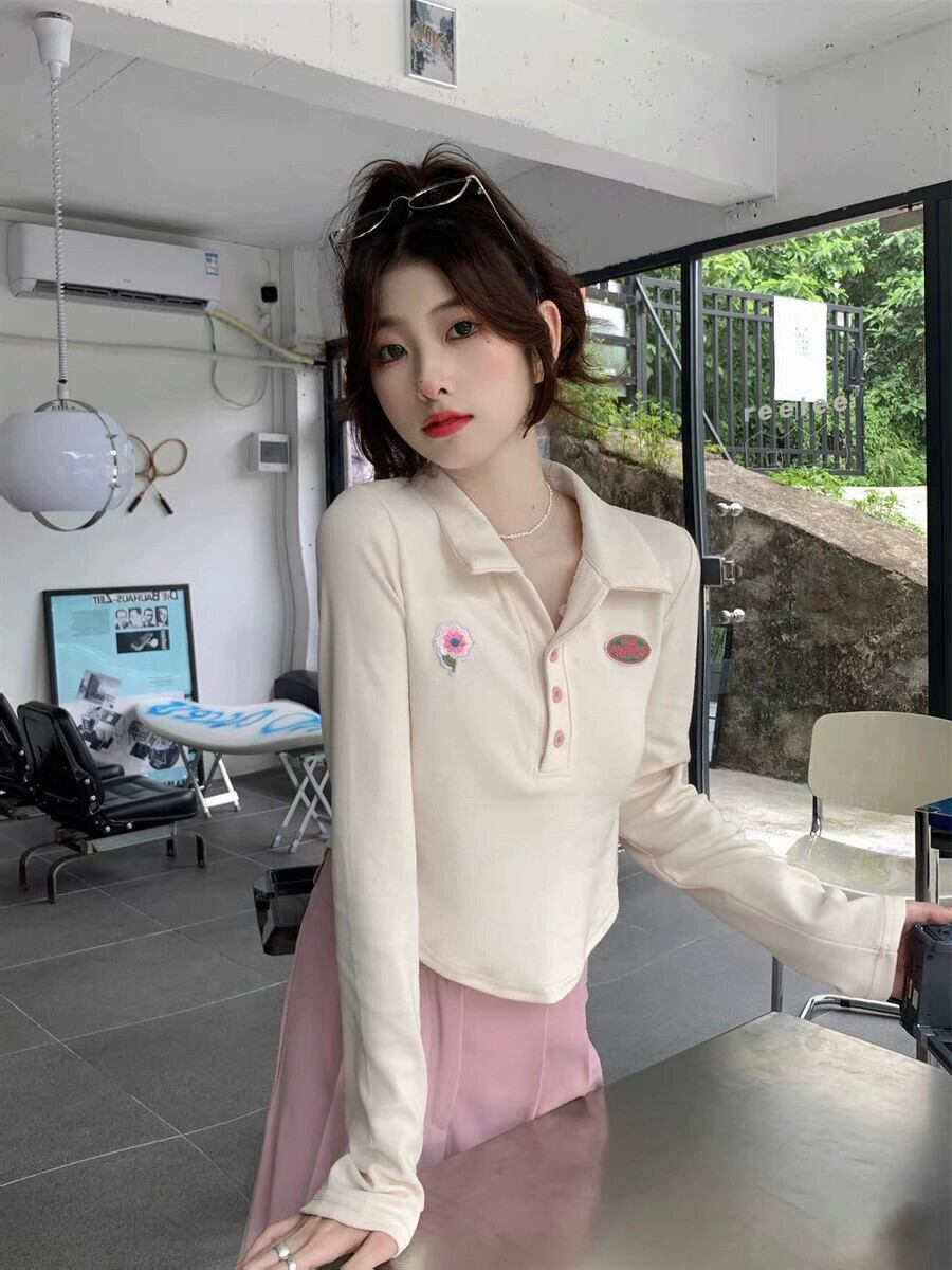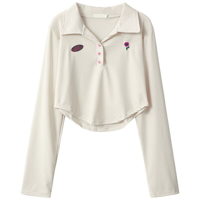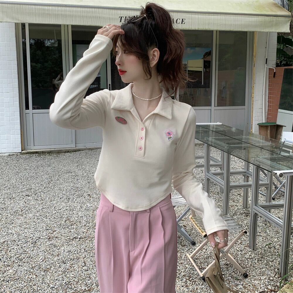 春と秋の不規則な長袖Tシャツの女性、甘いデザイン、スリムフィット、短い底のポロカラーのトップス、小柄な人 ショート ロング 大人ガーリー スウィート キュート カジュアル スプリング 春物 オータム 秋物 7460021007119828 | framboise21