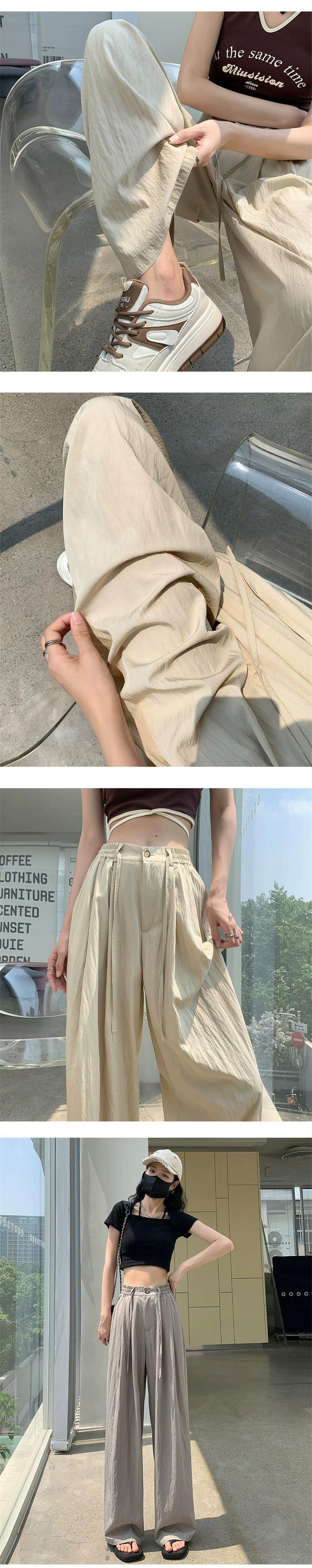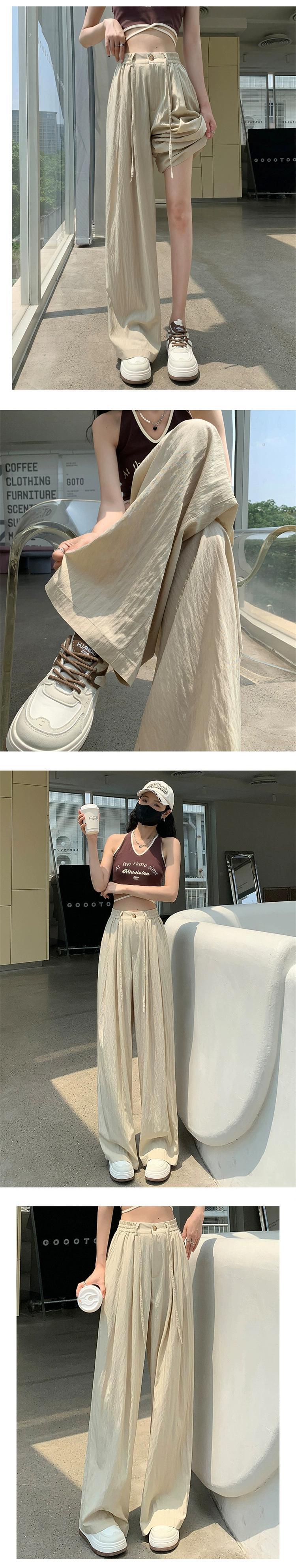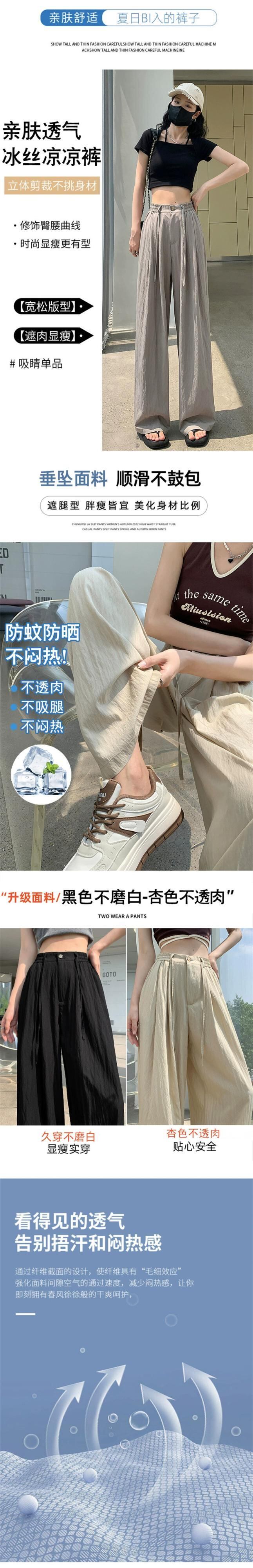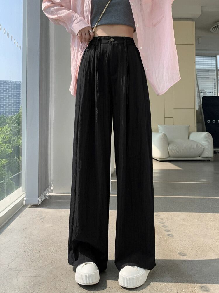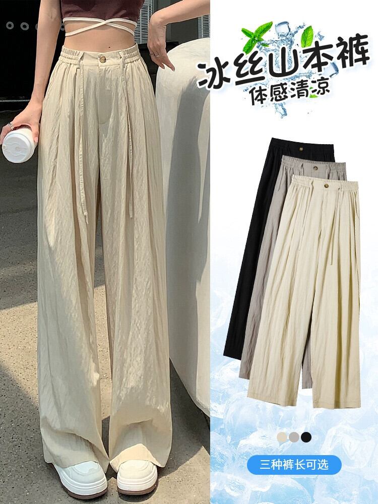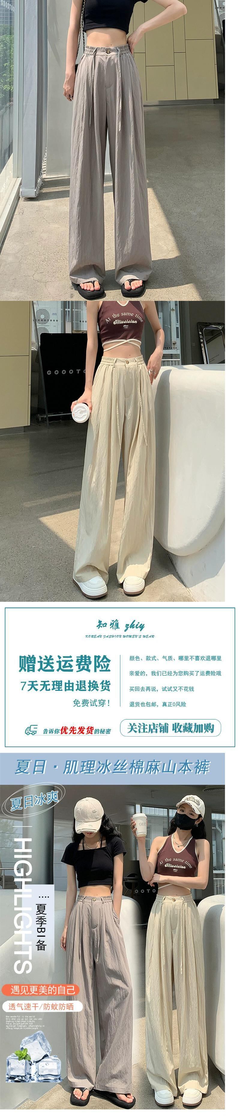 ドレーピーコットンとリネンのワイドレッグパンツレディース、夏用の薄いアイスシルクストレートパンツ、カジュアルなルーズハイウエストスリムフロアレングスのヤマモトパンツ サマー 夏物 746005225638566 | framboise21