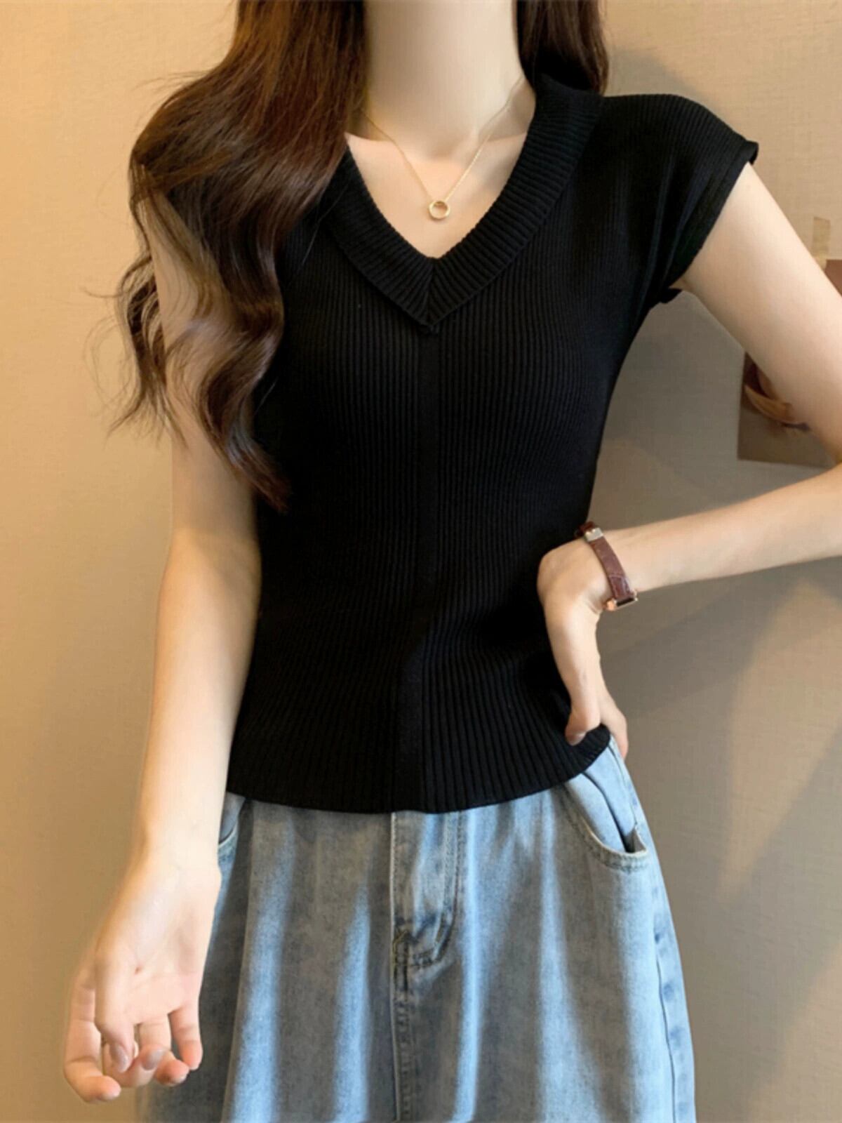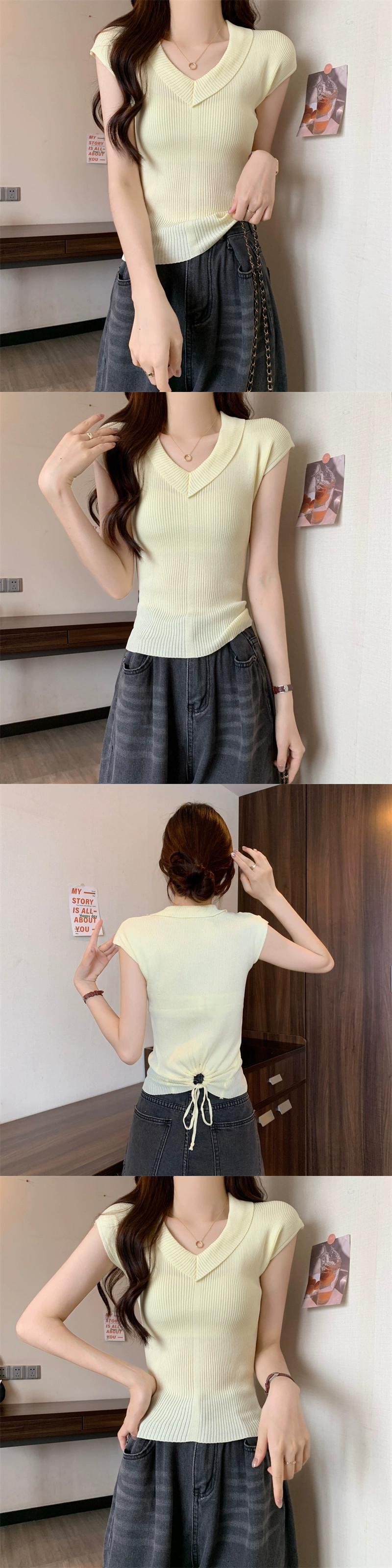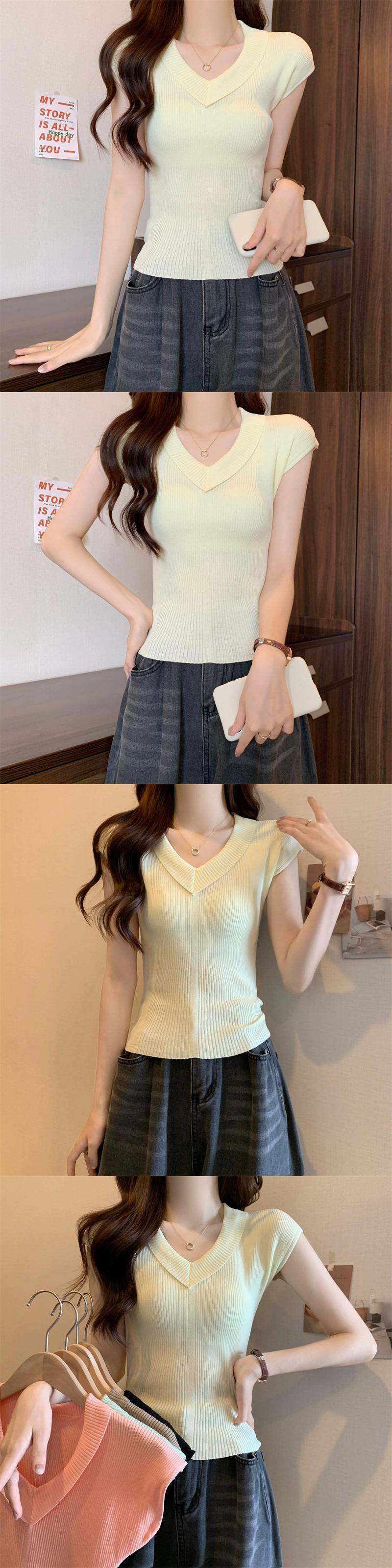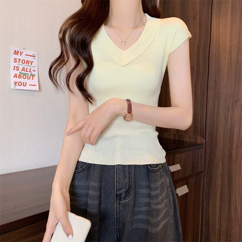 薄い氷のシルクニット半袖 Tシャツ女性の夏の 2023 新しいスリムフィットと多用途右肩ノースリーブ V ネックトップ サマー 夏物 Vネック 7460054667506679 | framboise21