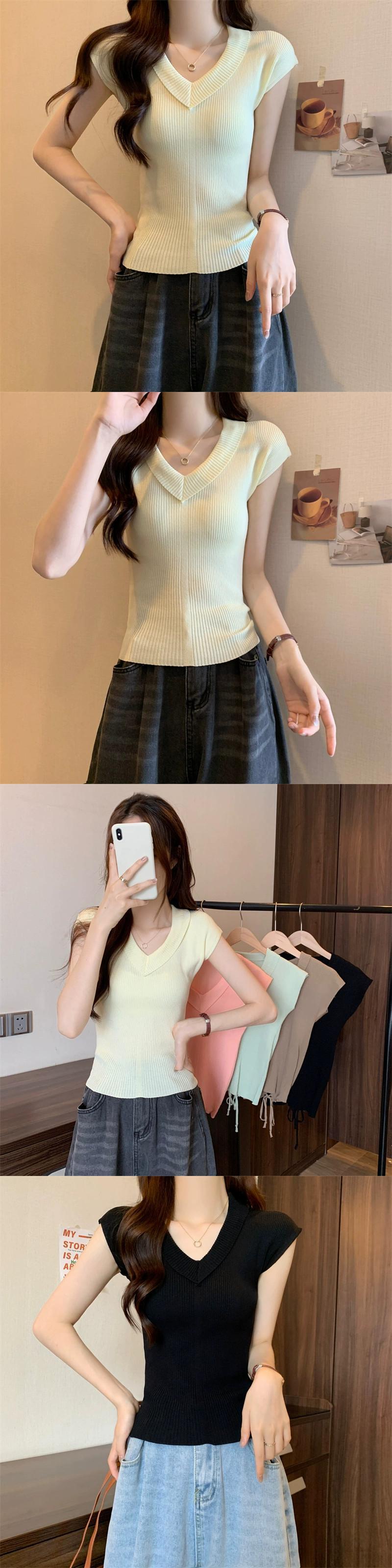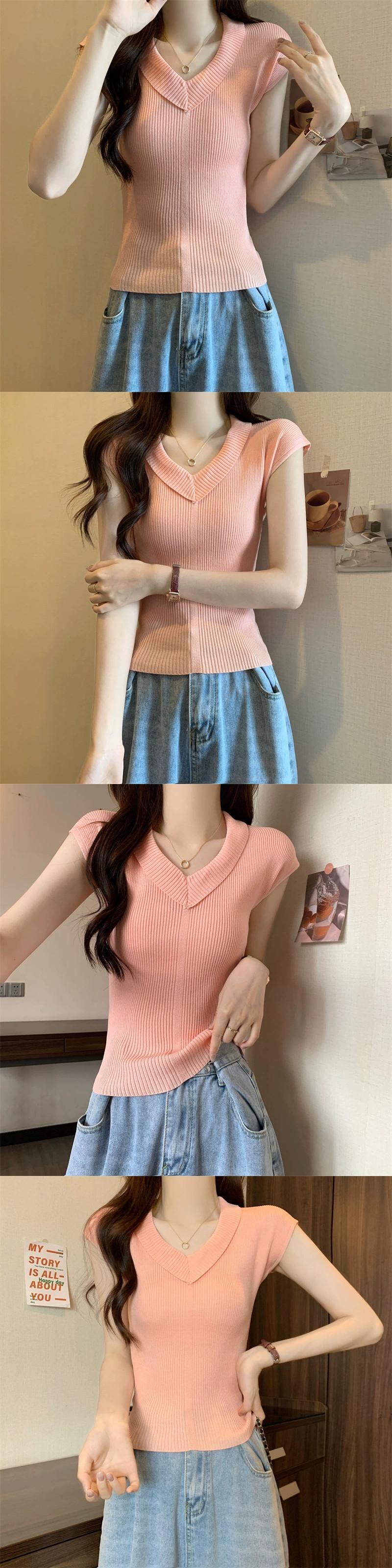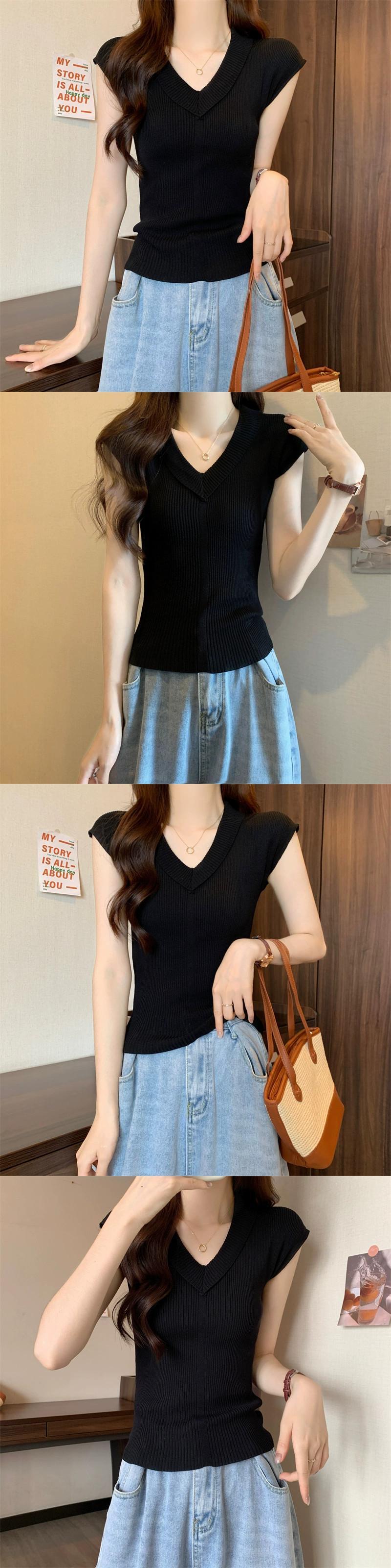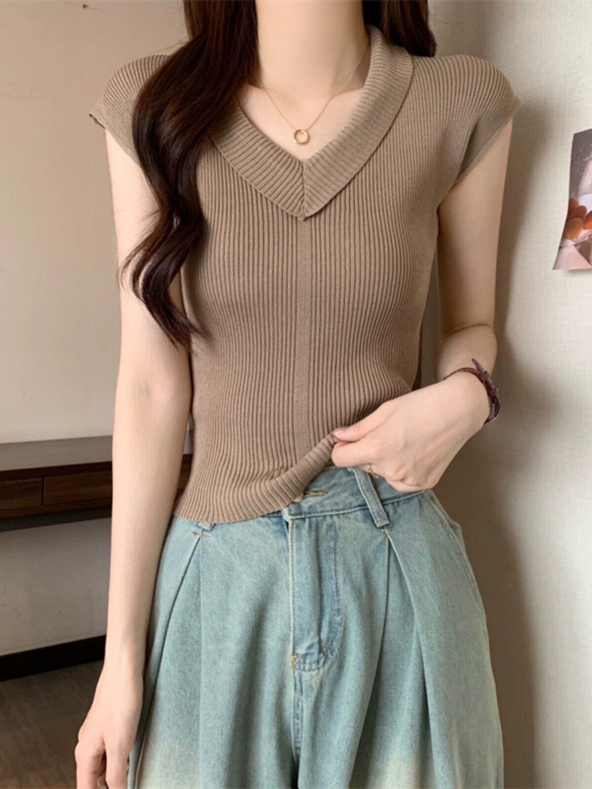 薄い氷のシルクニット半袖 Tシャツ女性の夏の 2023 新しいスリムフィットと多用途右肩ノースリーブ V ネックトップ サマー 夏物 Vネック 7460054667506679 | framboise21
