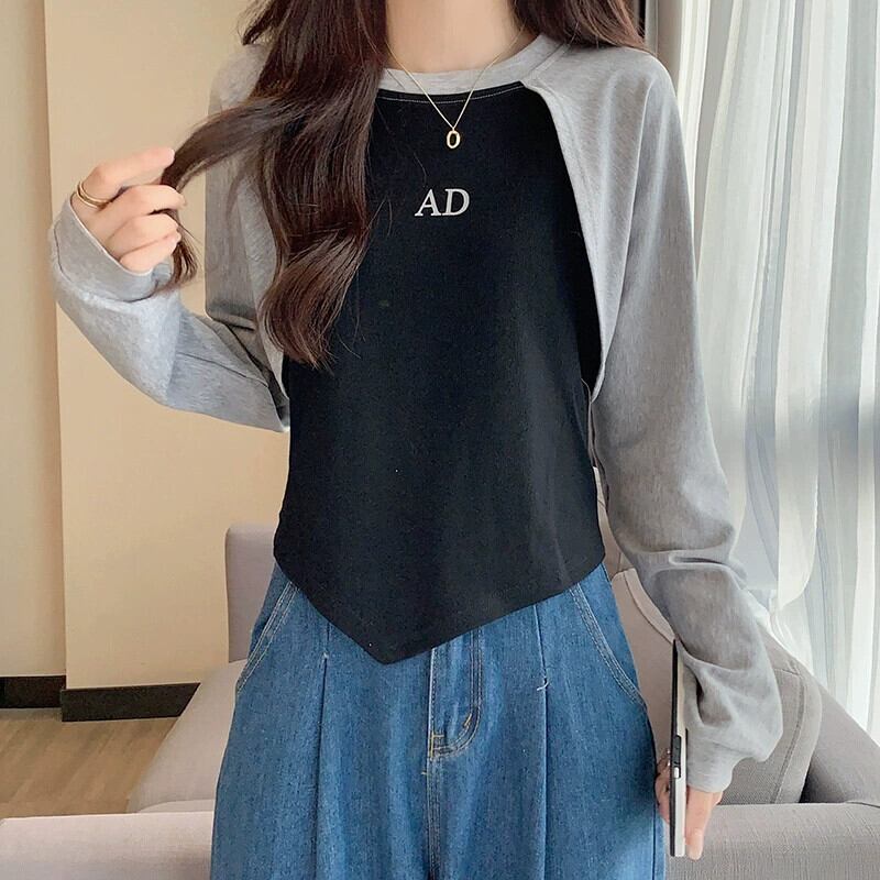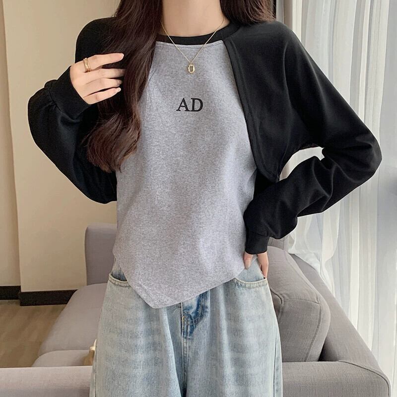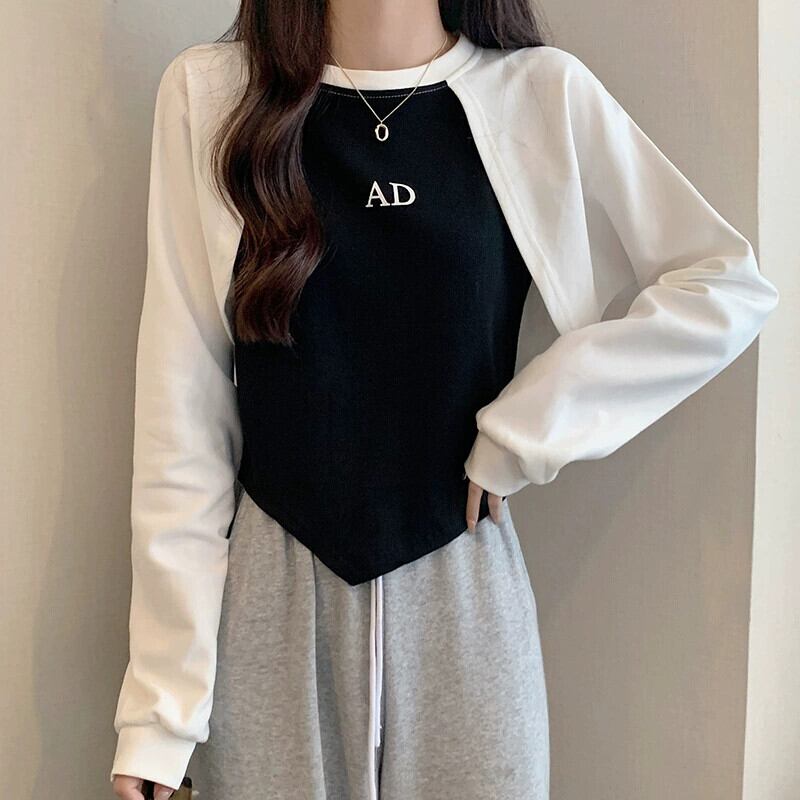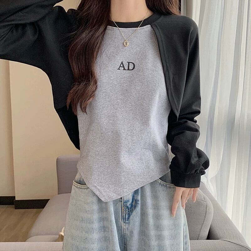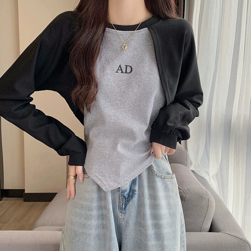 アメリカンショートフェイクツーピーススウェットシャツレディース、春と秋のファッショナブルなデザインニッチスリムフィット不規則なプルオーバー長袖トップ ロング スプリング 春物 オータム 秋物 7460060264536718 | framboise21