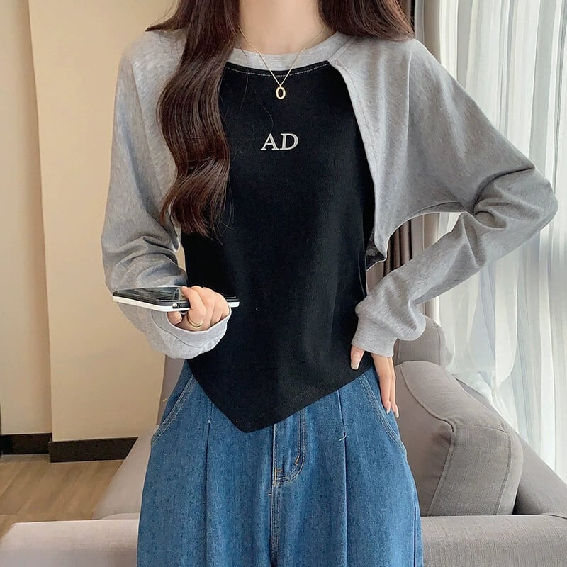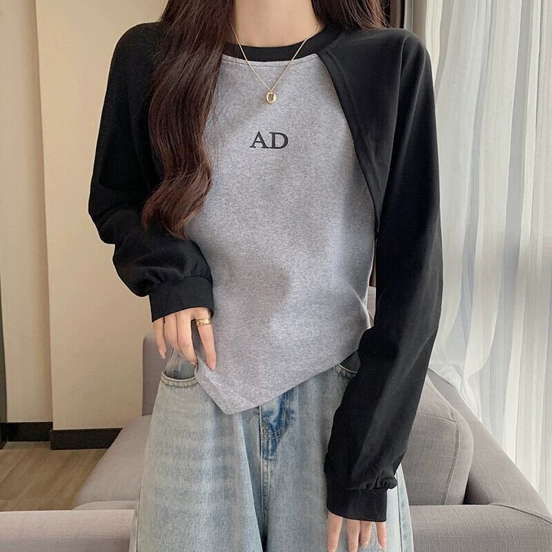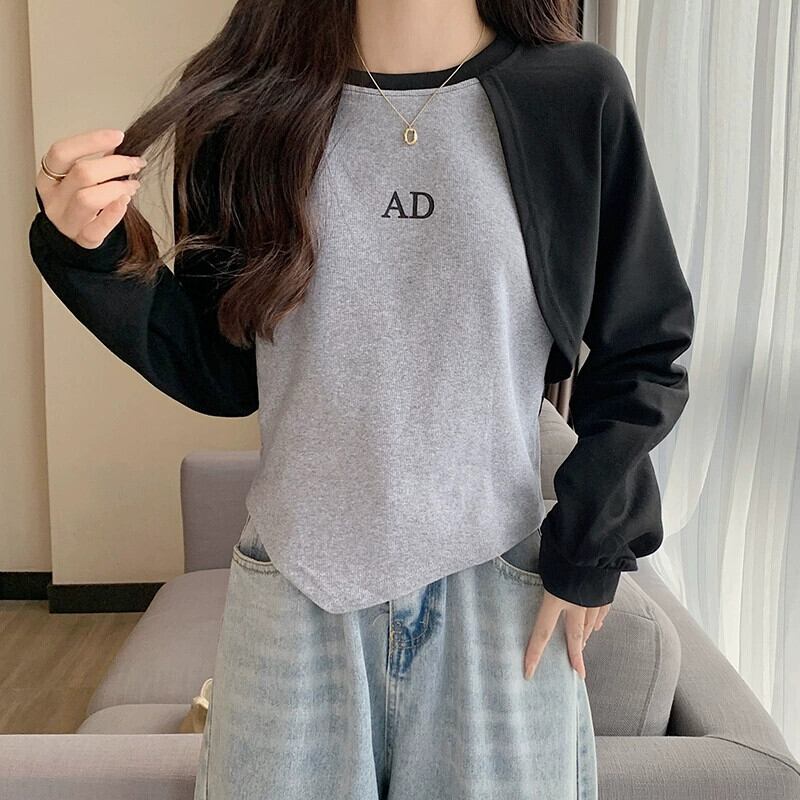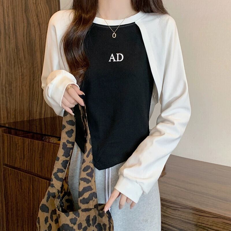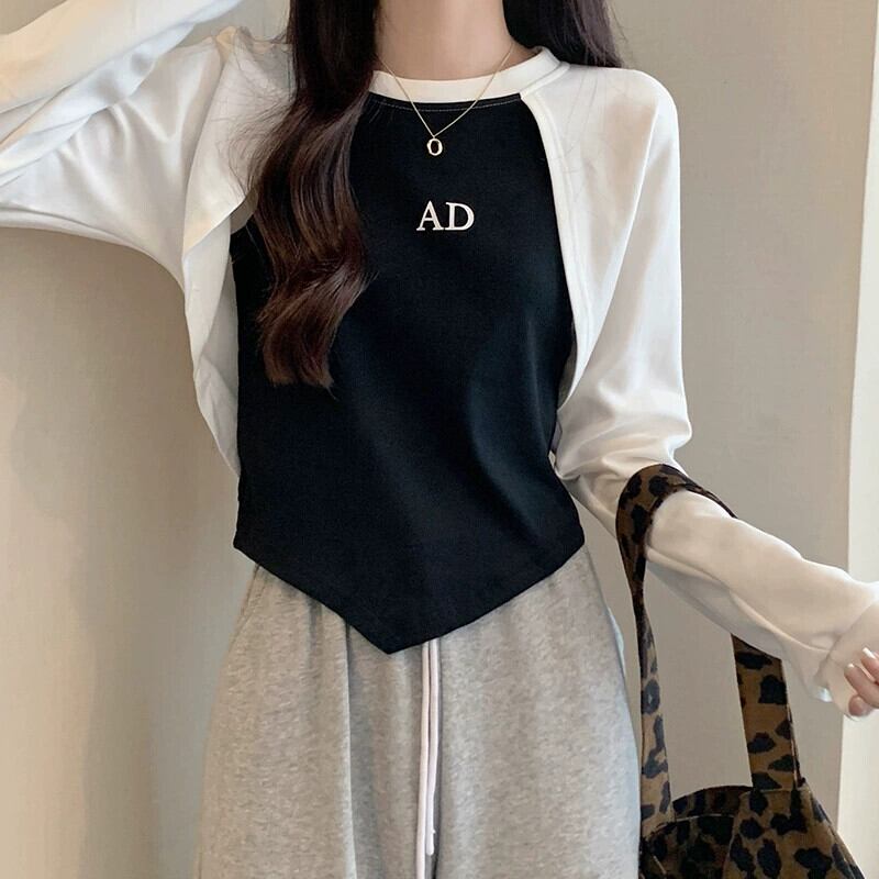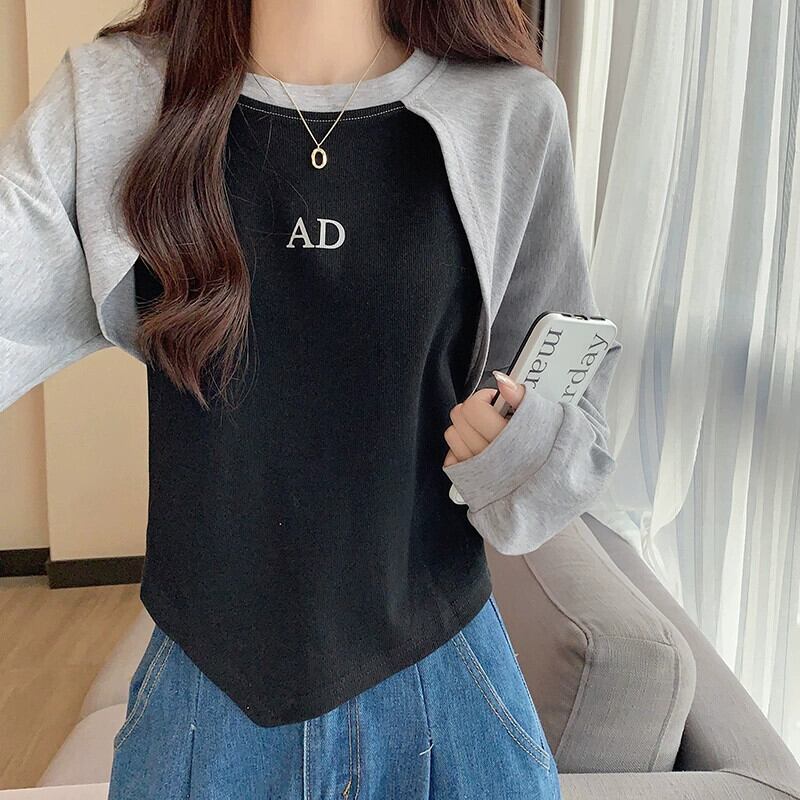 アメリカンショートフェイクツーピーススウェットシャツレディース、春と秋のファッショナブルなデザインニッチスリムフィット不規則なプルオーバー長袖トップ ロング スプリング 春物 オータム 秋物 7460060264536718 | framboise21