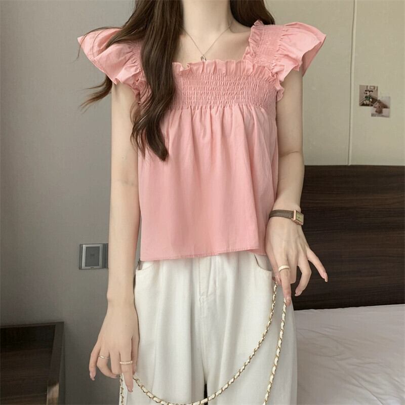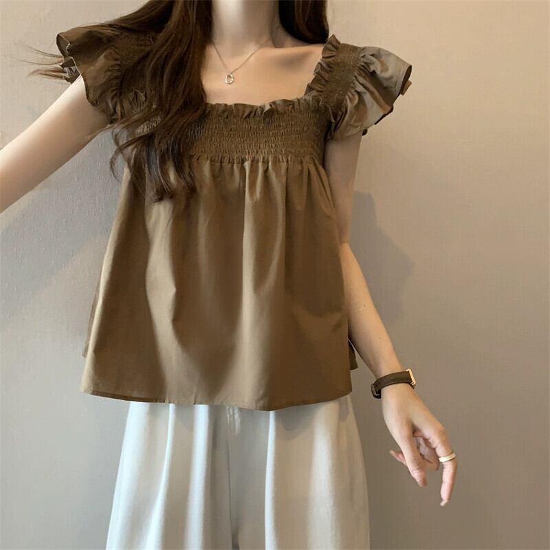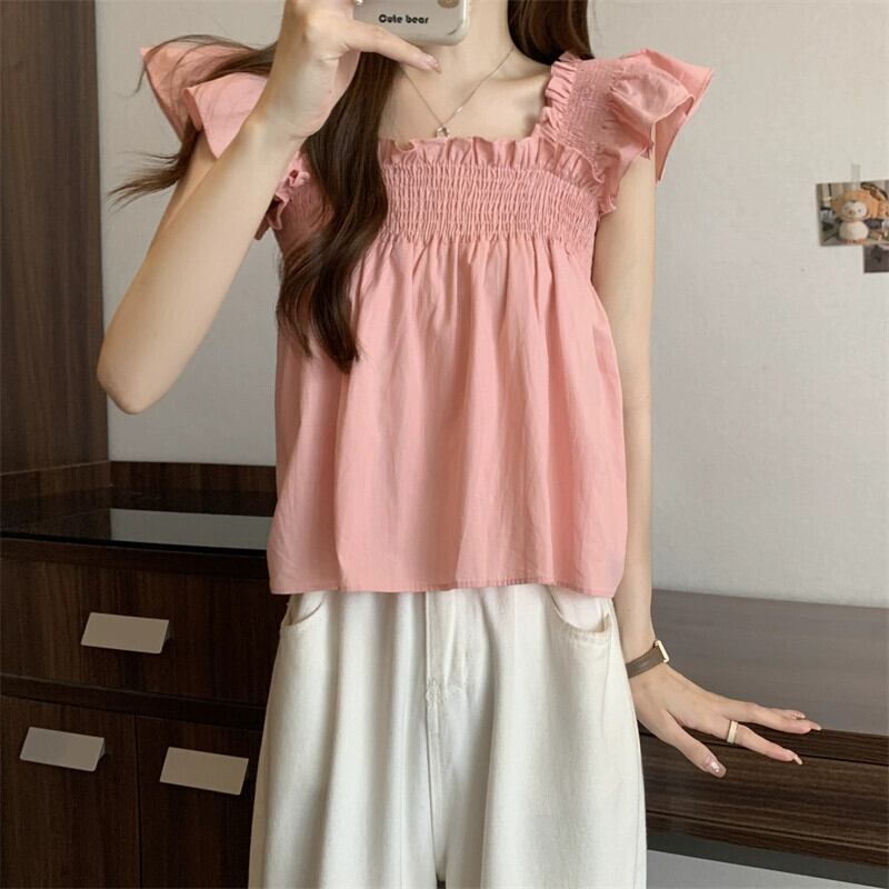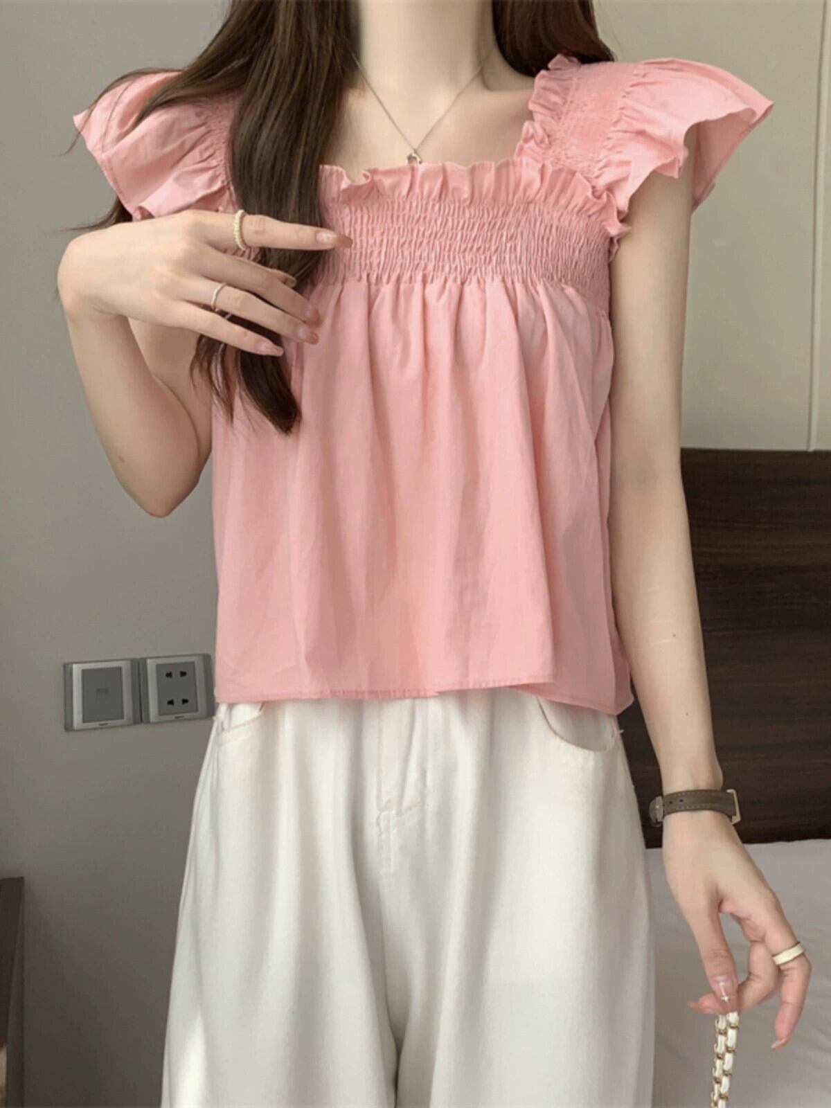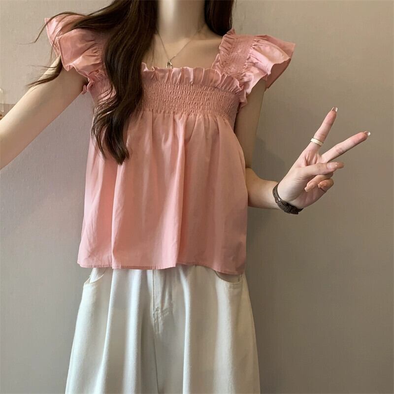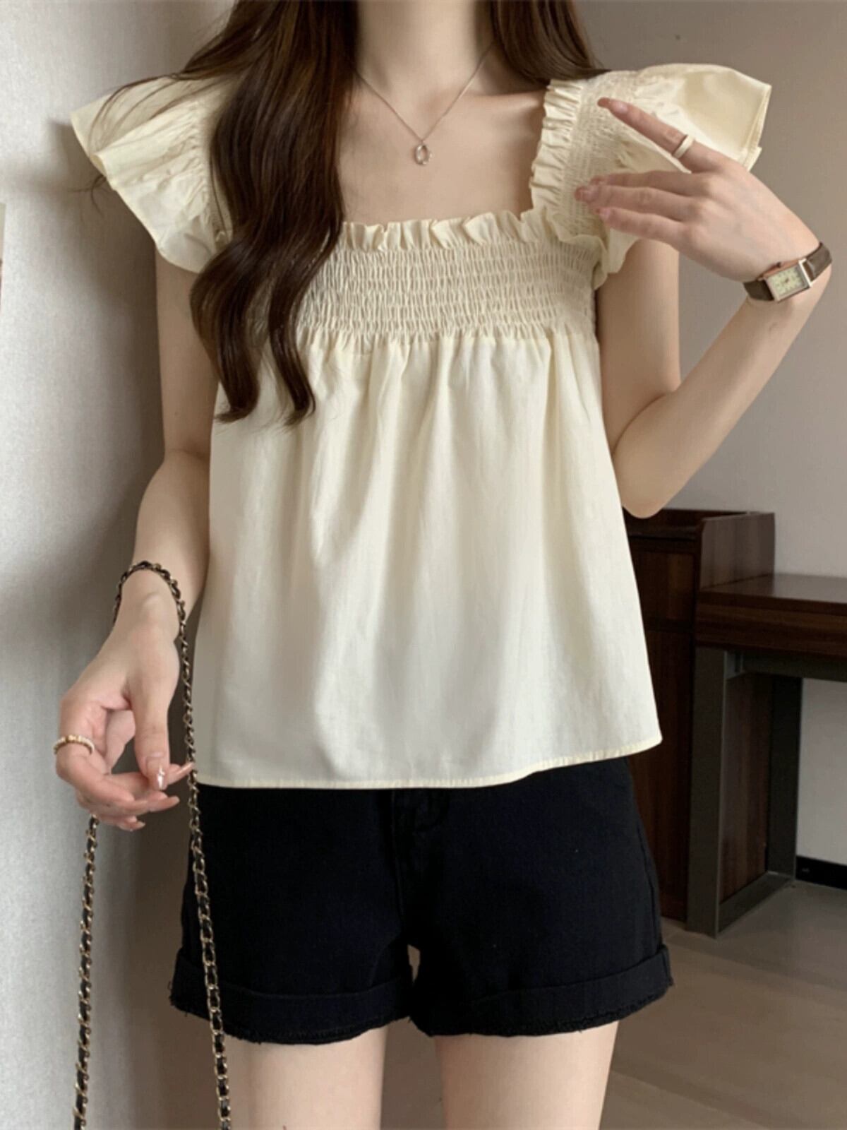 フリルノースリーブシャツ女性の夏のレトロな香港スタイルのシックなデザインのスクエアカラーショートベビードールトップと小さなフライングスリーブ サマー 夏物 スクウェア 7460078712571954 | framboise21
