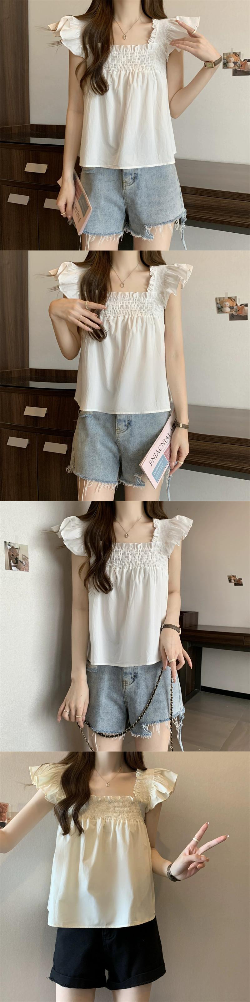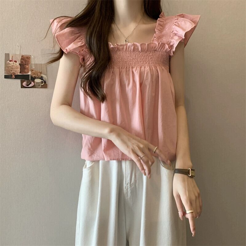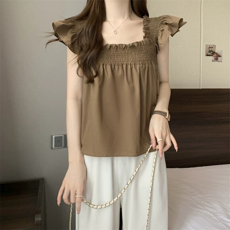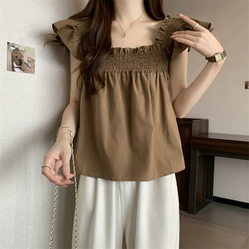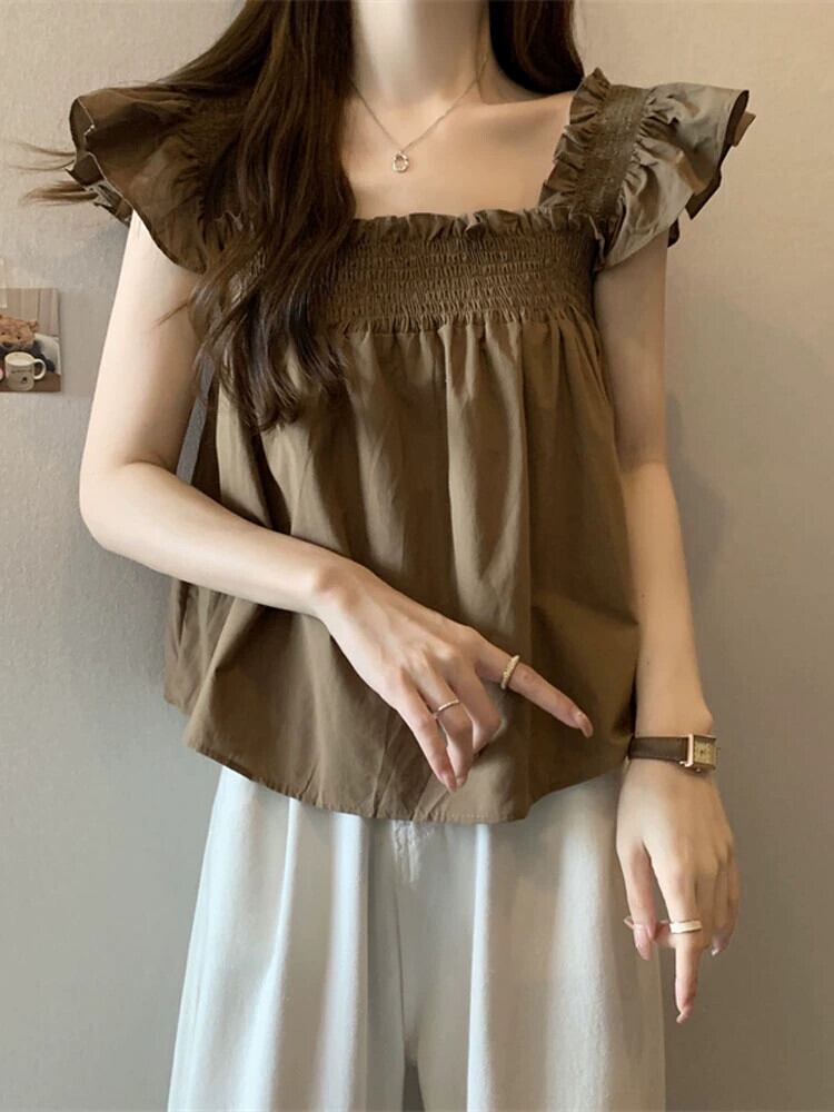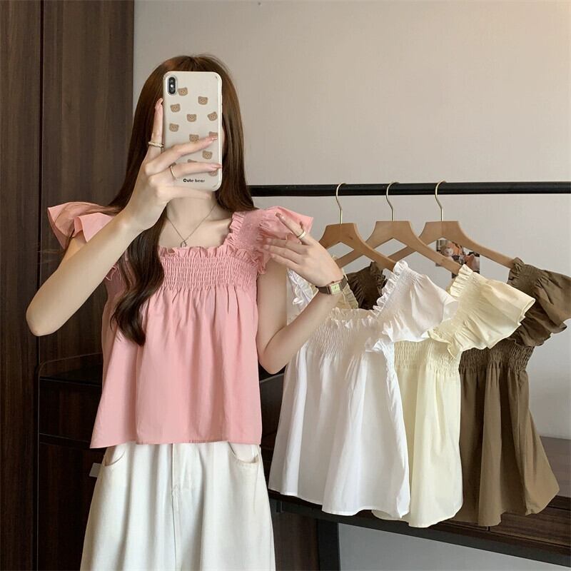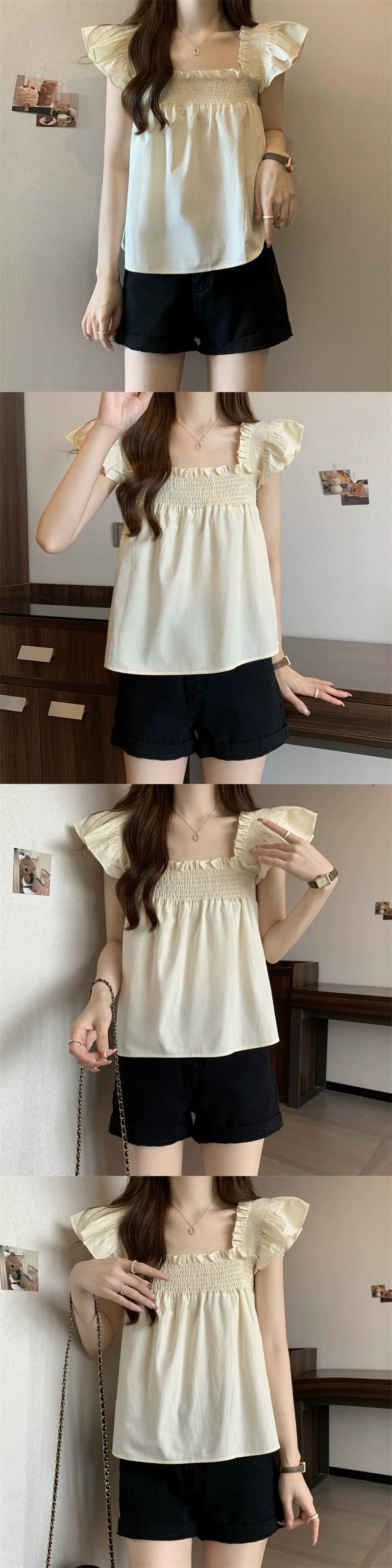 フリルノースリーブシャツ女性の夏のレトロな香港スタイルのシックなデザインのスクエアカラーショートベビードールトップと小さなフライングスリーブ サマー 夏物 スクウェア 7460078712571954 | framboise21