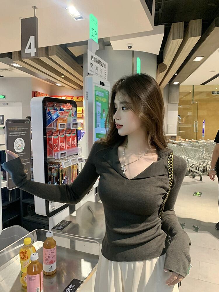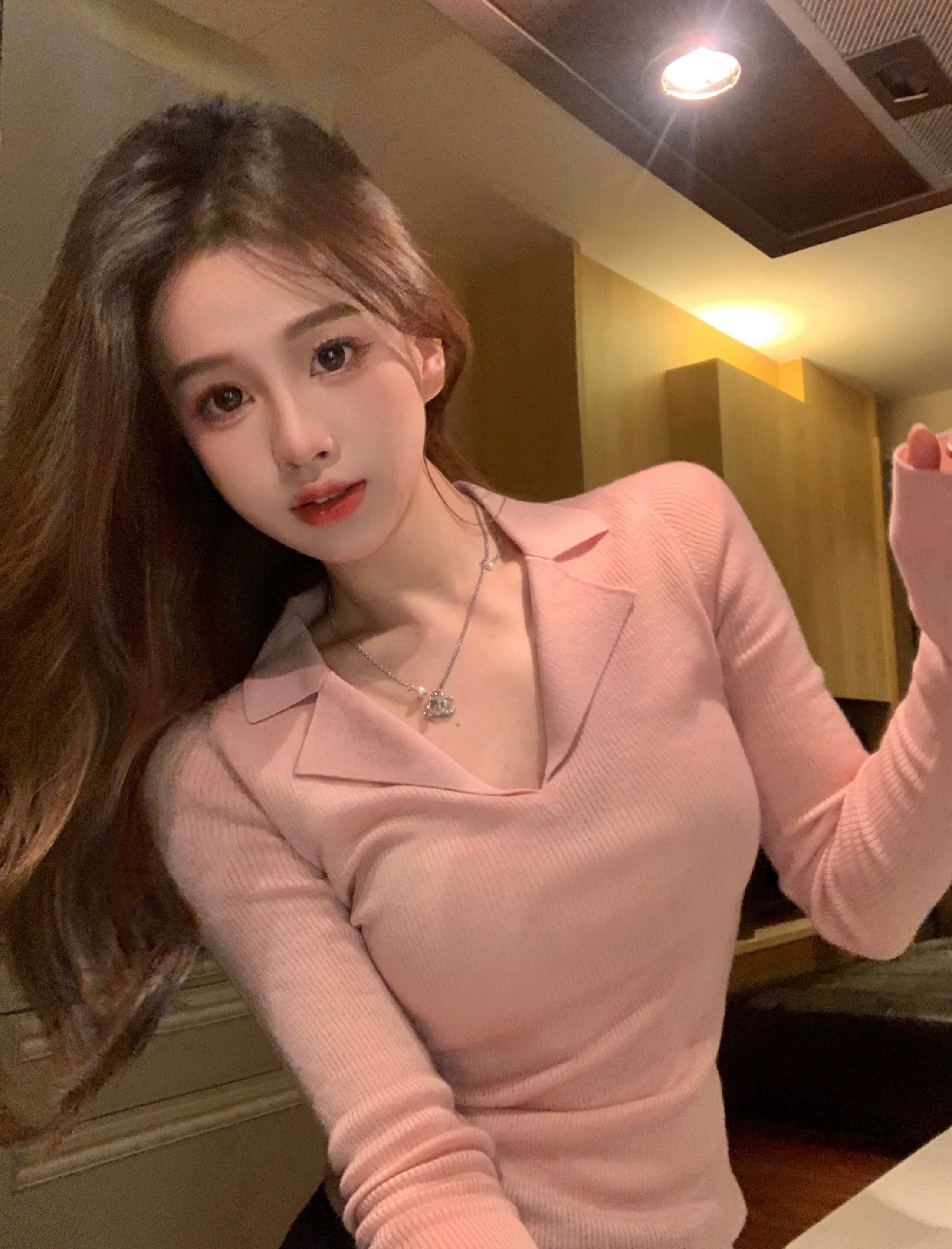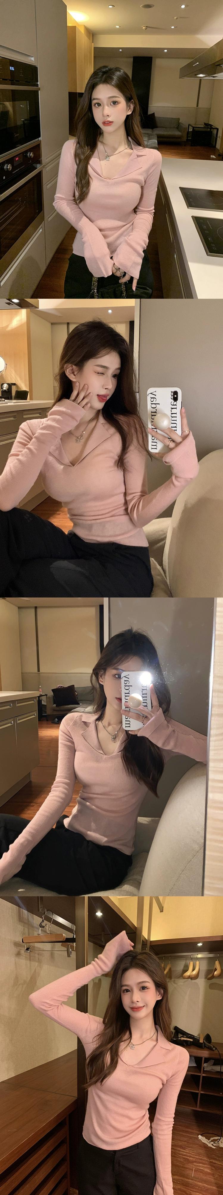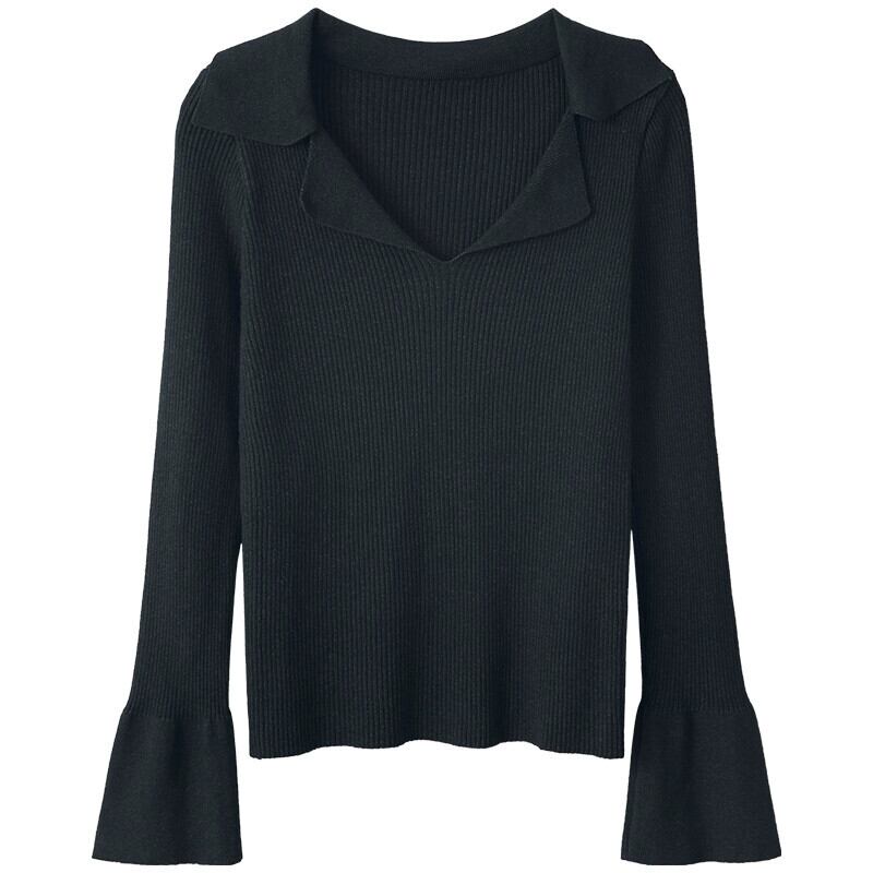ポロカラーボトリングシャツ女性の秋と冬のファッショナブルなファッショナブルなスタイルのインナーニットセータースリムVネック長袖トップブラック ロング オータム 秋物 ウィンター 冬物 7460040747118035 | framboise21