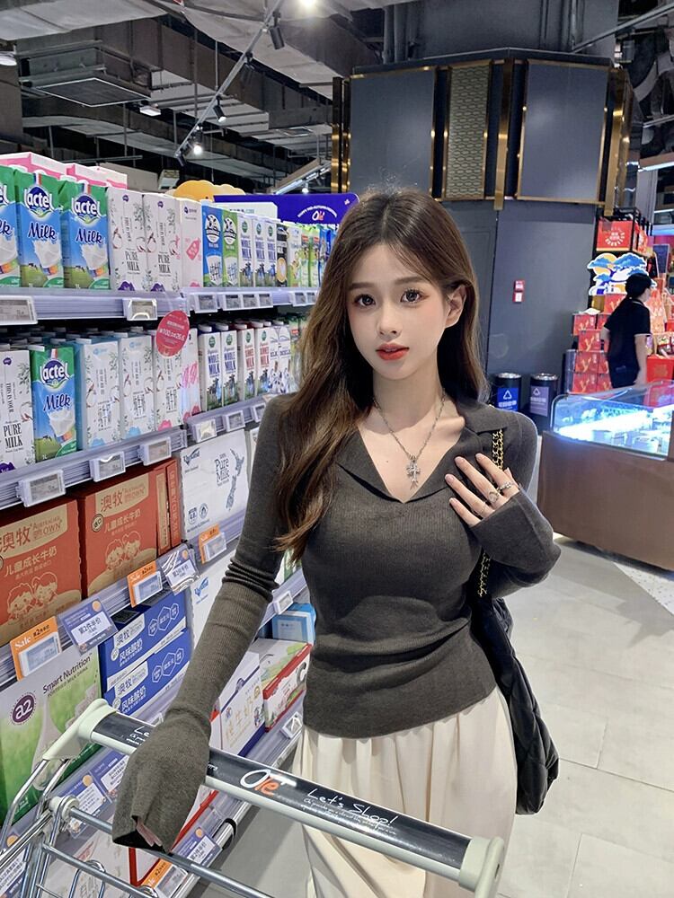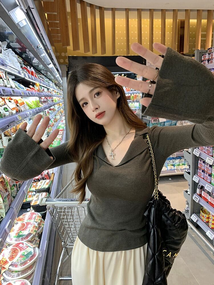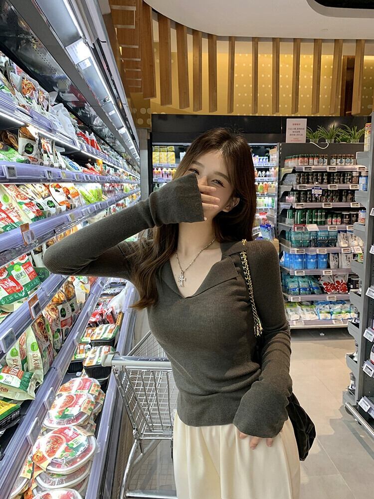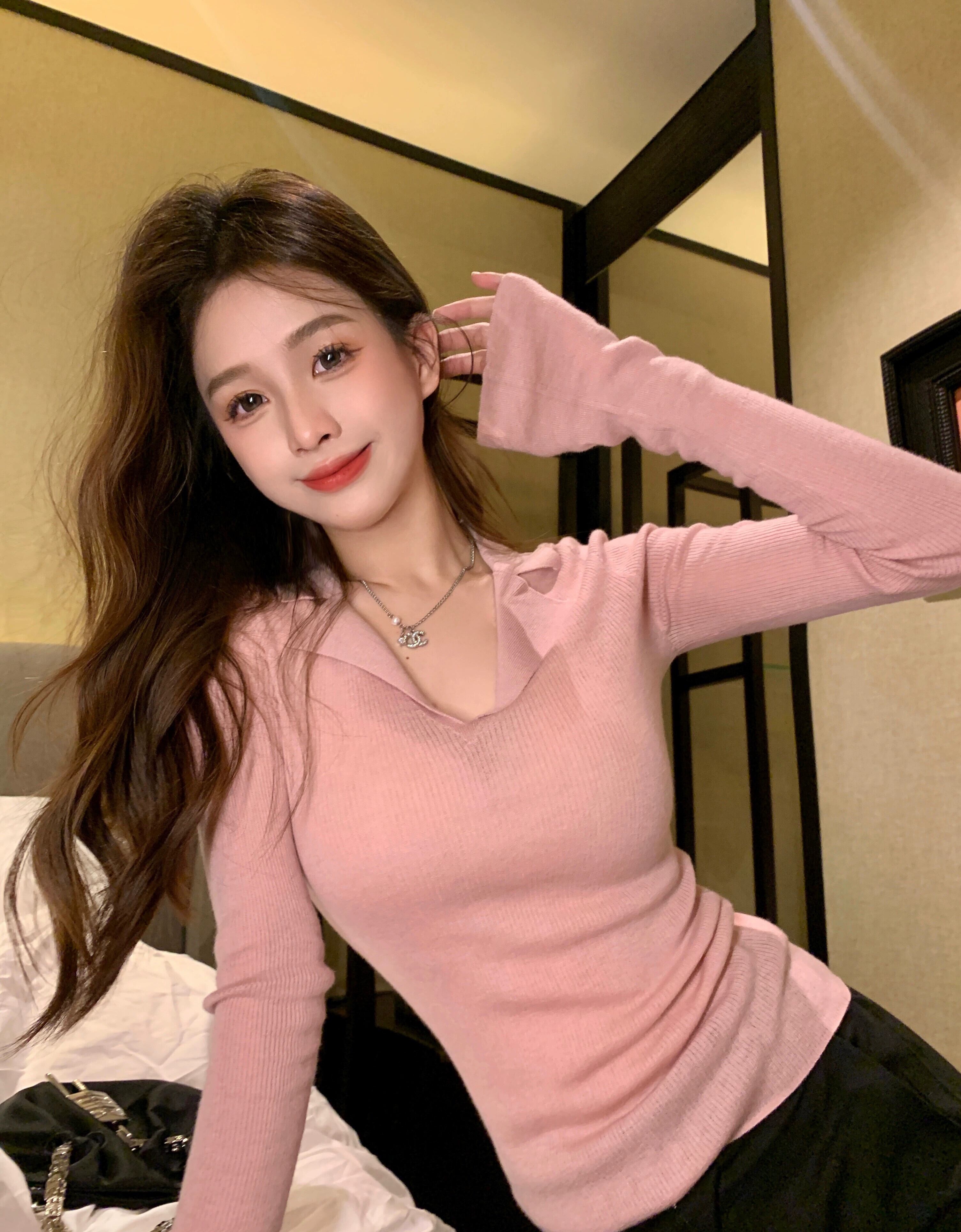 ポロカラーボトリングシャツ女性の秋と冬のファッショナブルなファッショナブルなスタイルのインナーニットセータースリムVネック長袖トップブラック ロング オータム 秋物 ウィンター 冬物 7460040747118035 | framboise21