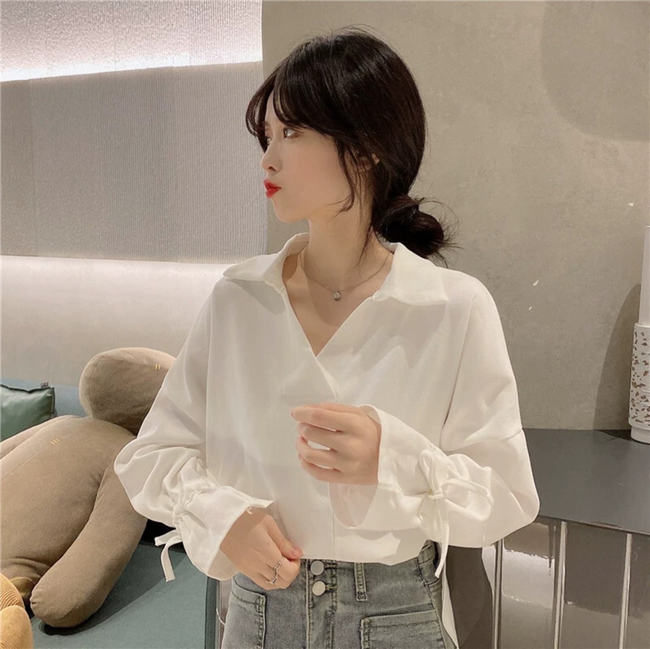 白いVネック長袖シャツの女性、2023年春と秋の新しいファッションデザイン、ゆったりとした多用途のパフスリーブトップ ロング ホワイト スプリング 春物 オータム 秋物 746008159990513