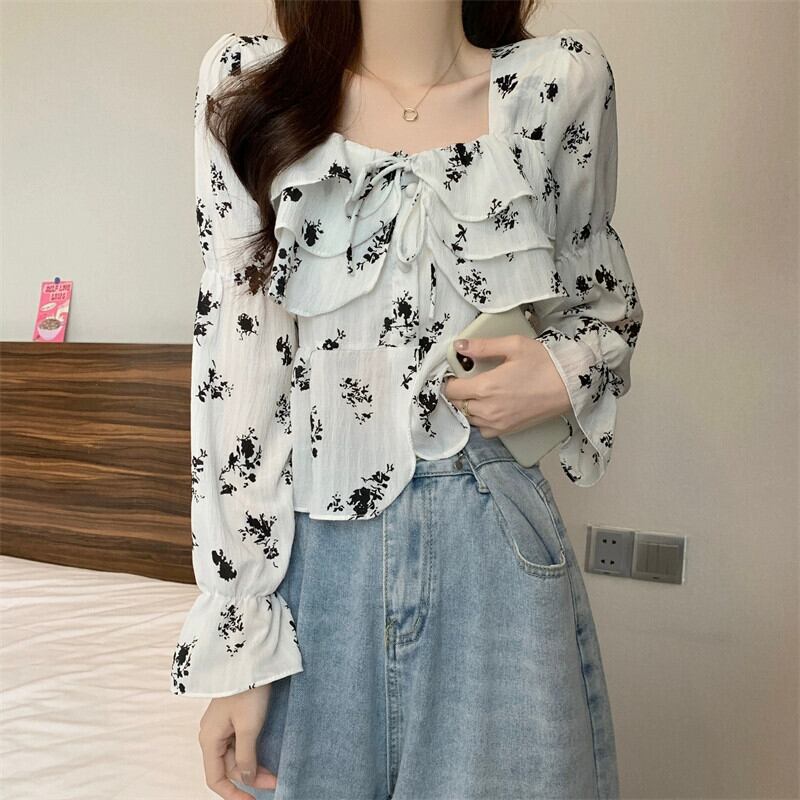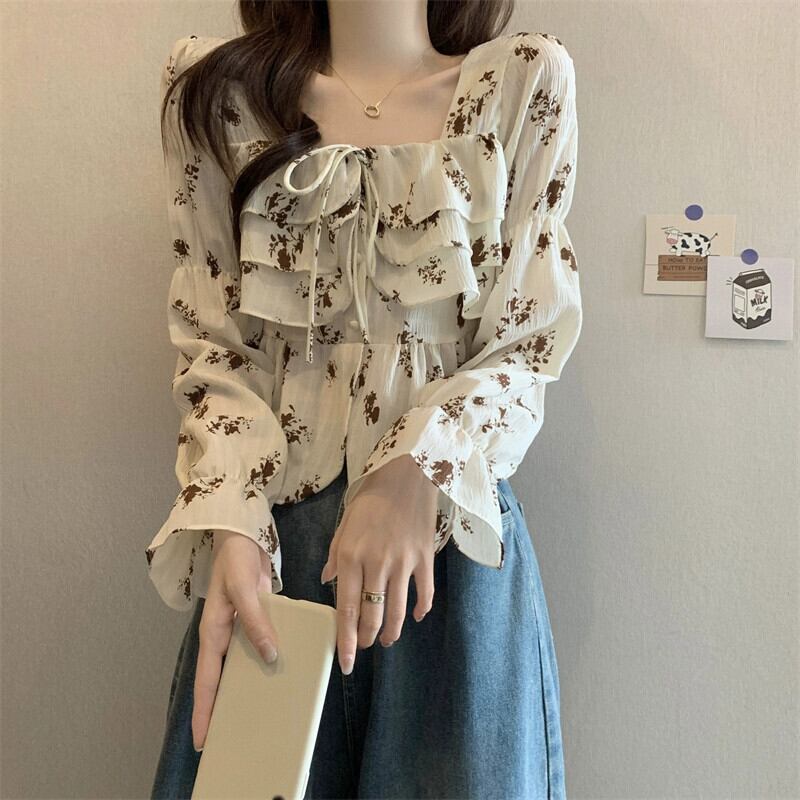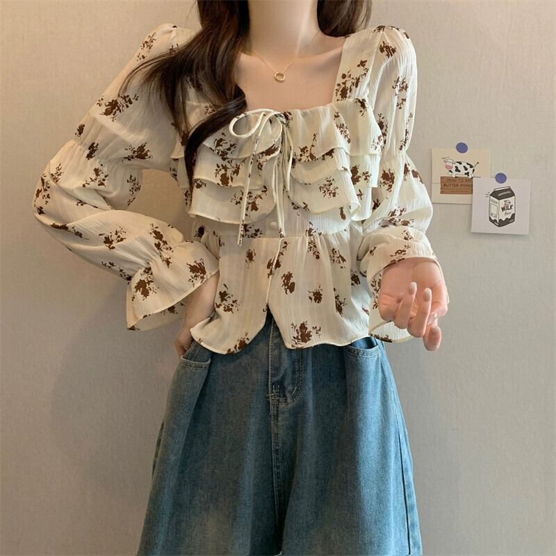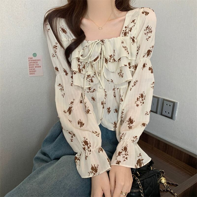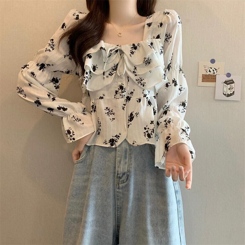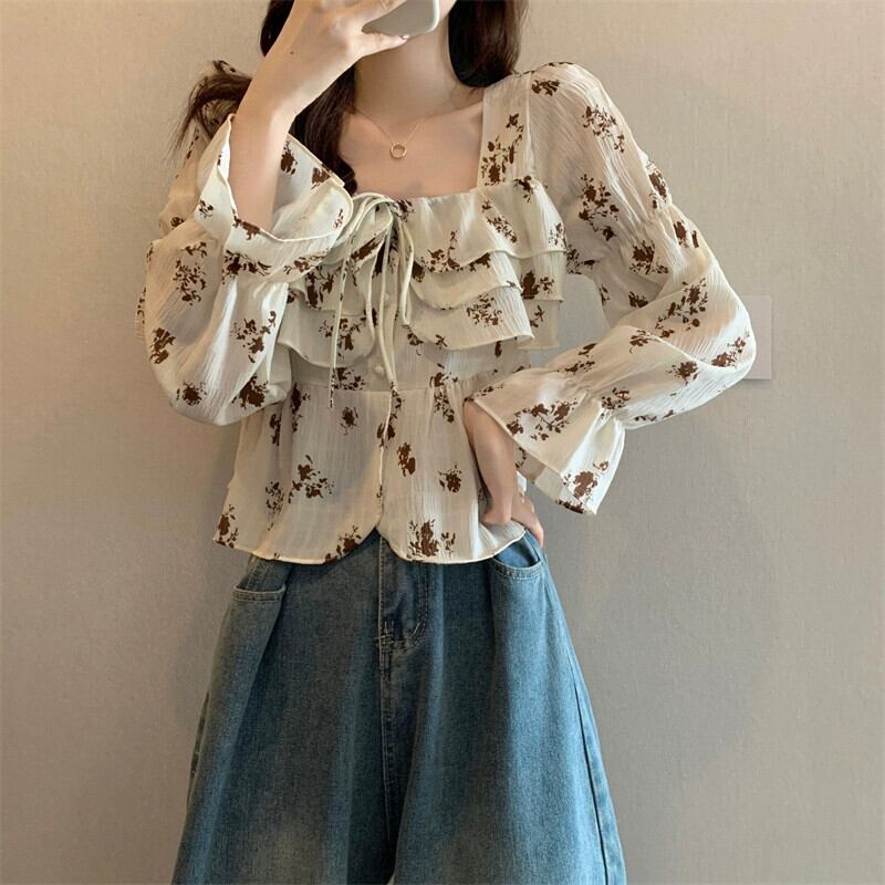 フリル花柄シャツレディース 2023 春秋新作フレンチデザインシックなショートスクエアカラー長袖トップ ロング スプリング 春物 オータム 秋物 スクウェア 746009726627436 | framboise21