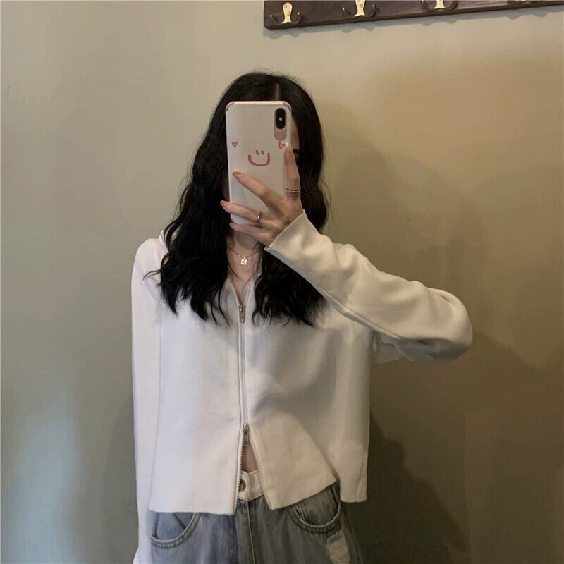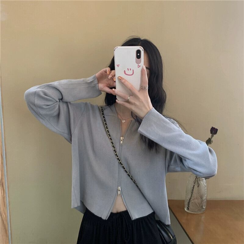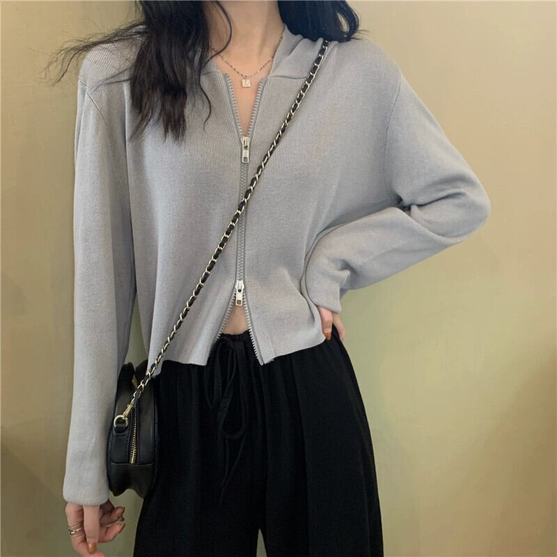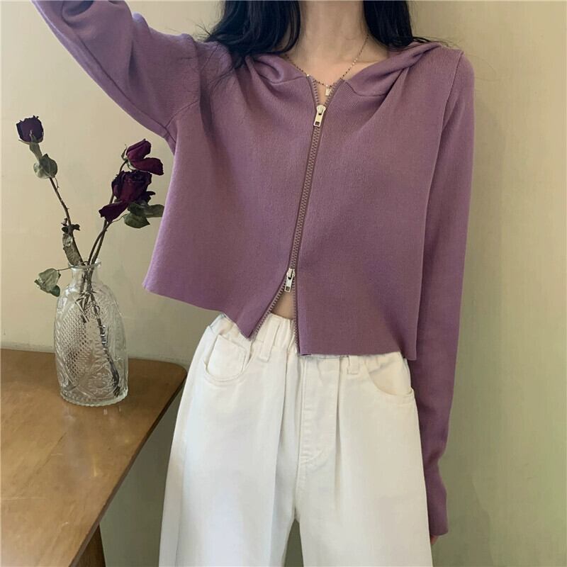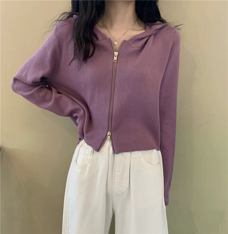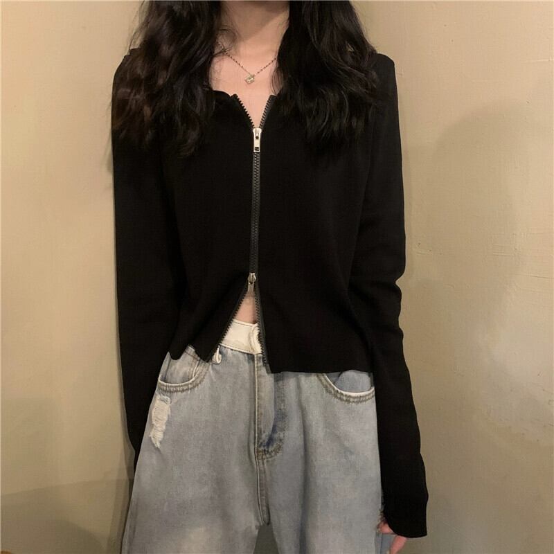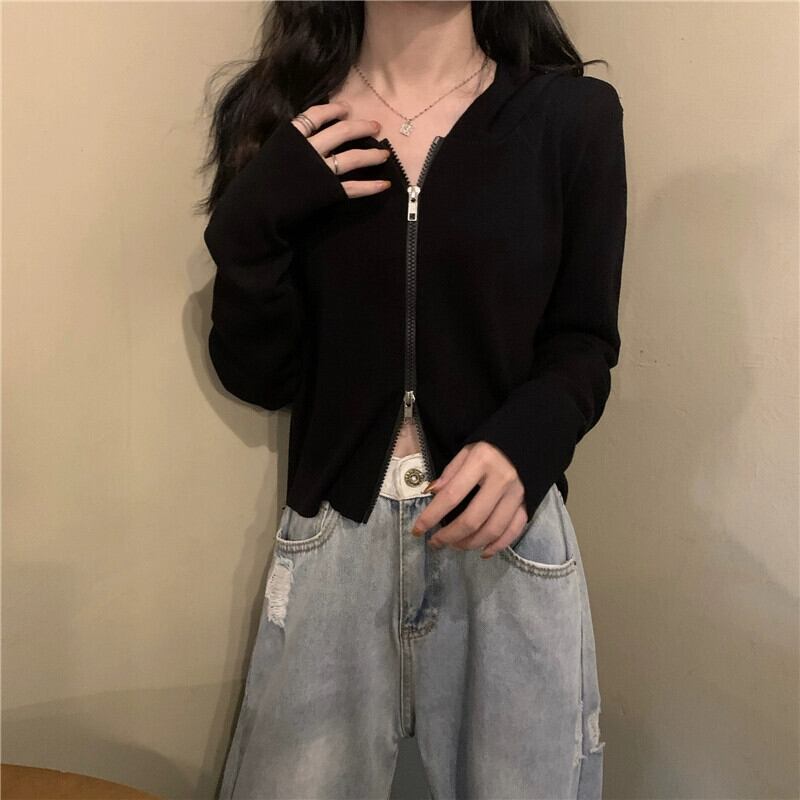 ダブルジッパーショートフード付きニットカーディガンジャケット女性春と秋フレンチスタイルルーズアウター黒長袖トップ ロング ブラック スプリング 春物 オータム 秋物 7460081976334748 | framboise21