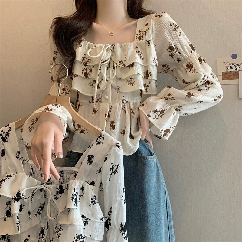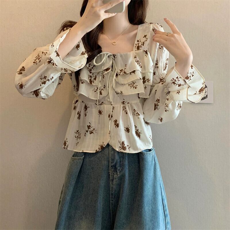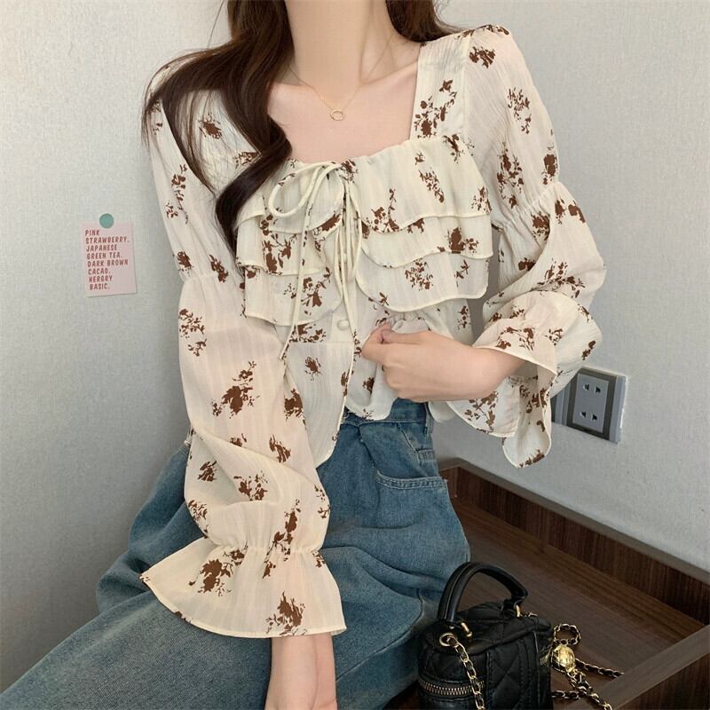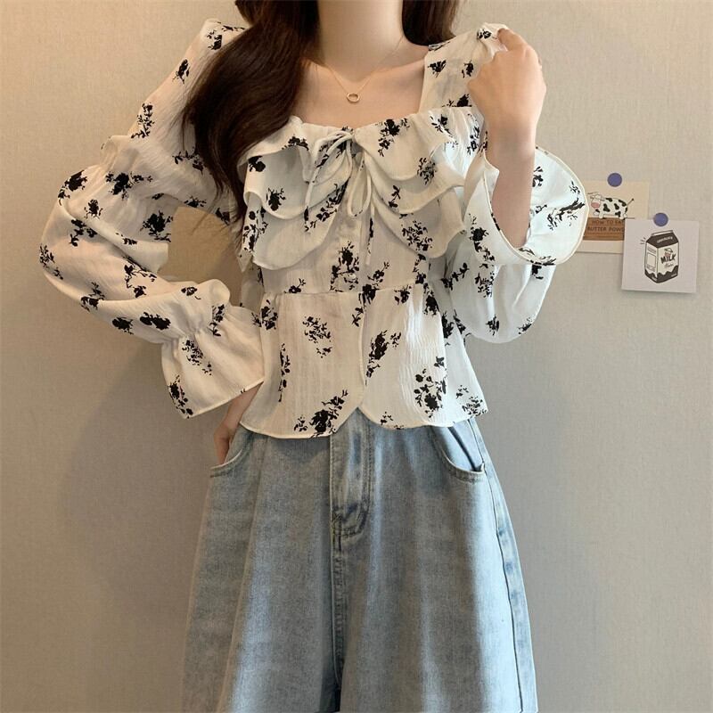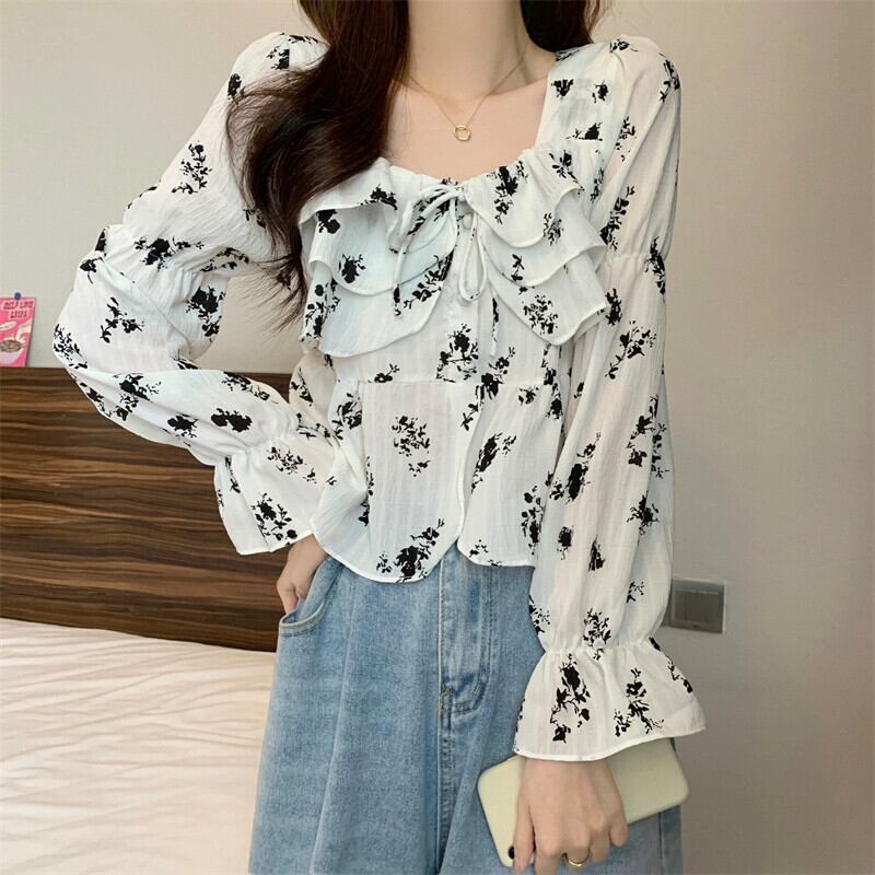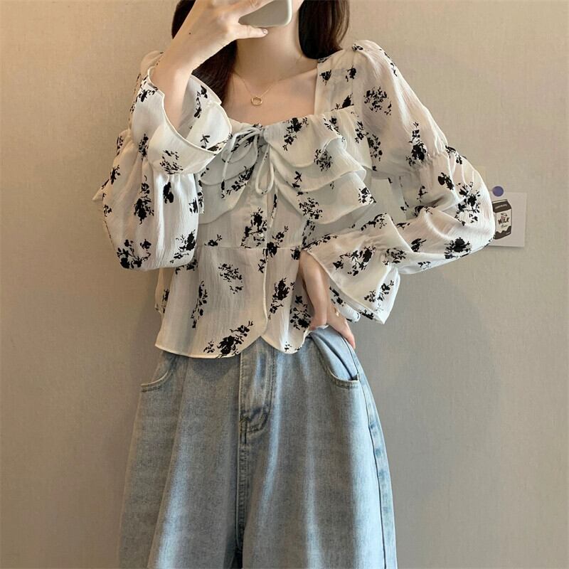 ショート花柄スプライシングフリルシャツレディース、春と秋のフレンチデザイン、ゆったりとしたベルスリーブ、スクエアネック長袖トップ ロング スプリング 春物 オータム 秋物 スクウェア 7460069009883264 | framboise21