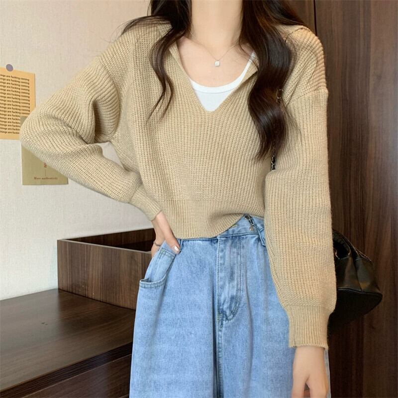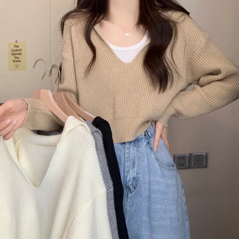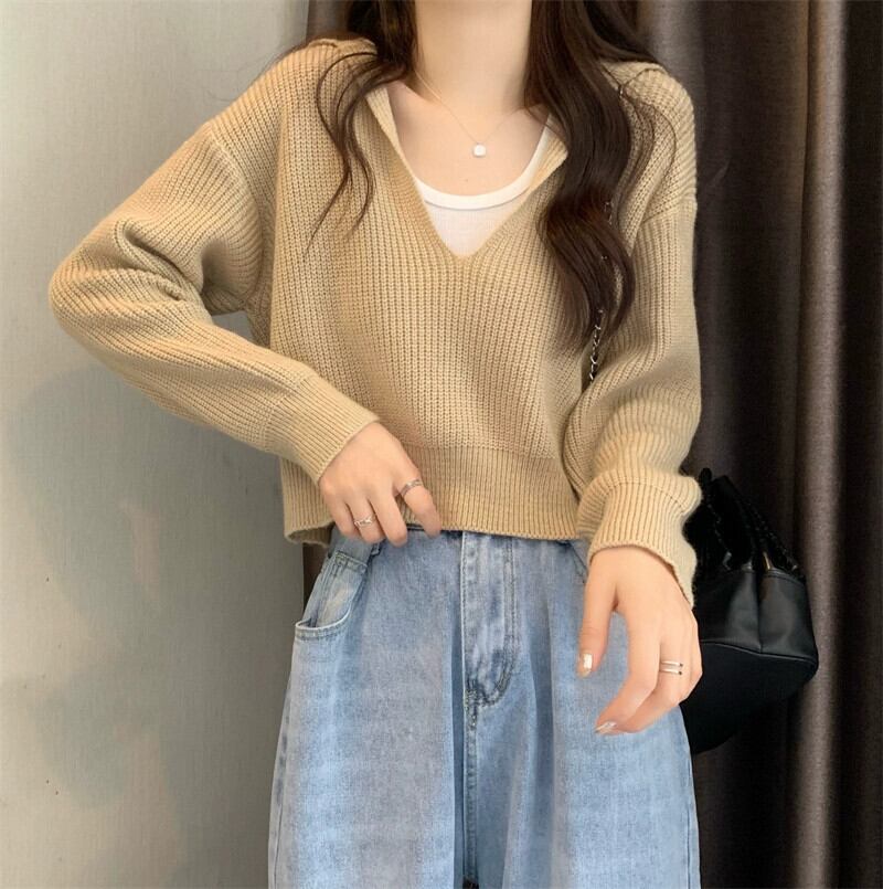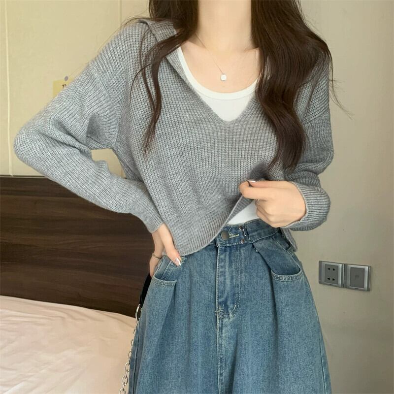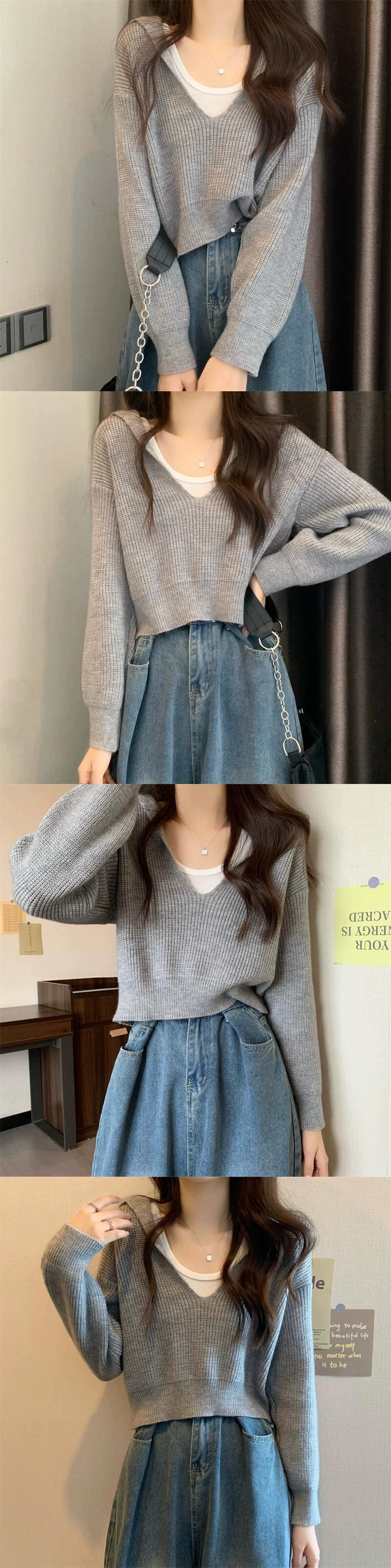 春と秋のグレーのショート V ネックセーター女性、ゆったりと怠惰、スリムで小さい、長袖プルオーバーセーター ロング スプリング 春物 オータム 秋物 Vネック 7460069395073052 | framboise21